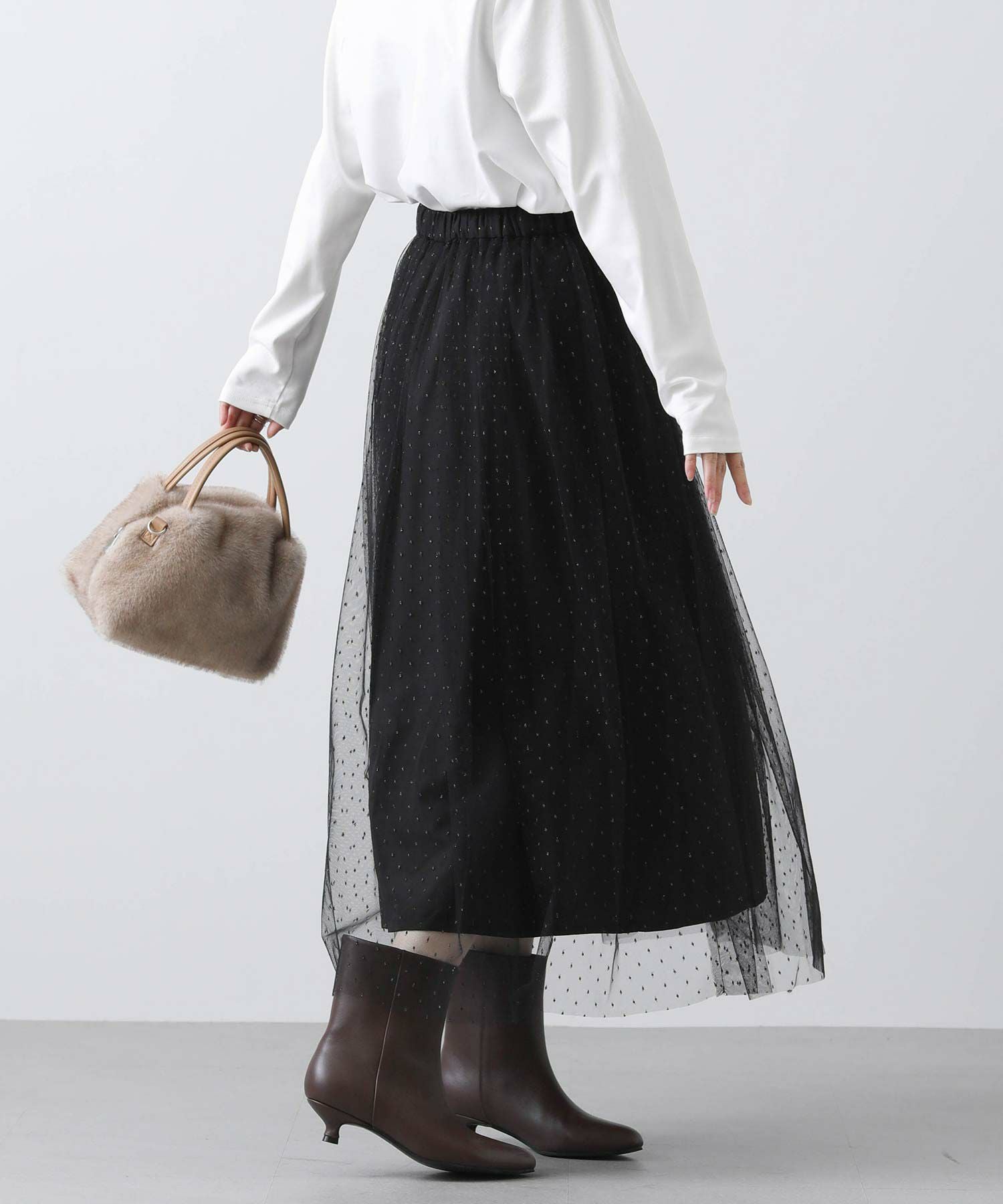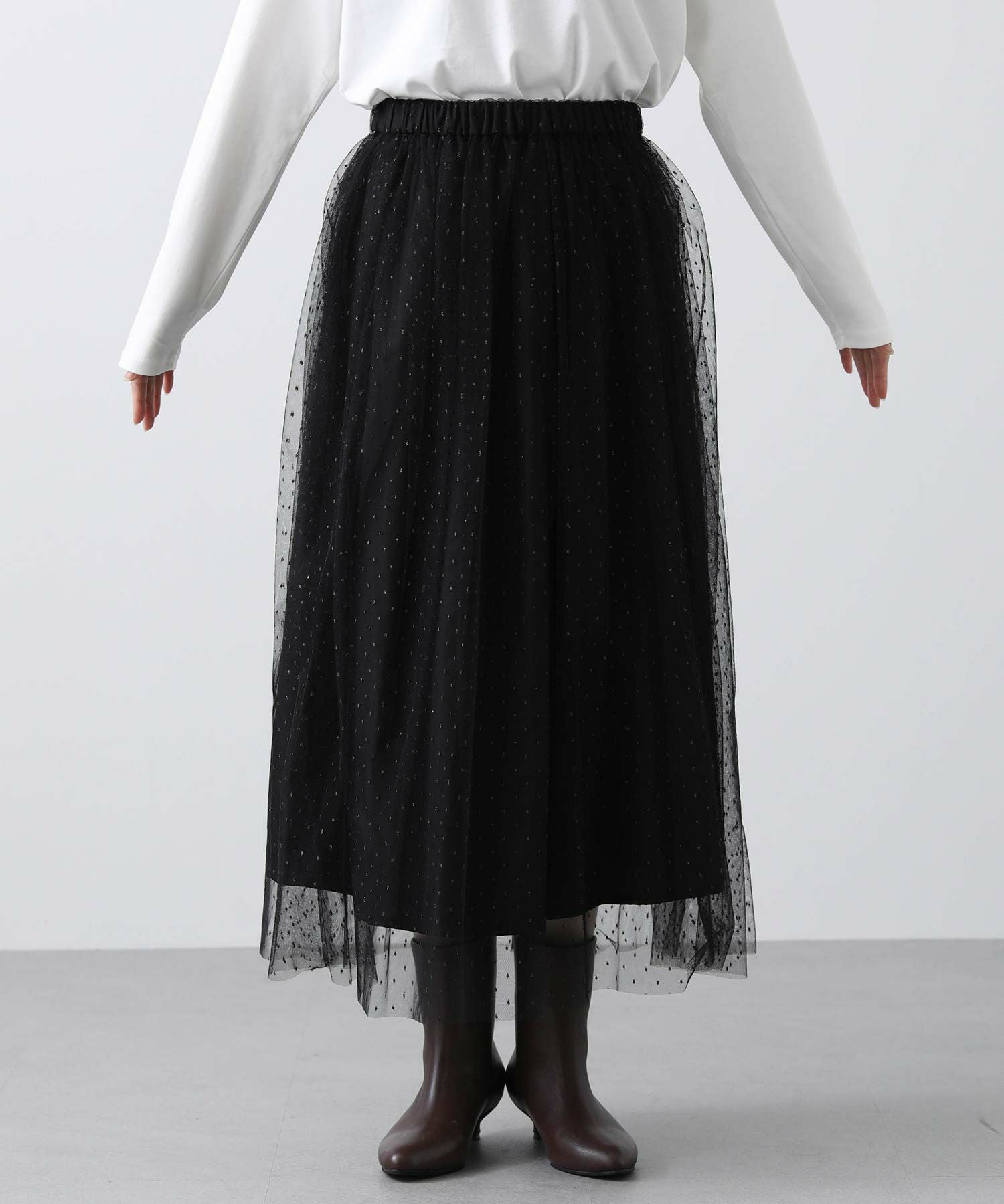 チュールスカートをデニムやスラックスに重ねたりと今年らしいレイヤードボトムのスタイリングでも楽しめます。
