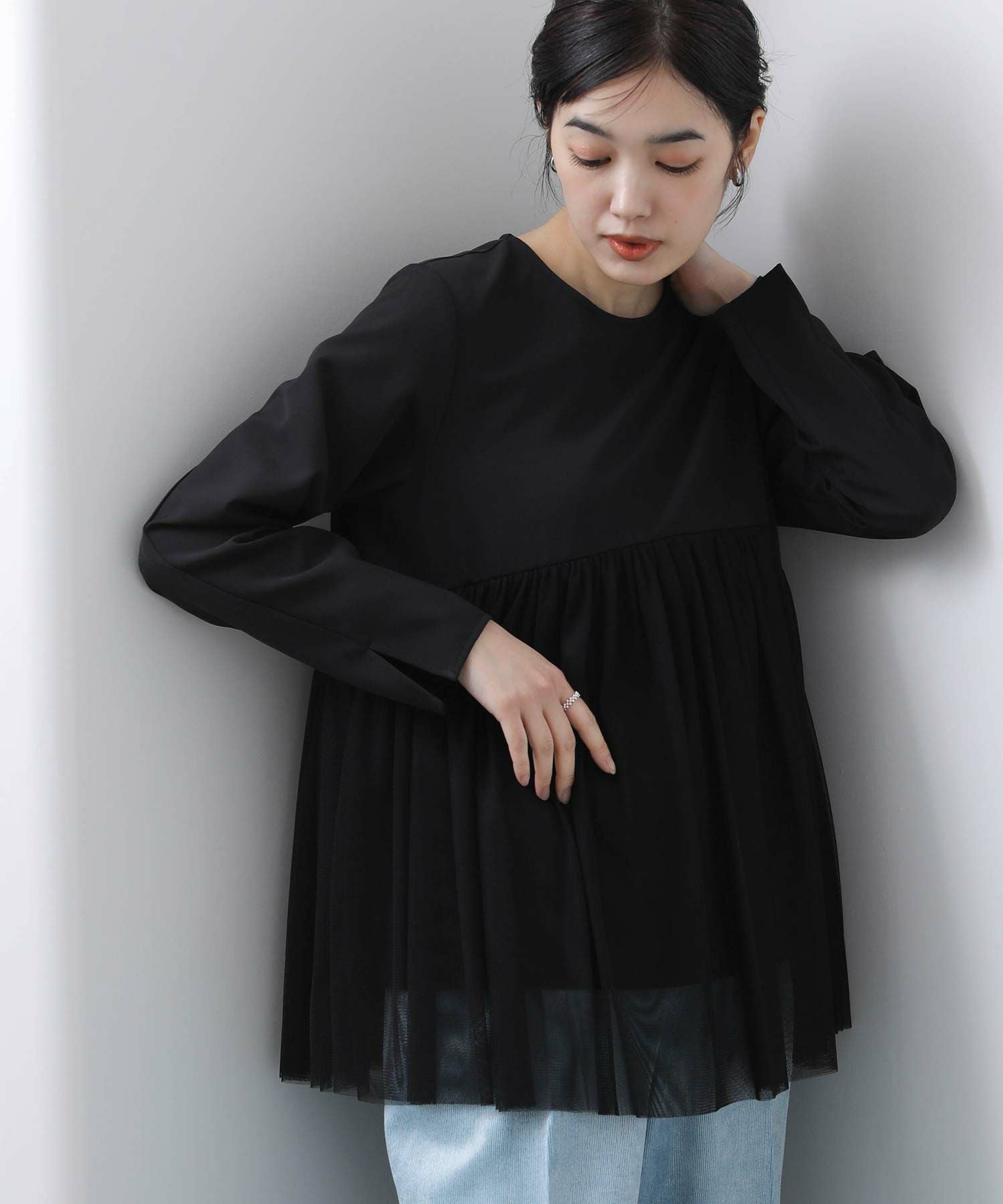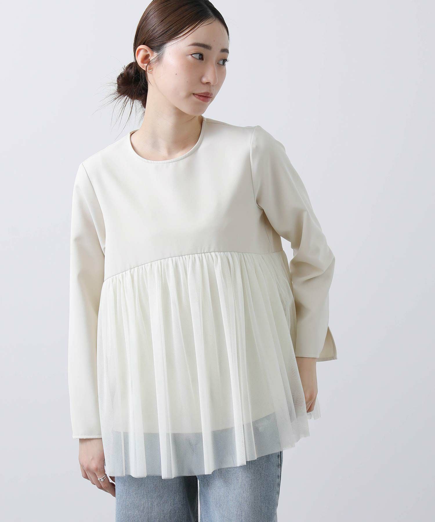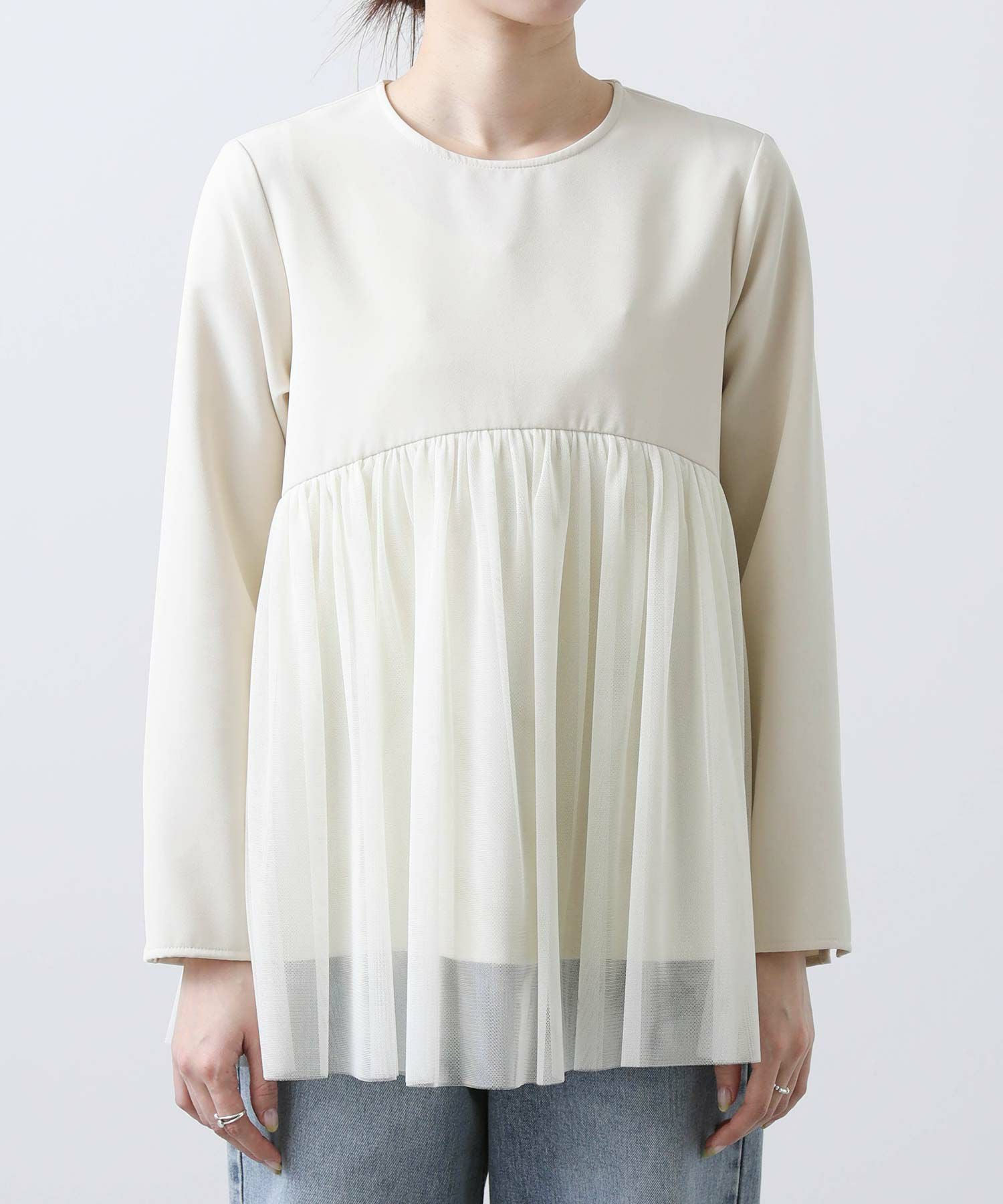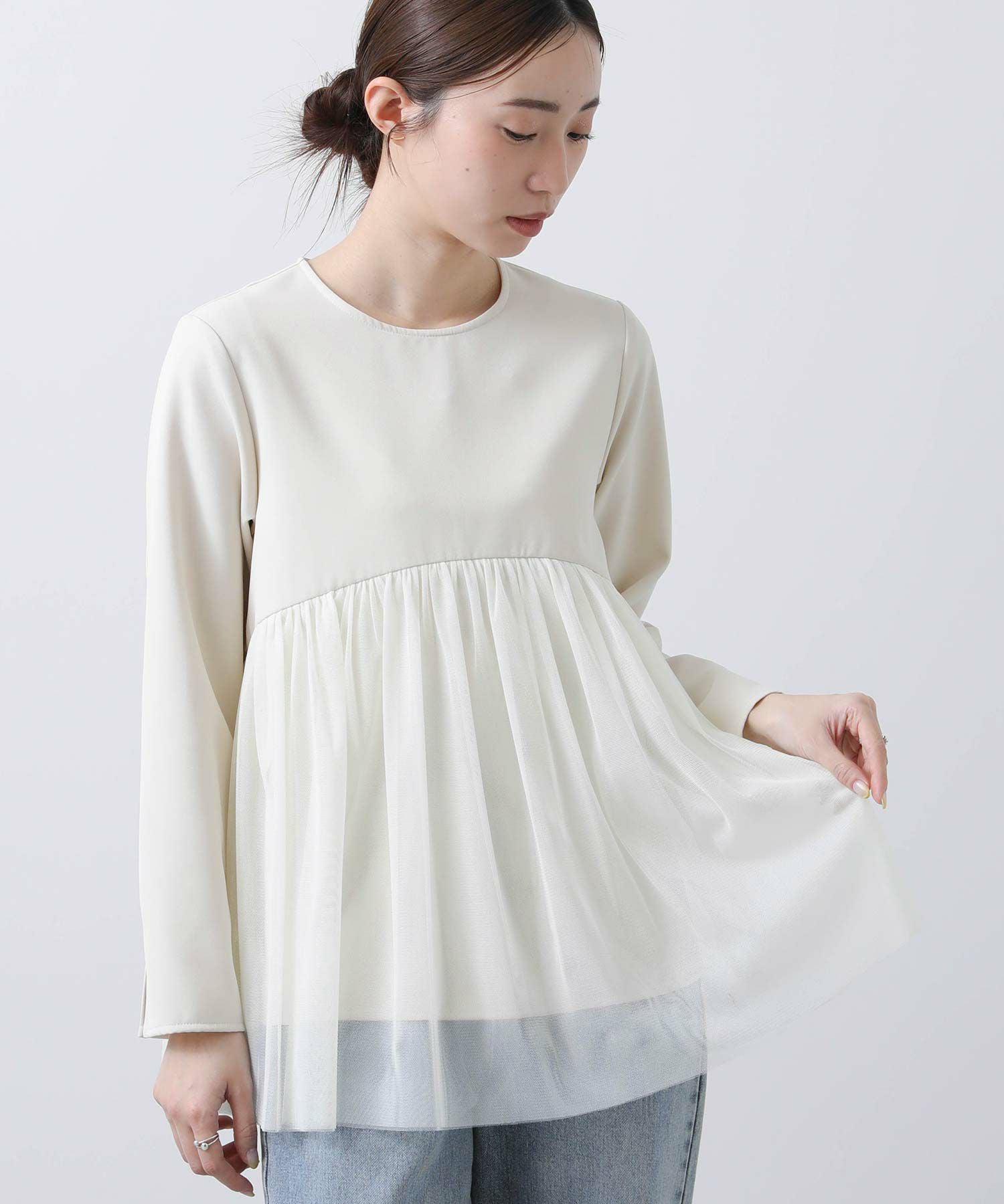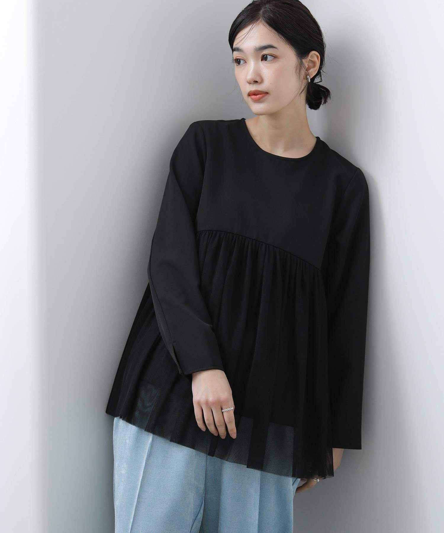 一枚で決まるチュール素材をドッキングしたペプラムプルオーバー。