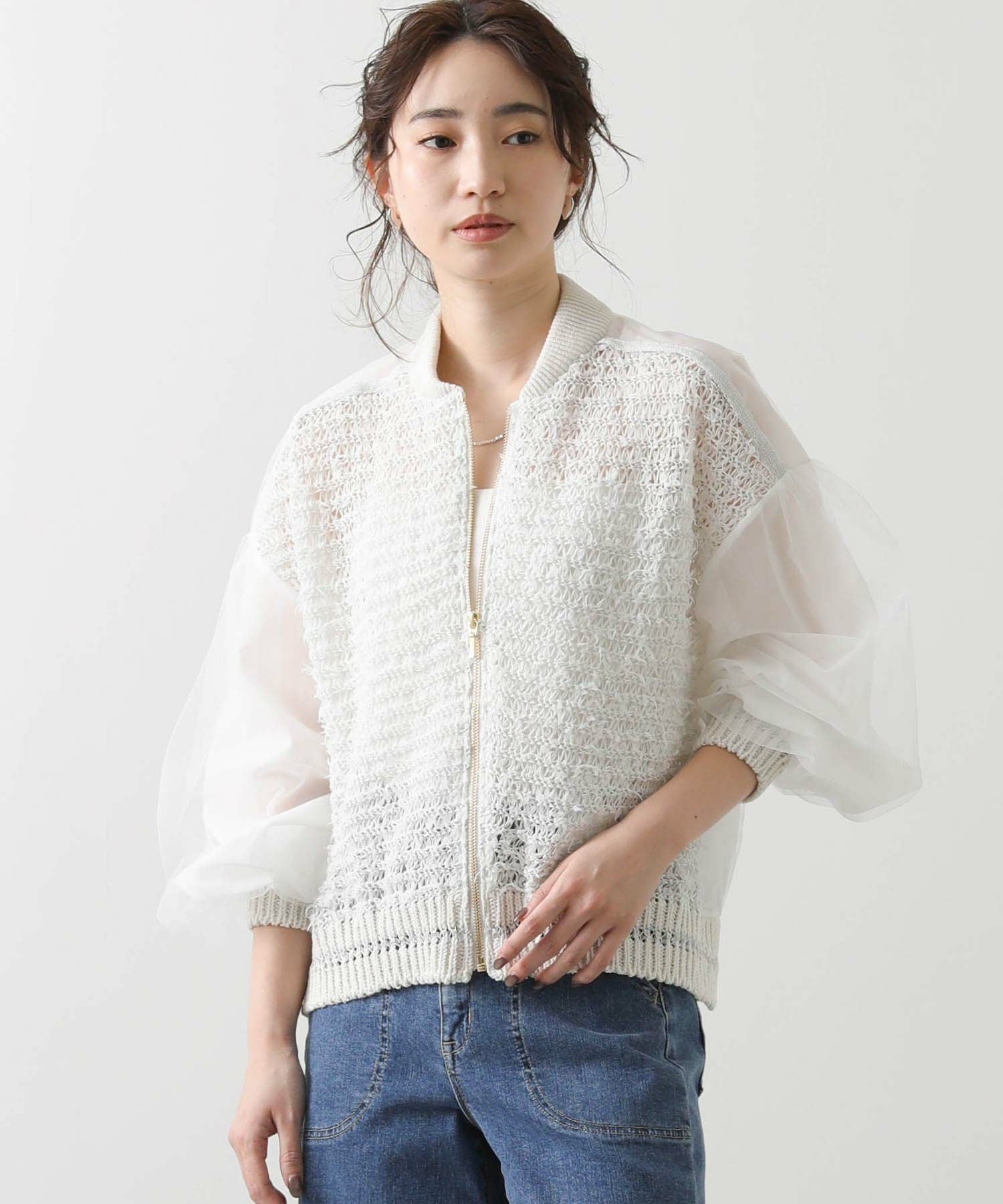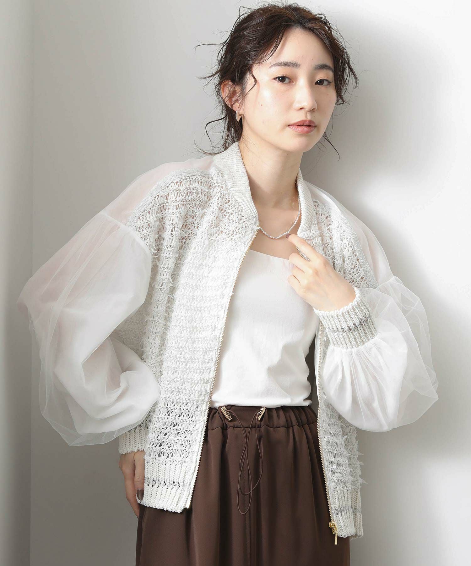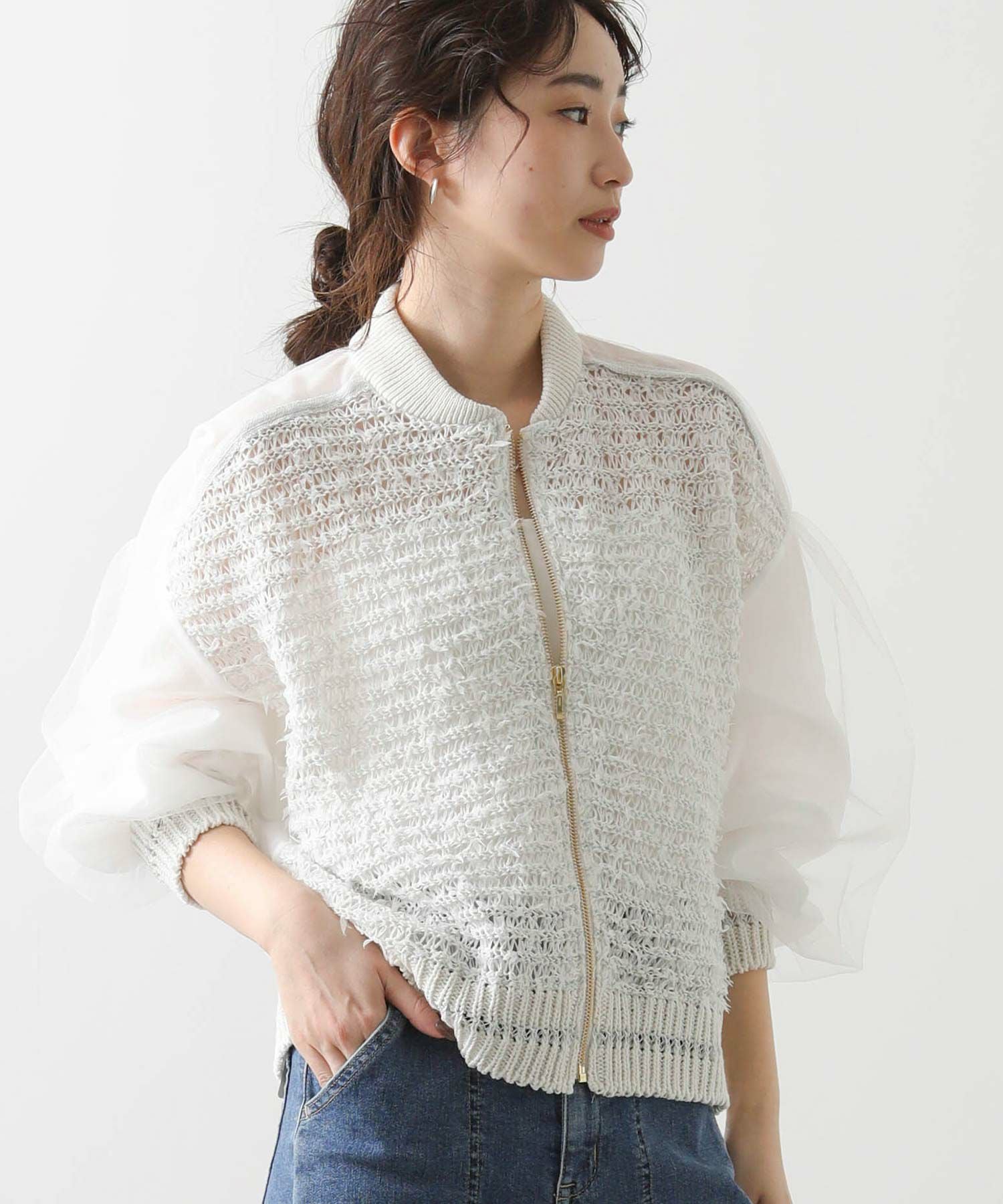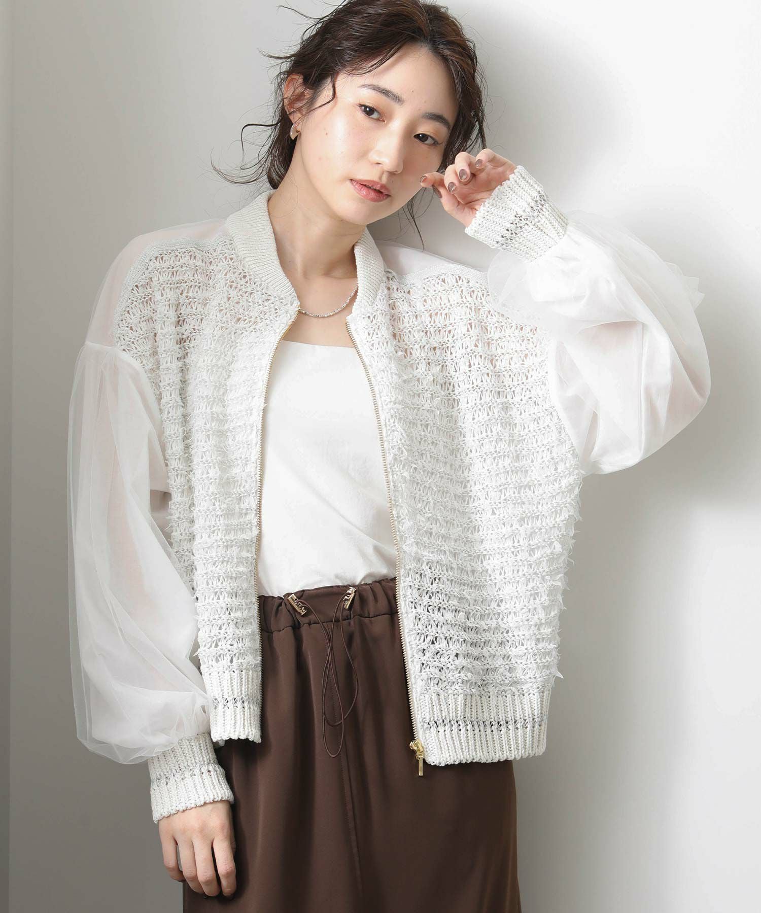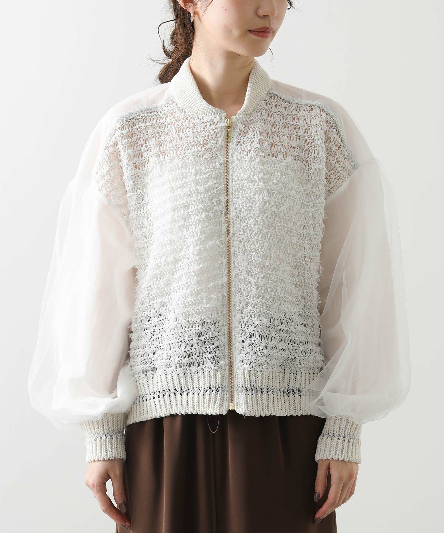 【EN`DAY(エンディ)】から、羽のように軽やかに跳ねるチュール糸が視線を引き寄せる、ジップアップブルゾンをセレクト。