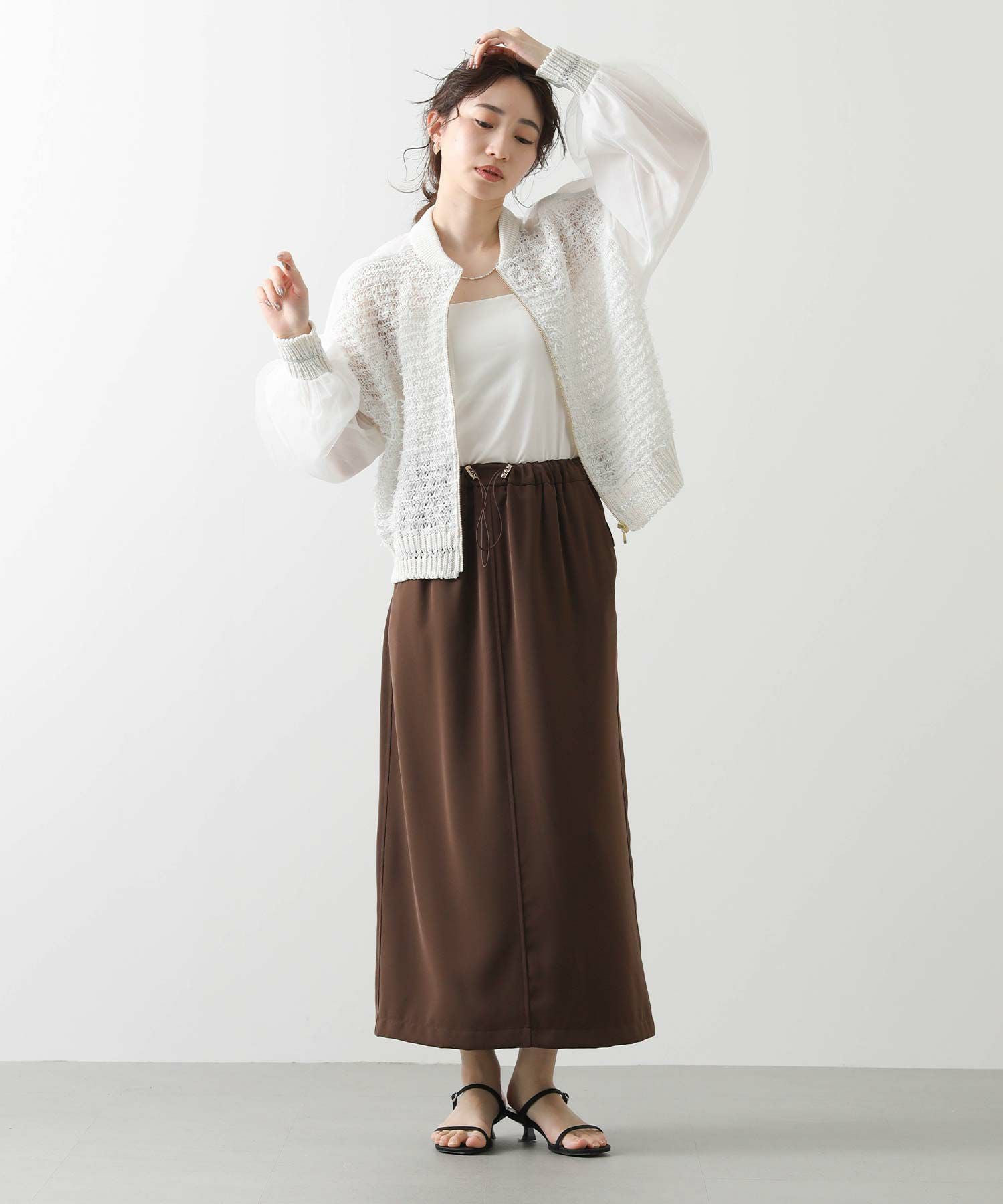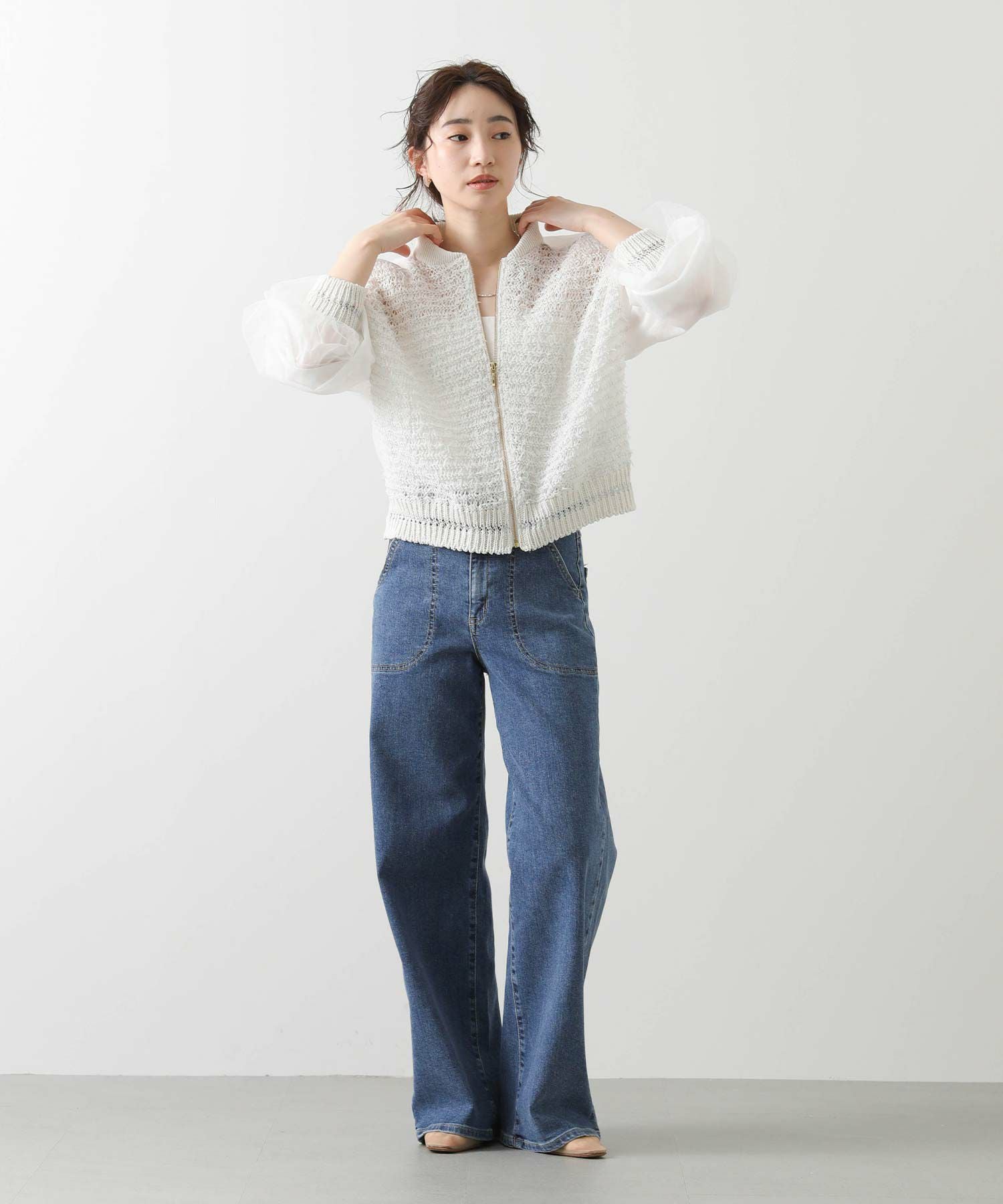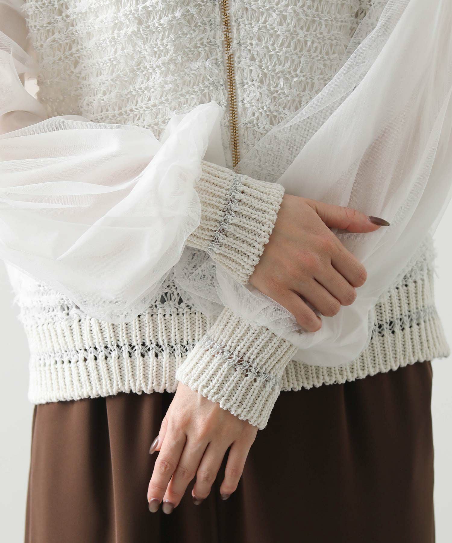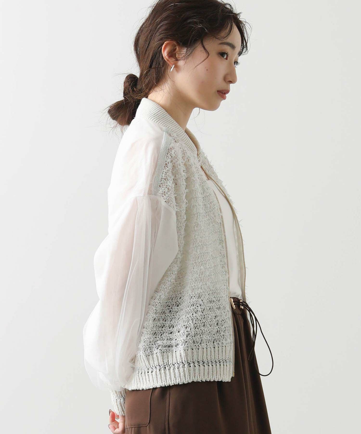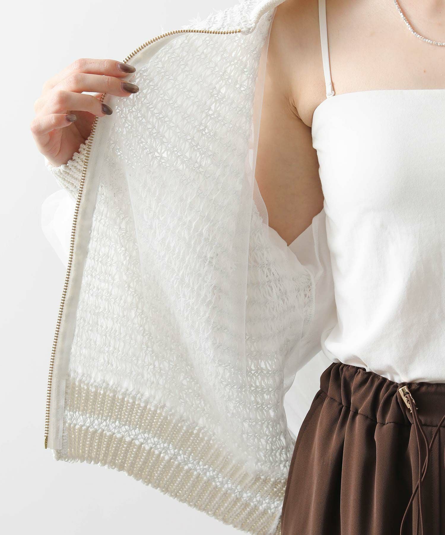 【EN`DAY(エンディ)】から、羽のように軽やかに跳ねるチュール糸が視線を引き寄せる、ジップアップブルゾンをセレクト。