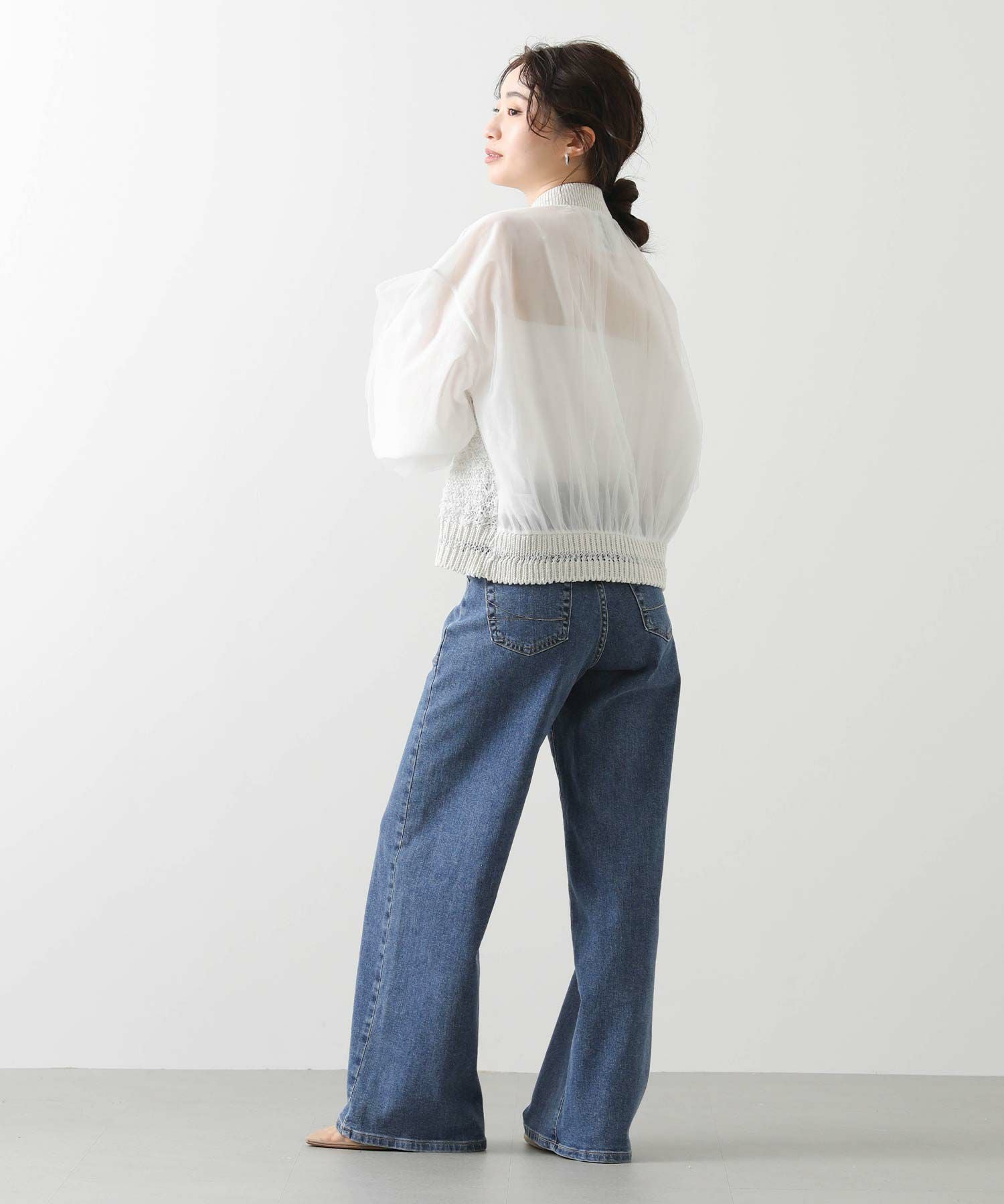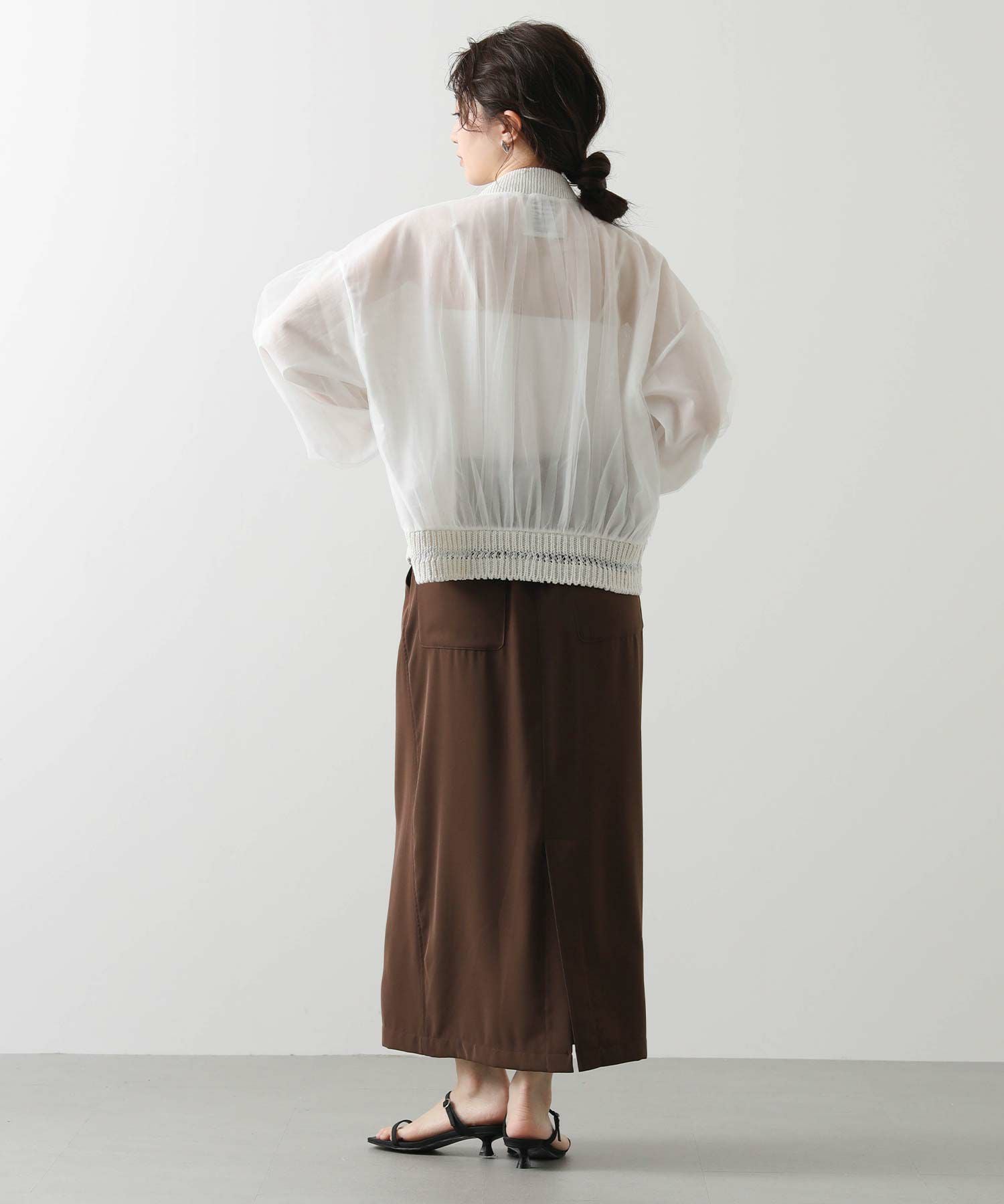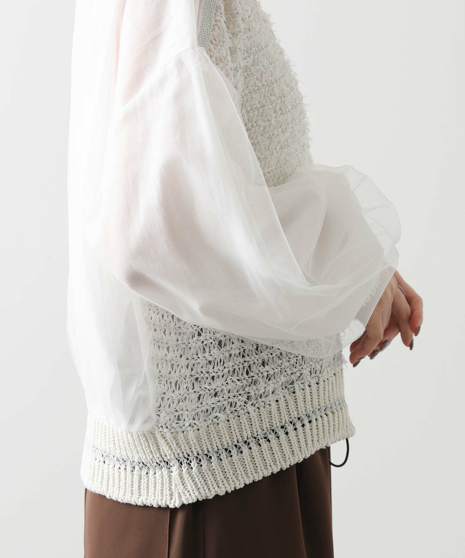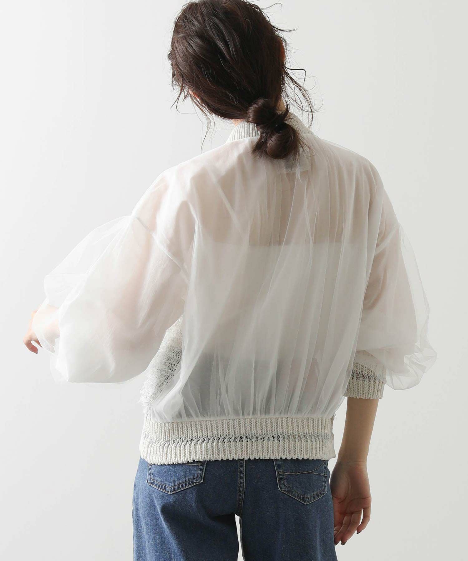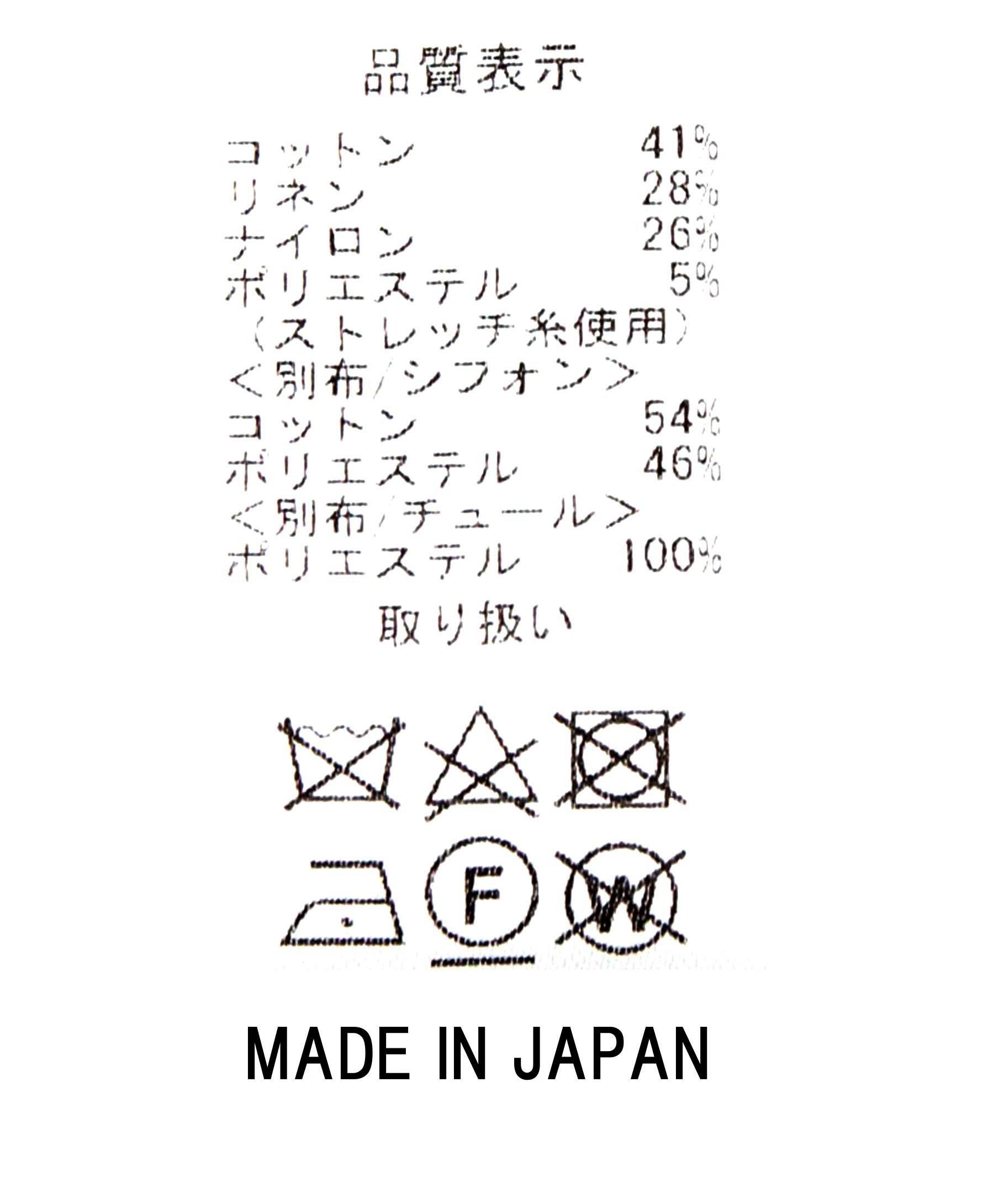 袖と後ろ身頃は、コットンポリエステルのシフォンとチュールを重ねた2枚仕立て。シアー感と適度なボリュームを演出しつつ、少し広めの袖幅が二の腕を上品にカバーしてくれます。