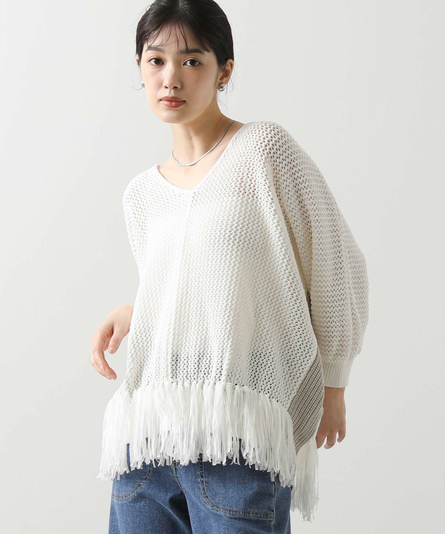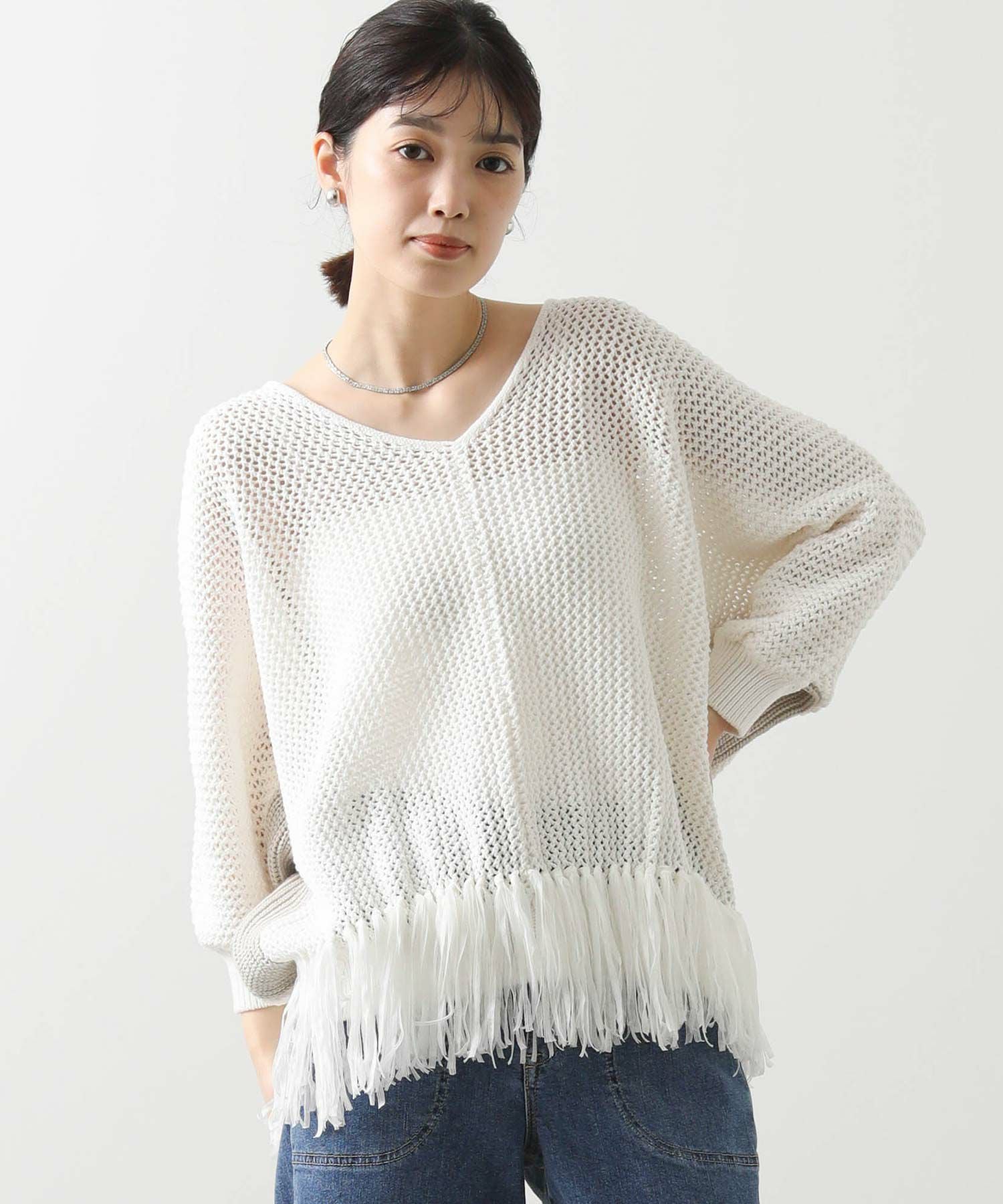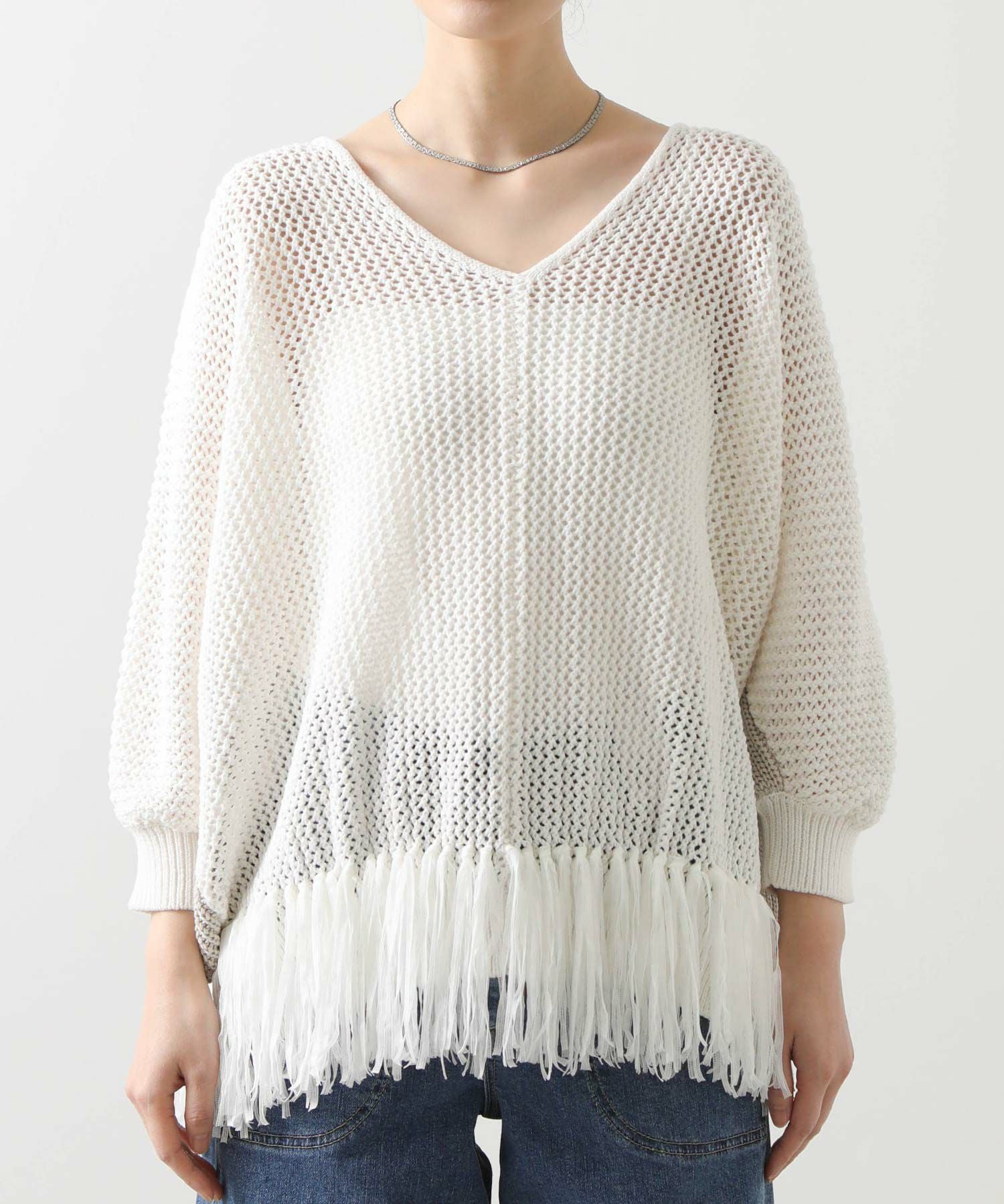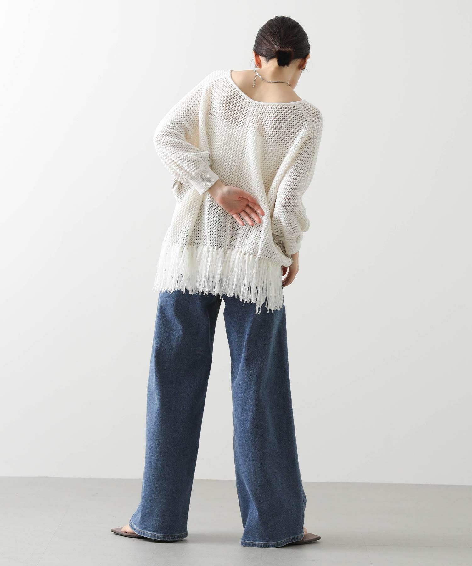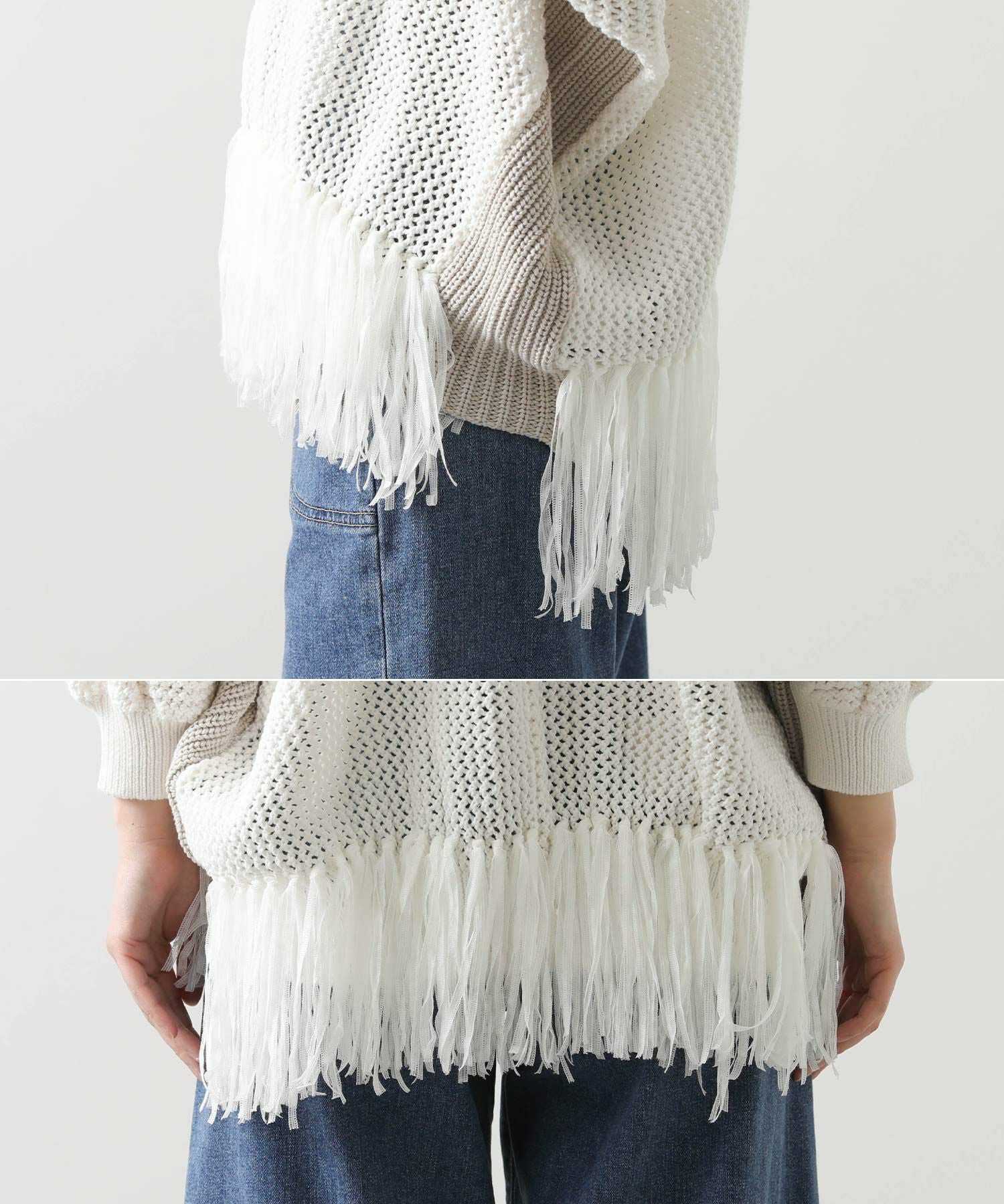 【EN`DAY(エンディ)】から、涼しげな編み地に映える裾のフリンジが、リラックスしたシルエットの中で軽やかに揺れ、華やかなアクセントを加えるニットをセレクト。