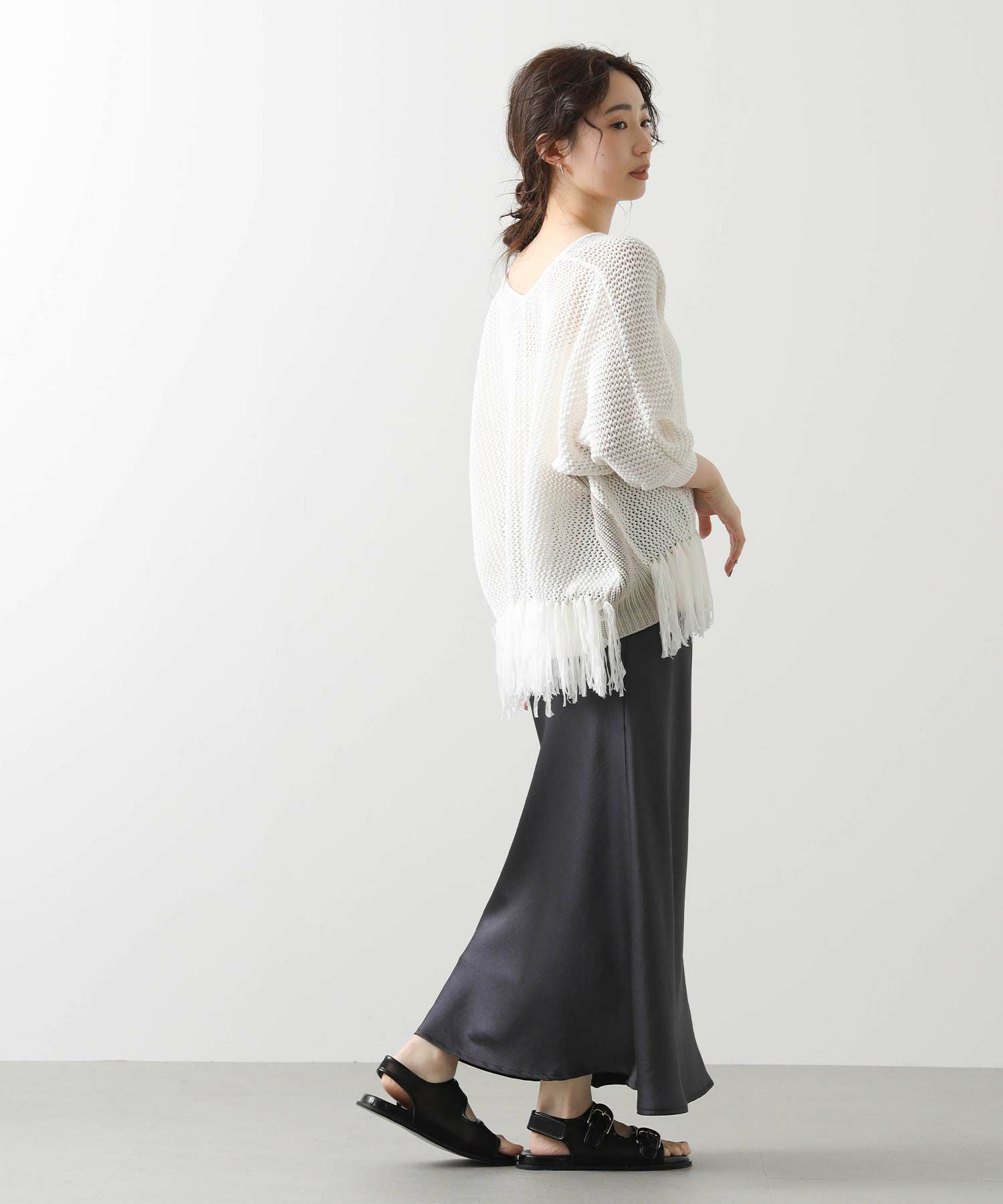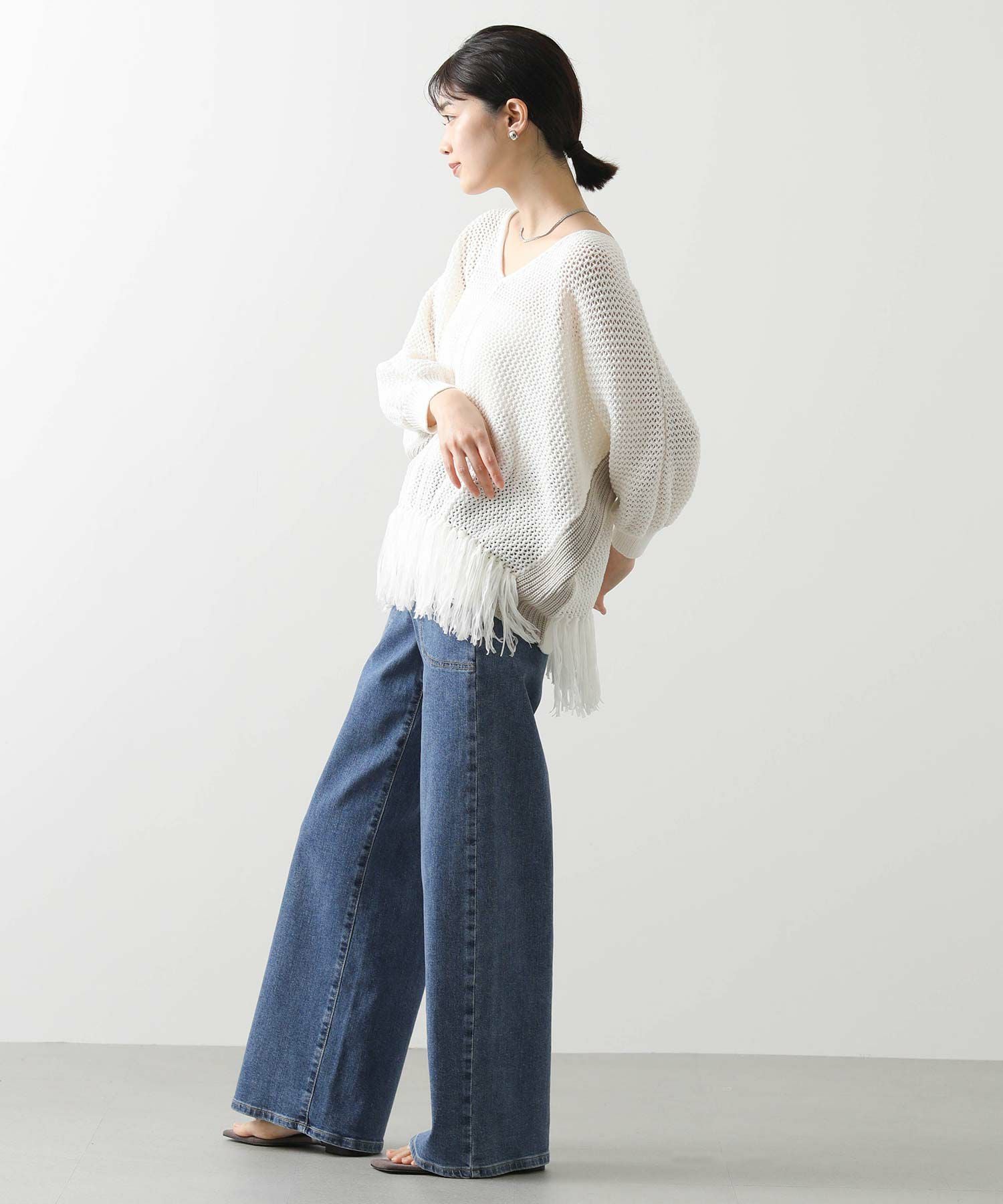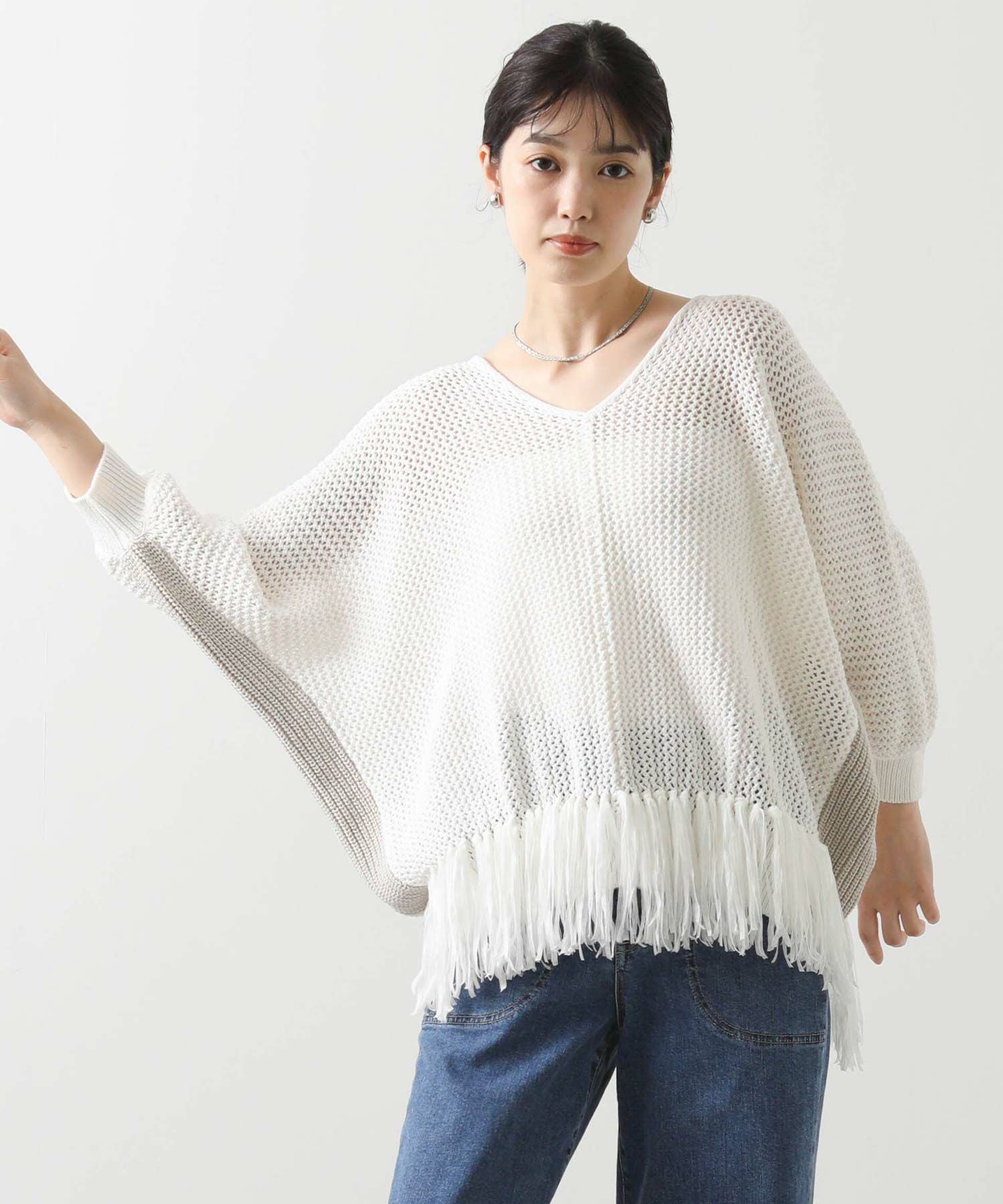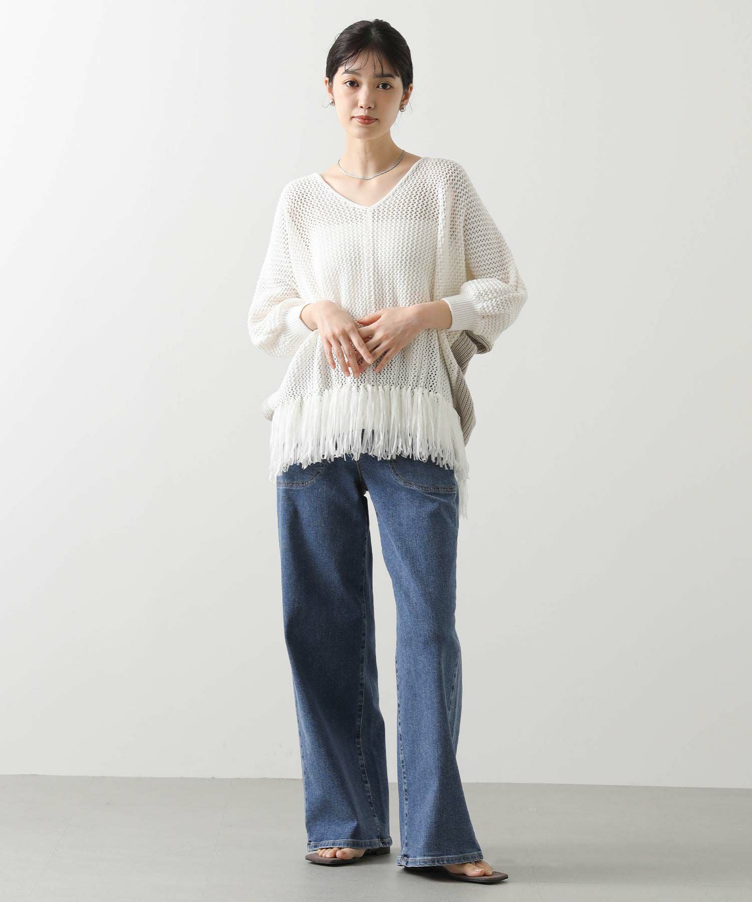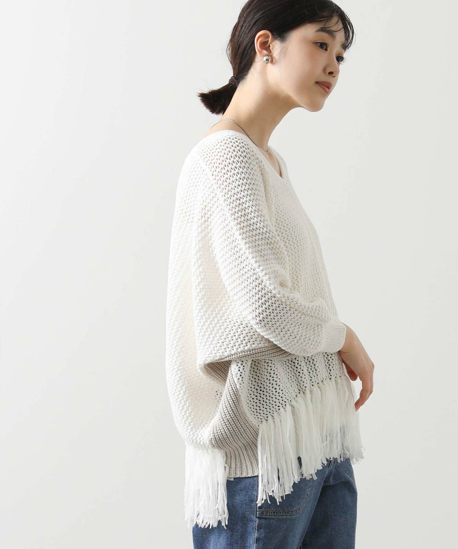 【EN`DAY(エンディ)】から、涼しげな編み地に映える裾のフリンジが、リラックスしたシルエットの中で軽やかに揺れ、華やかなアクセントを加えるニットをセレクト。