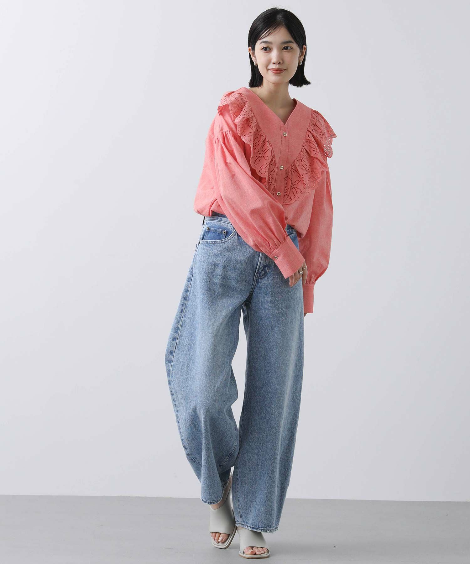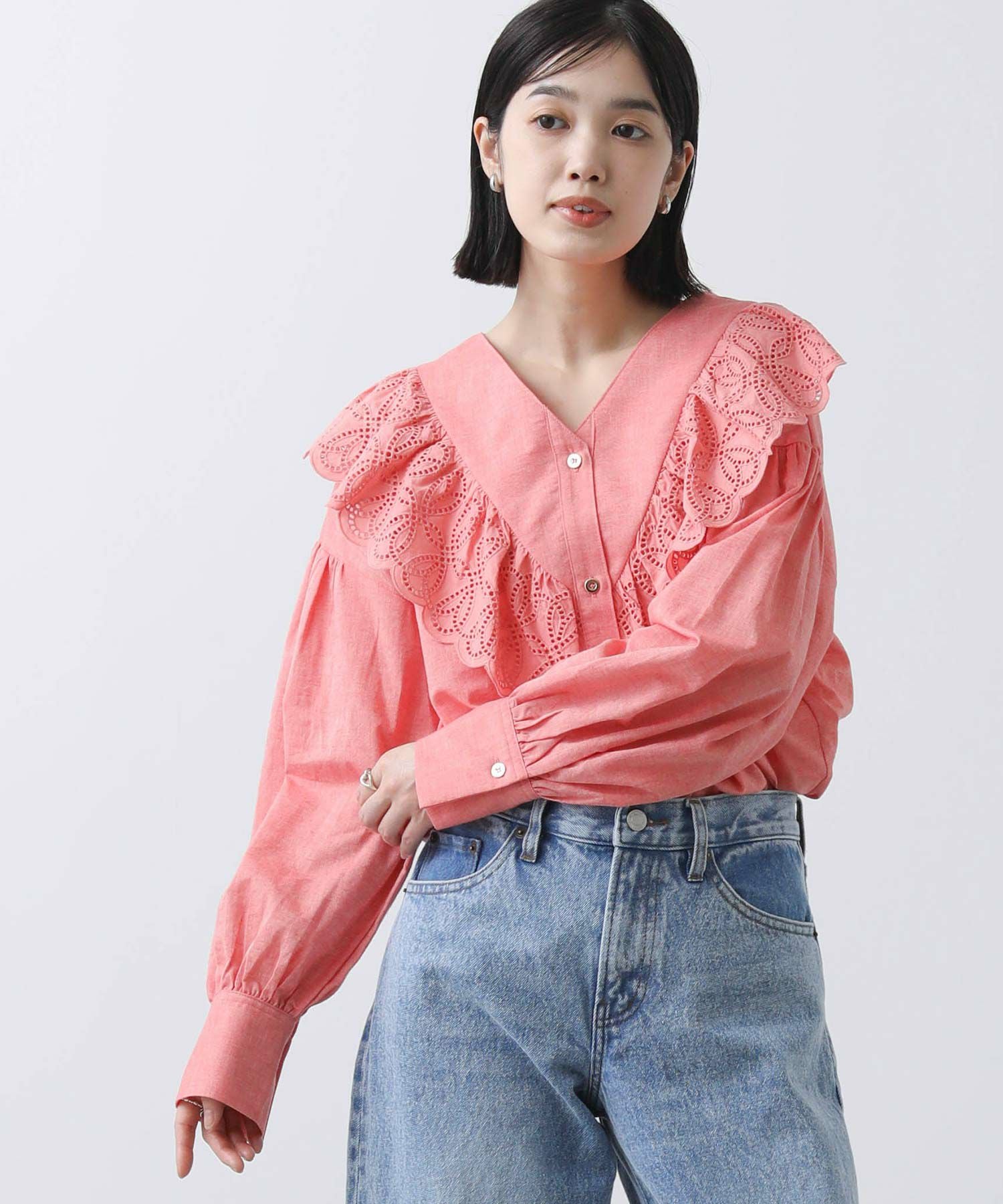 一枚で華やかなブラウスなので、シンプルなボトムスとのコーディネートがおすすめです。
