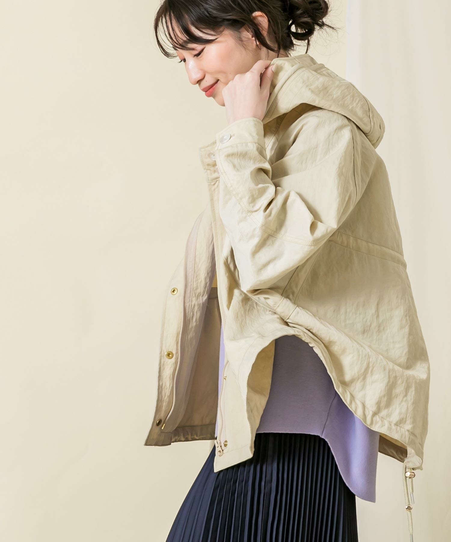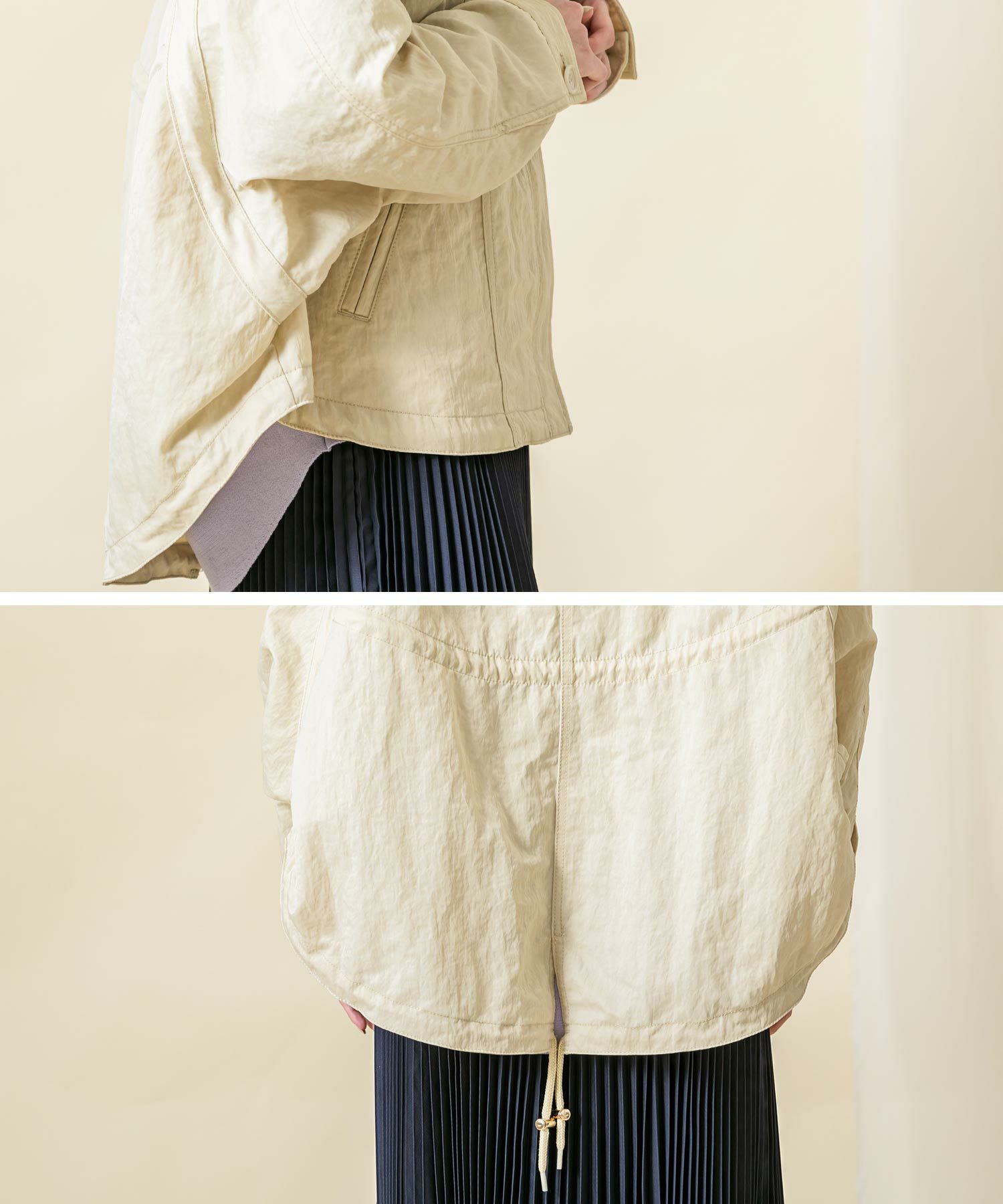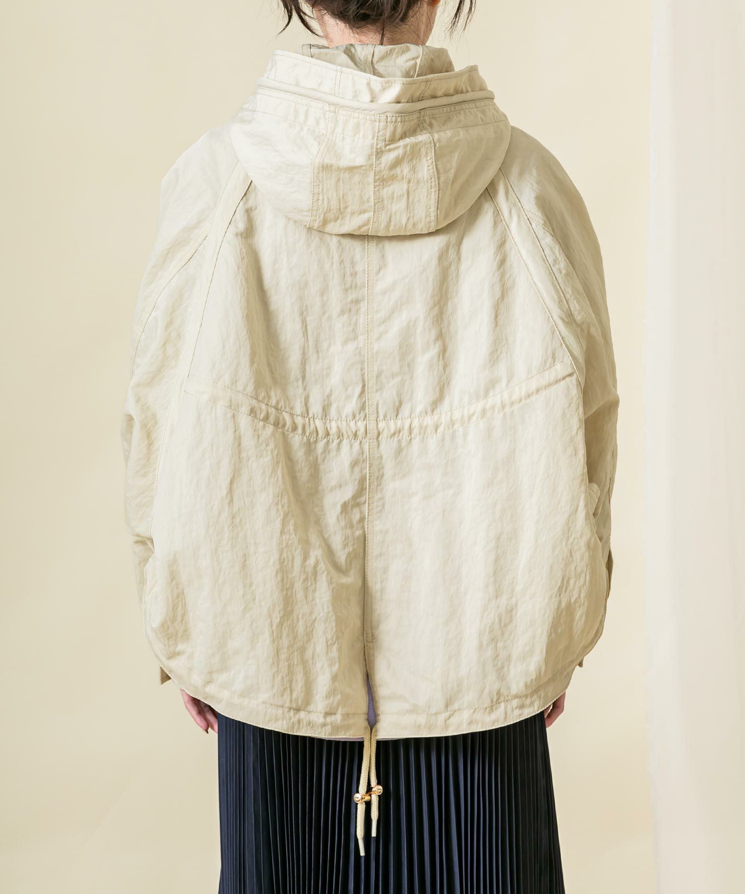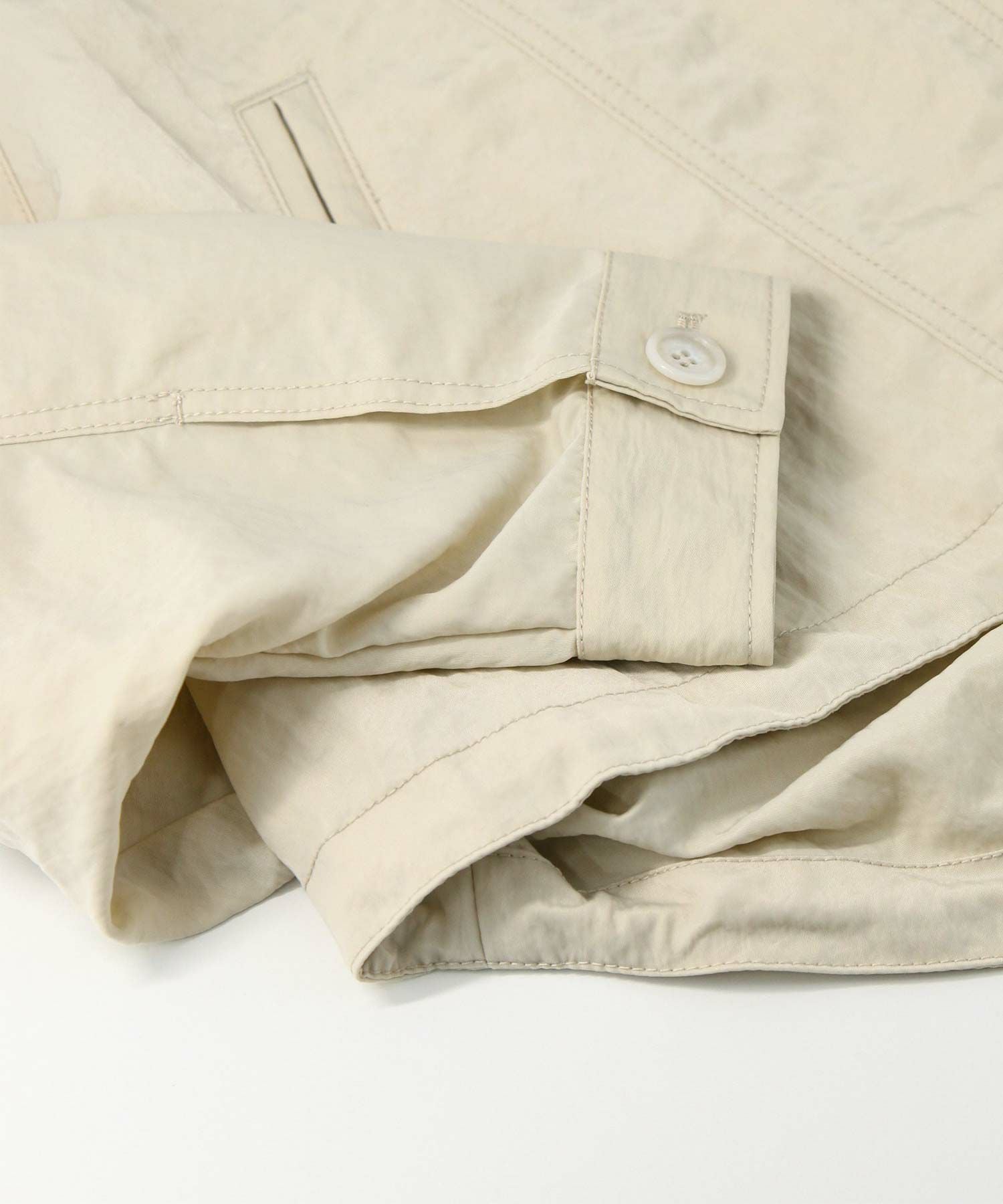 ハリと光沢のある肉厚なナイロン素材を使用しています。素材のワッシャー感がトレンドライク。袖のロールアップ、ウエストと裾はドロストコードの絞りを施し細部のデザインにこだわっています。