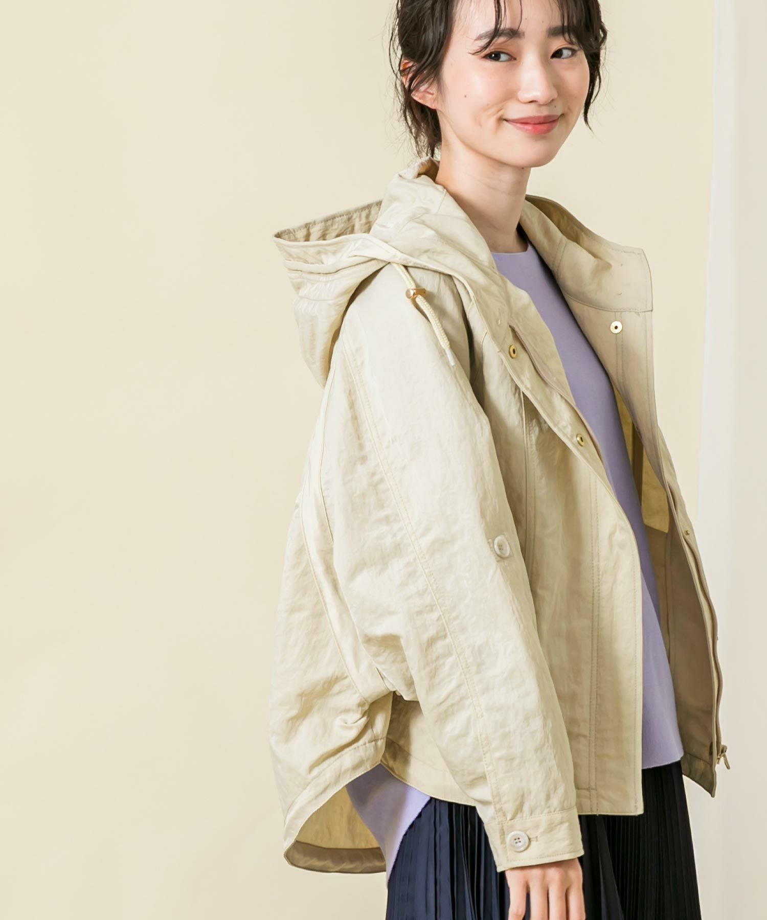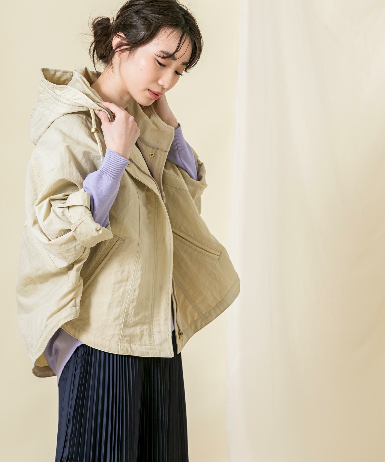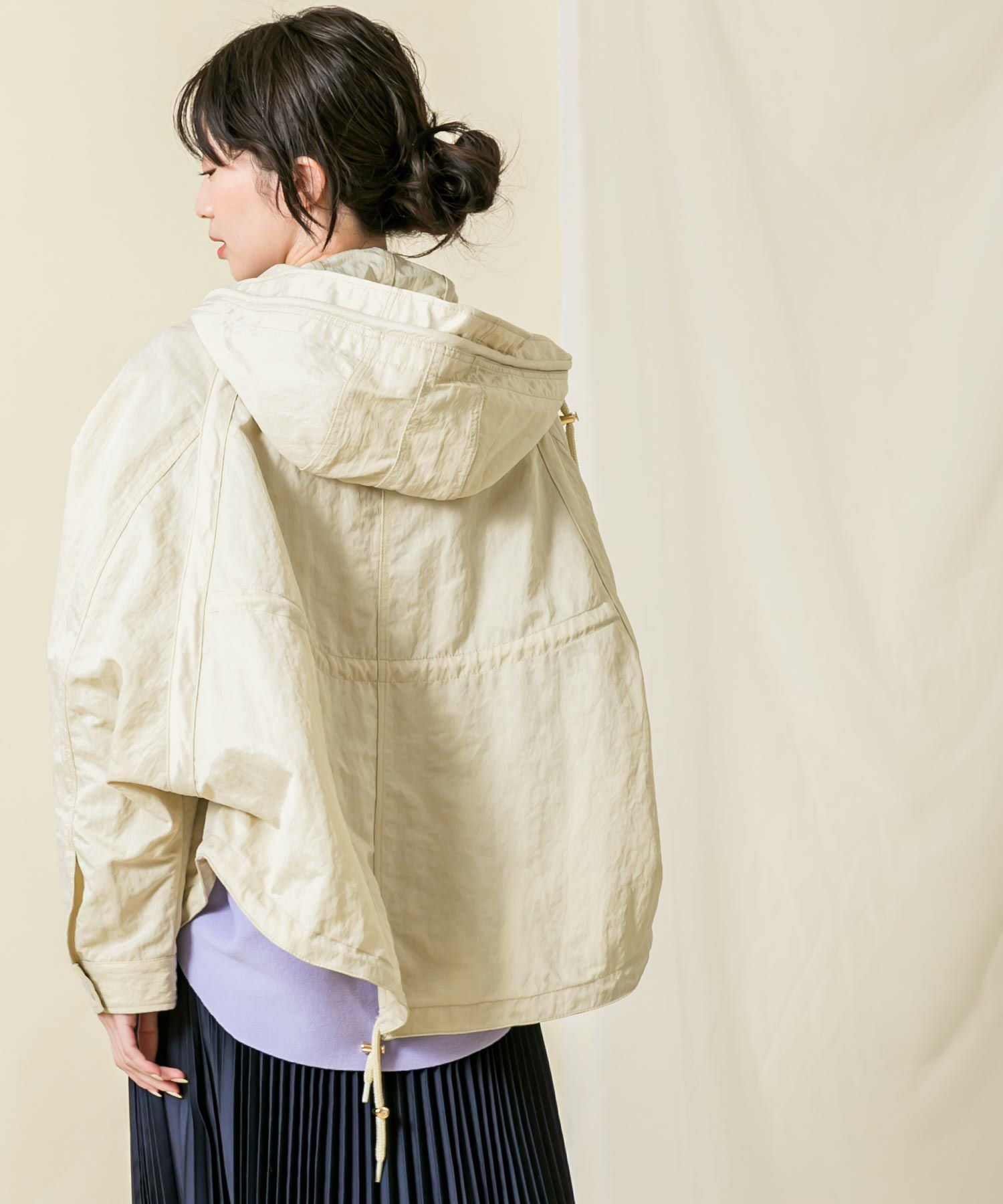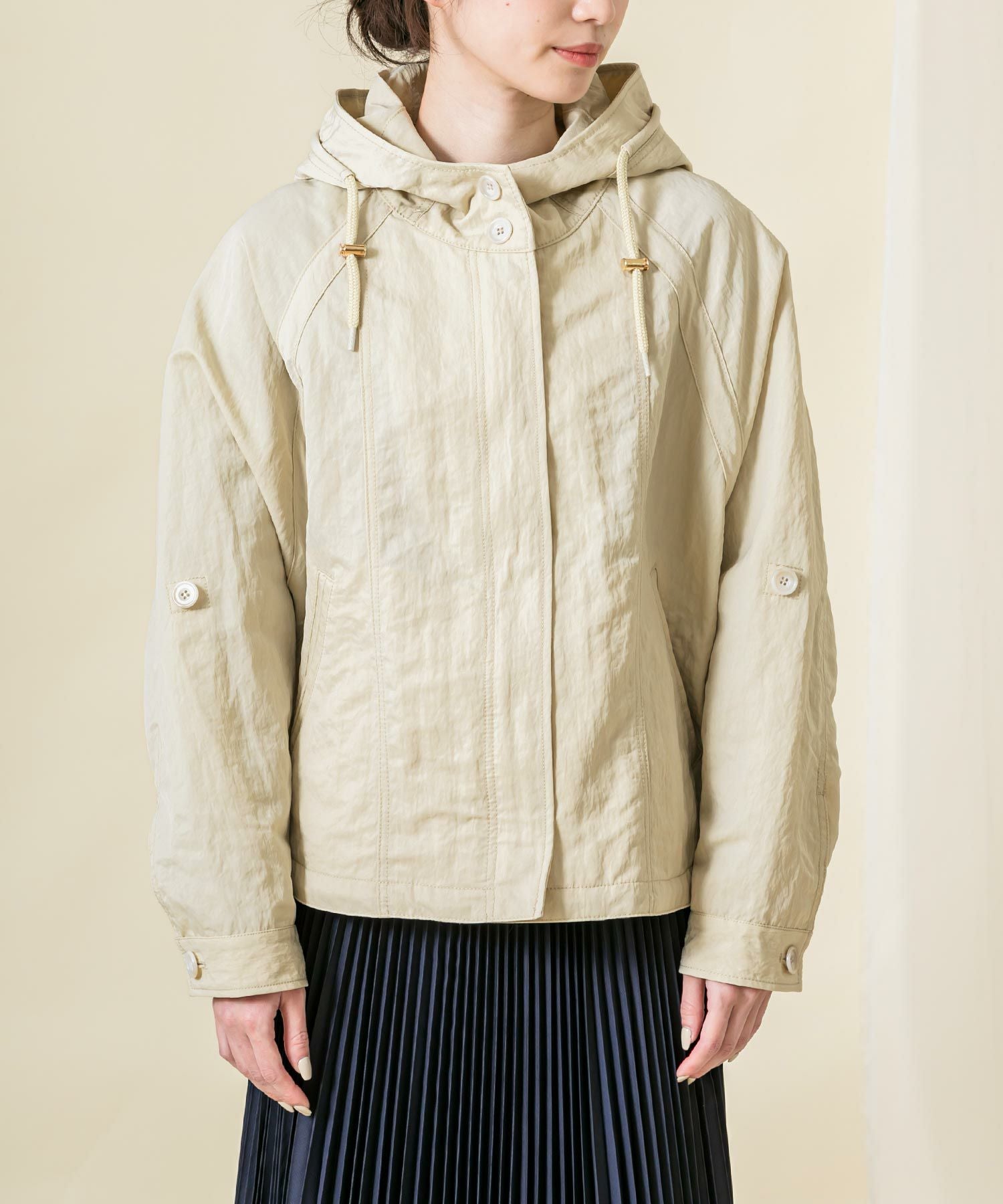 ハリと光沢のある肉厚なナイロン素材を使用しています。素材のワッシャー感がトレンドライク。袖のロールアップ、ウエストと裾はドロストコードの絞りを施し細部のデザインにこだわっています。