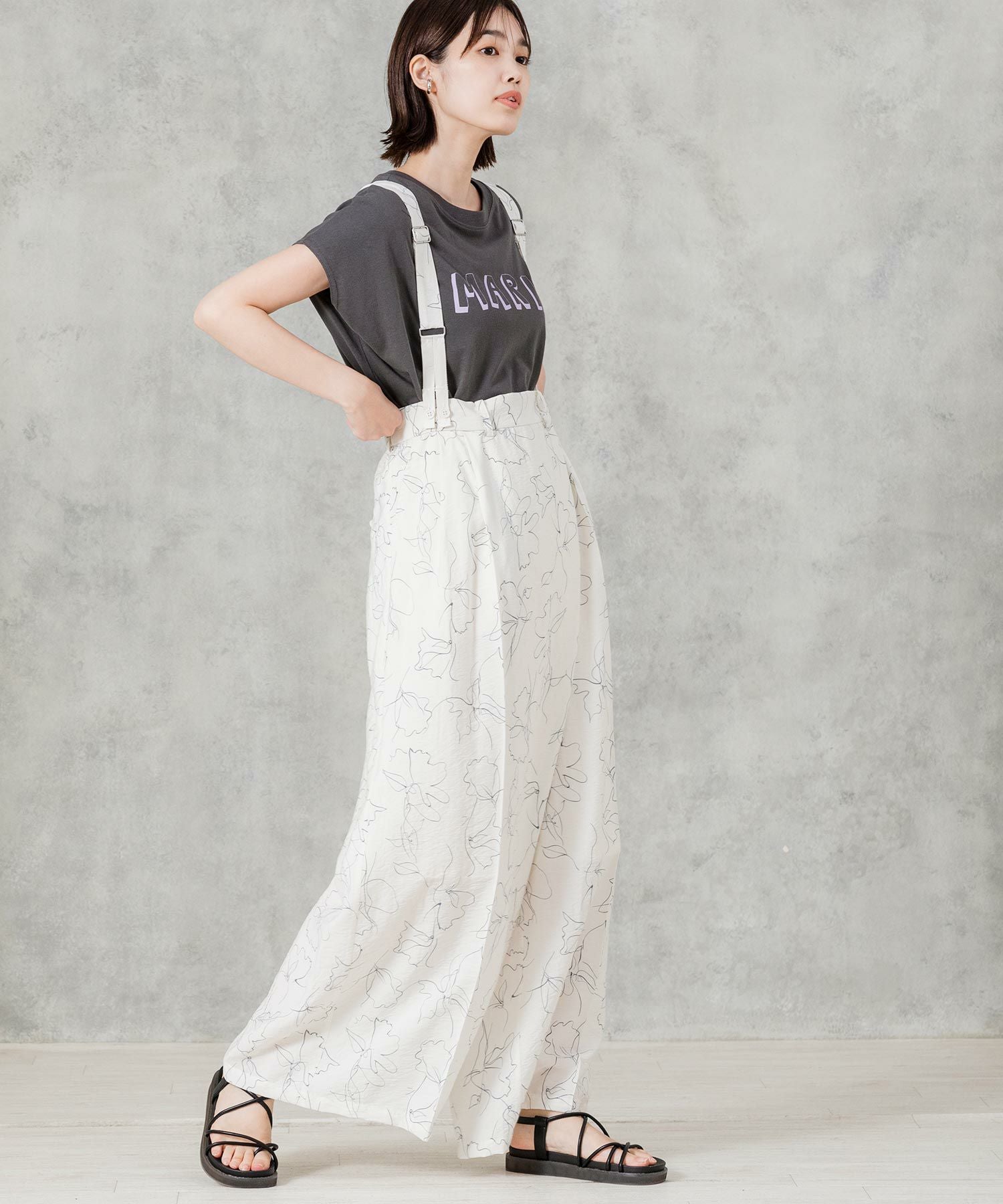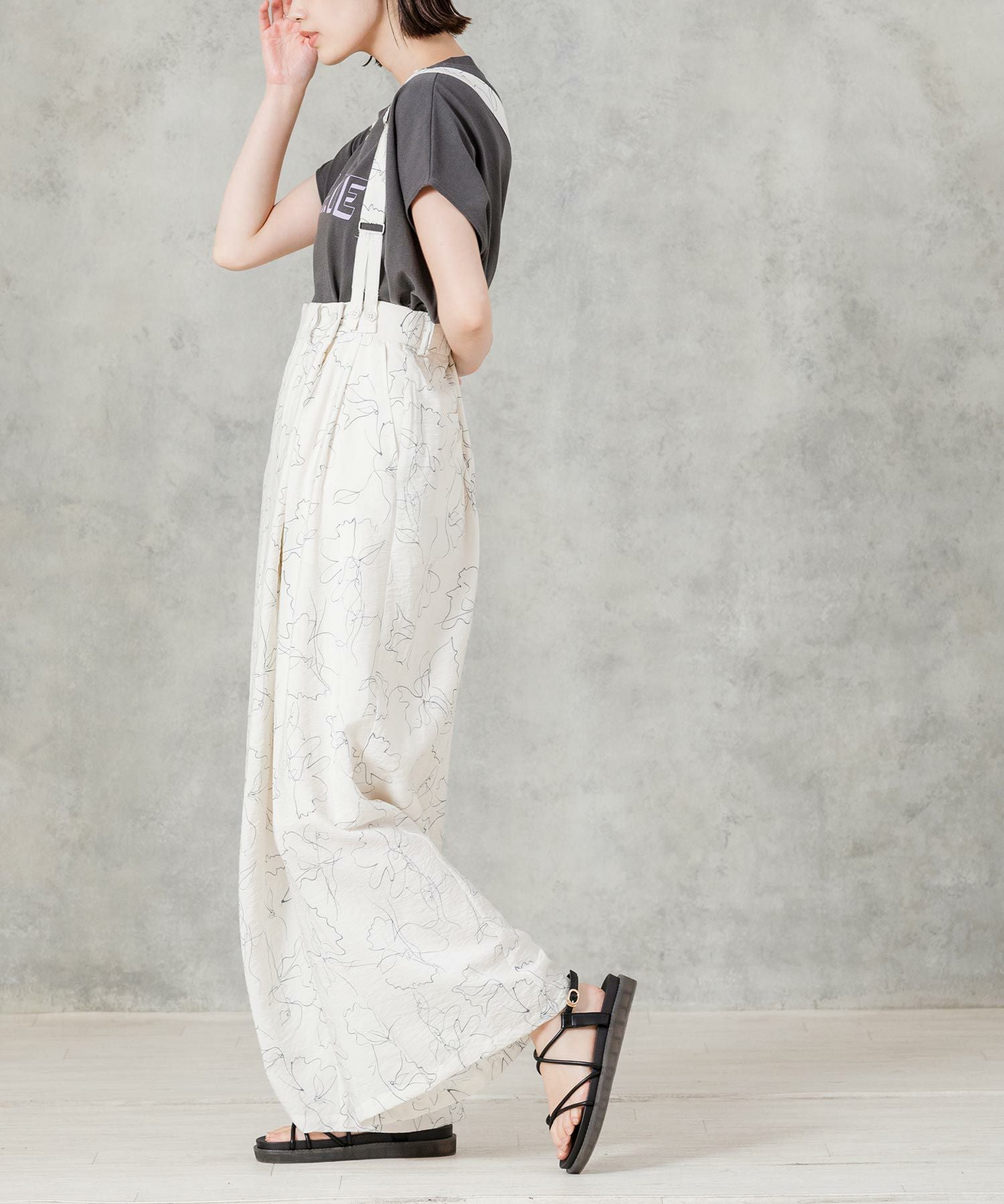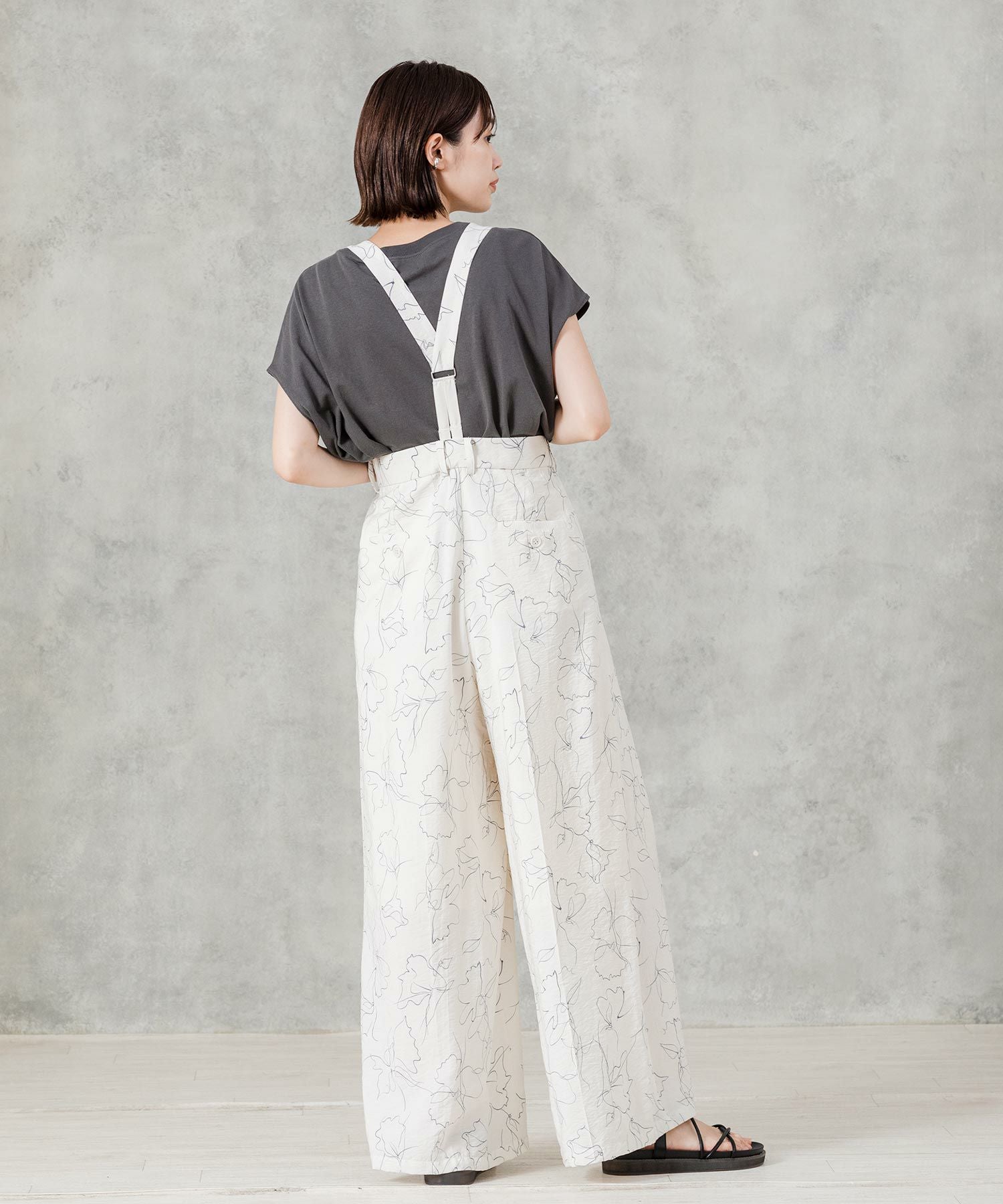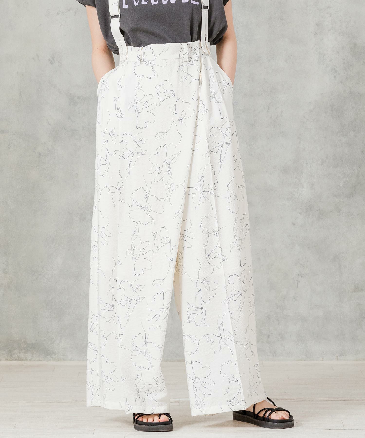 【AudreyandJohnWad(オードリーアンドジョンワッド】から、ラップデザインがトレンドライクなワイドパンツをセレクト。繊細な線画タッチの花柄プリントが大人フェミニンムードを高めます。