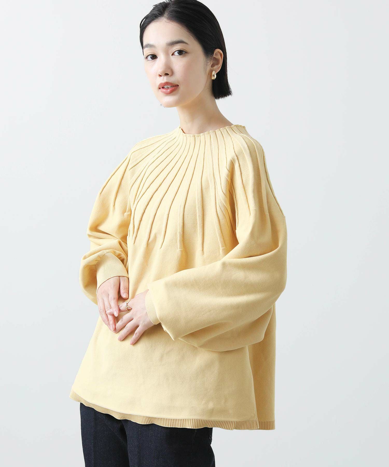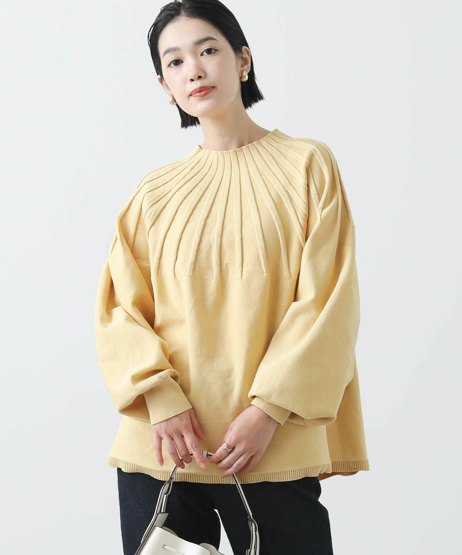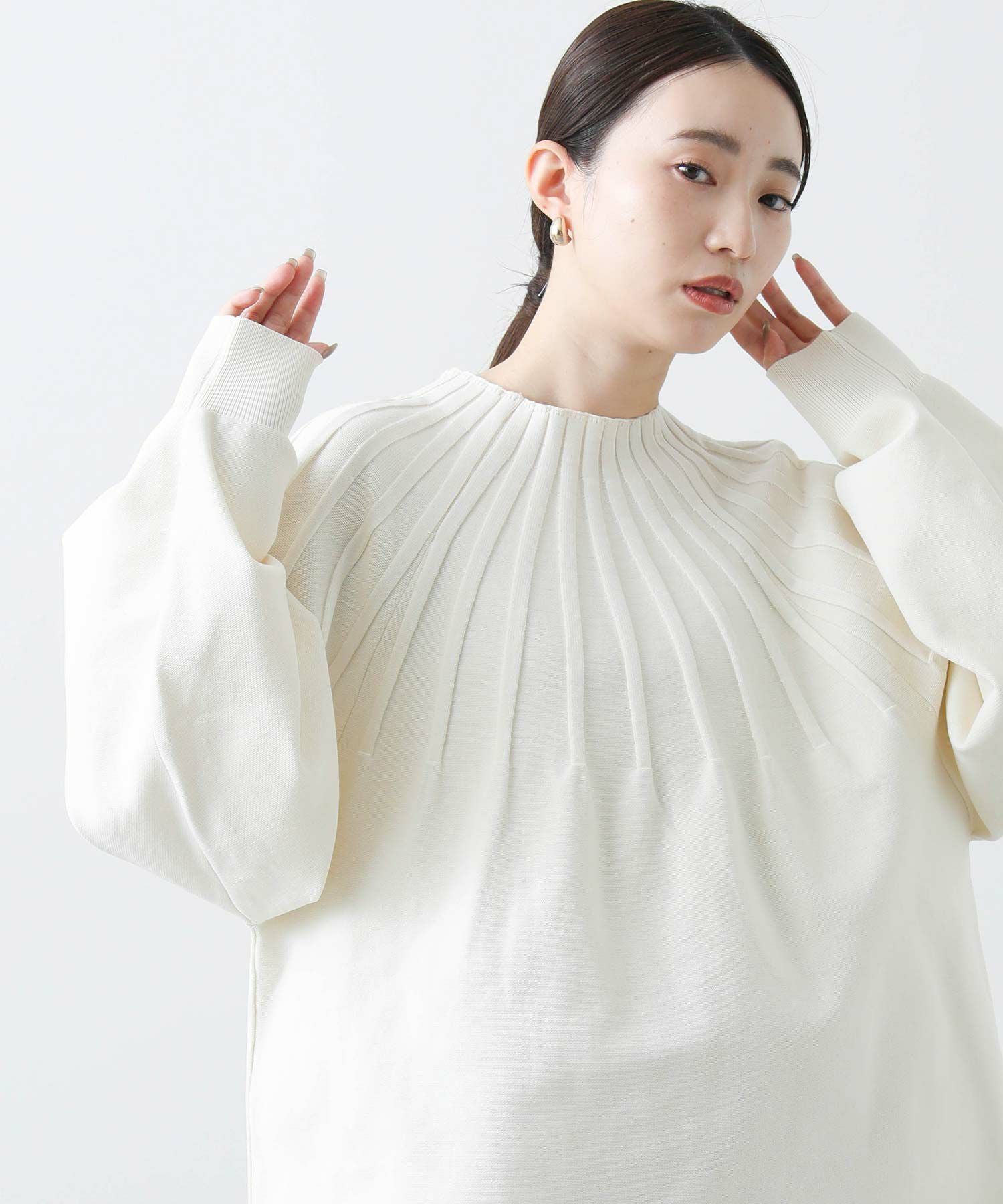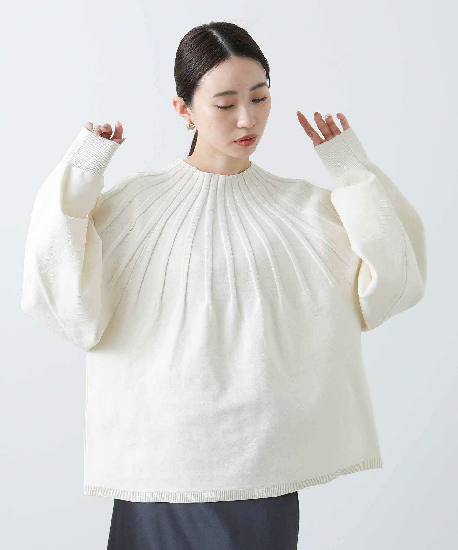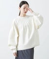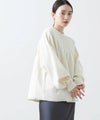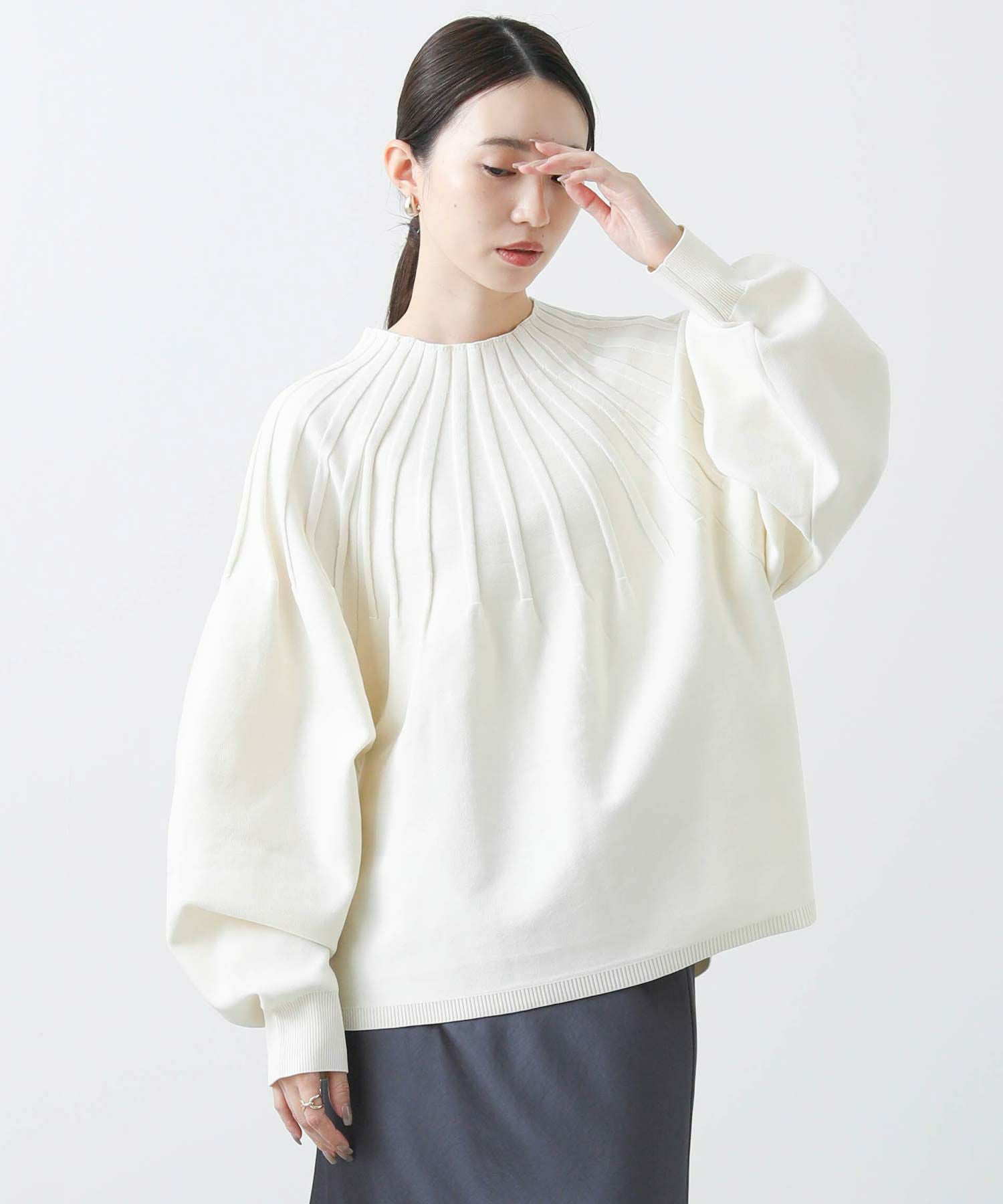ハイネックに沿って360度施された求心編みが目を惹くポイント。ラグランのパフスリーブでやや丸みのあるシルエットが可愛らしさのある1枚。