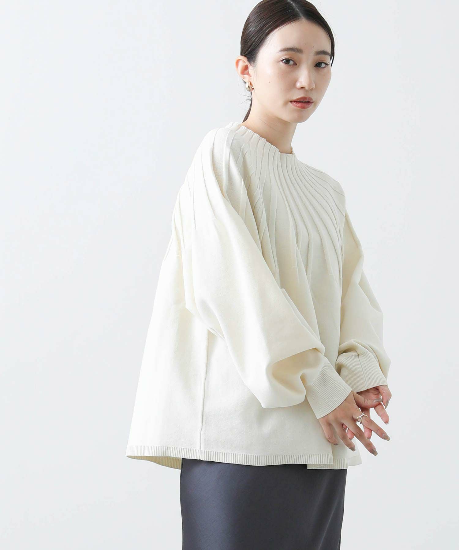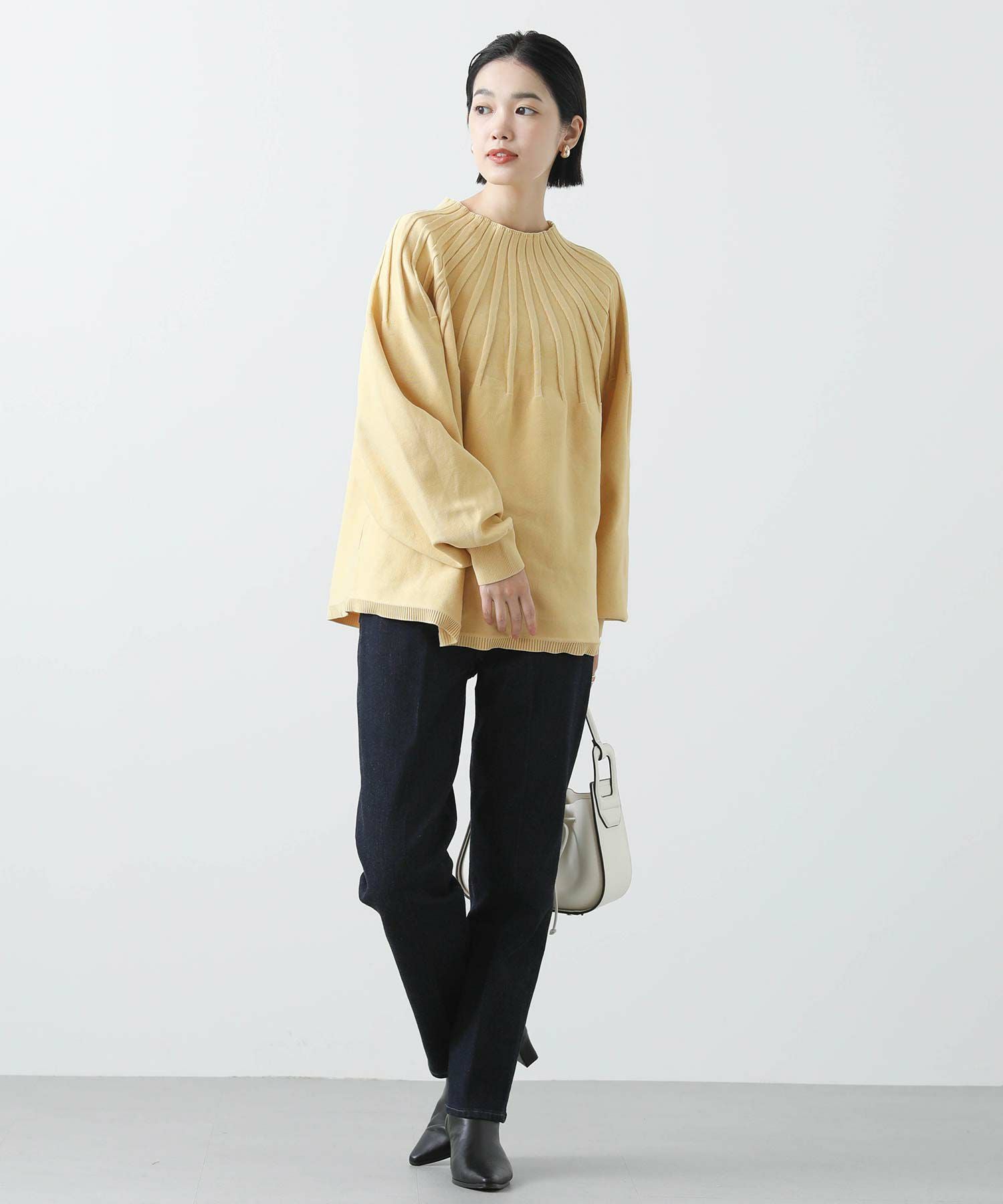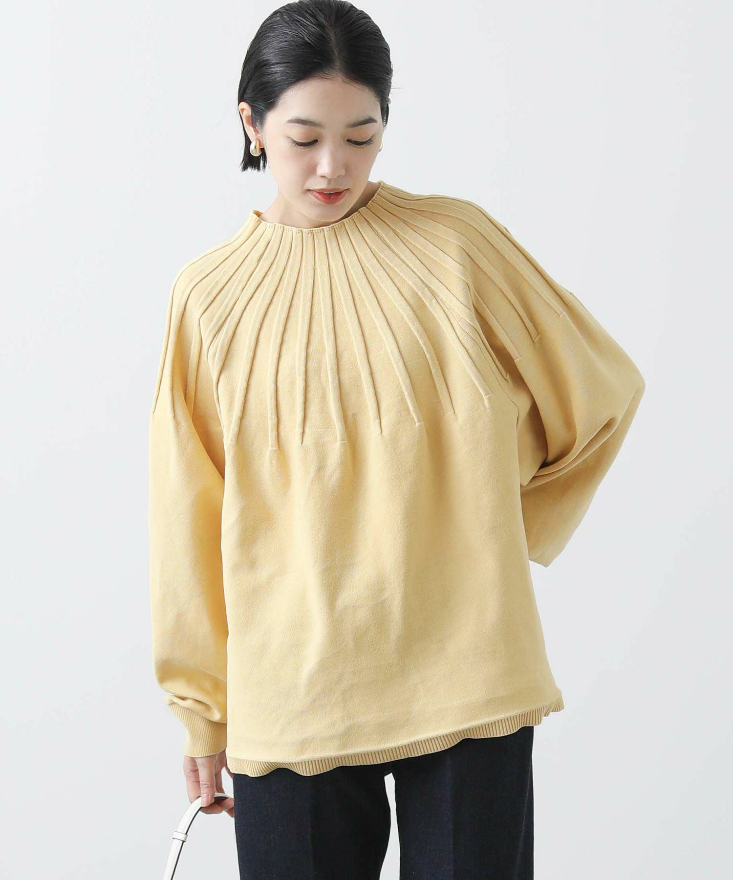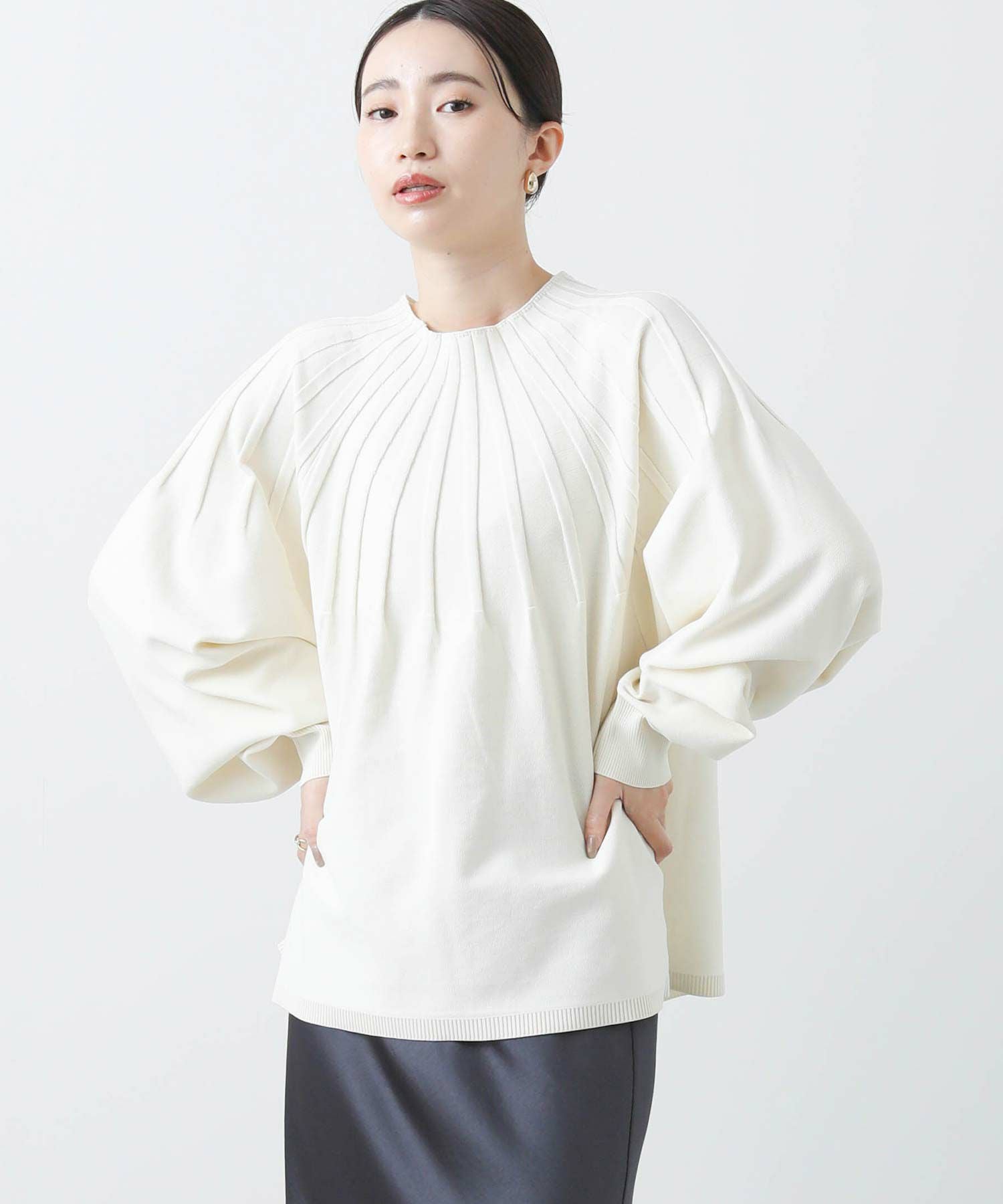 ハイネックに沿って360度施された求心編みが目を惹くポイント。ラグランのパフスリーブでやや丸みのあるシルエットが可愛らしさのある1枚。