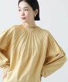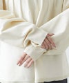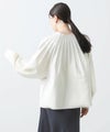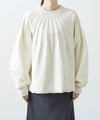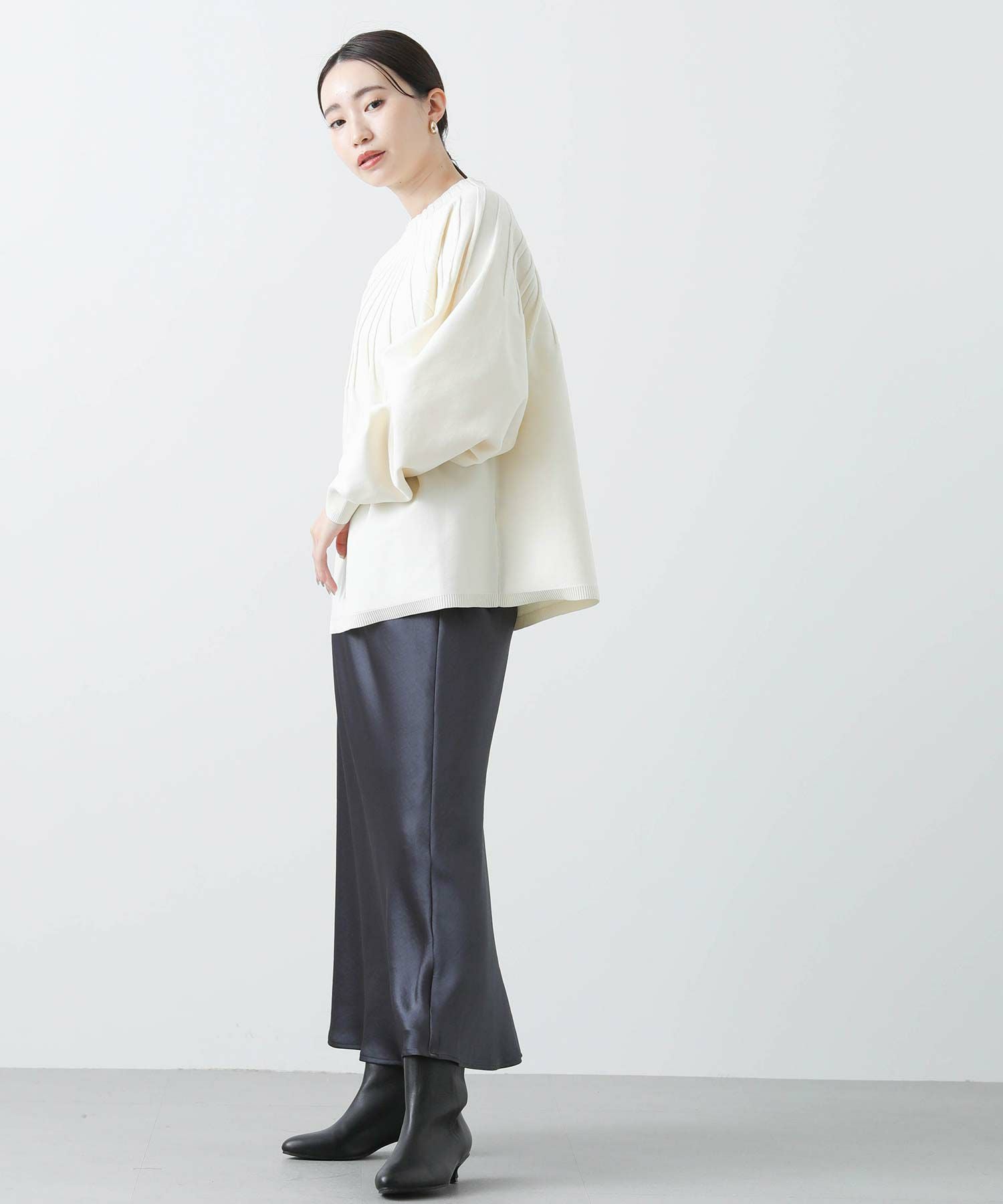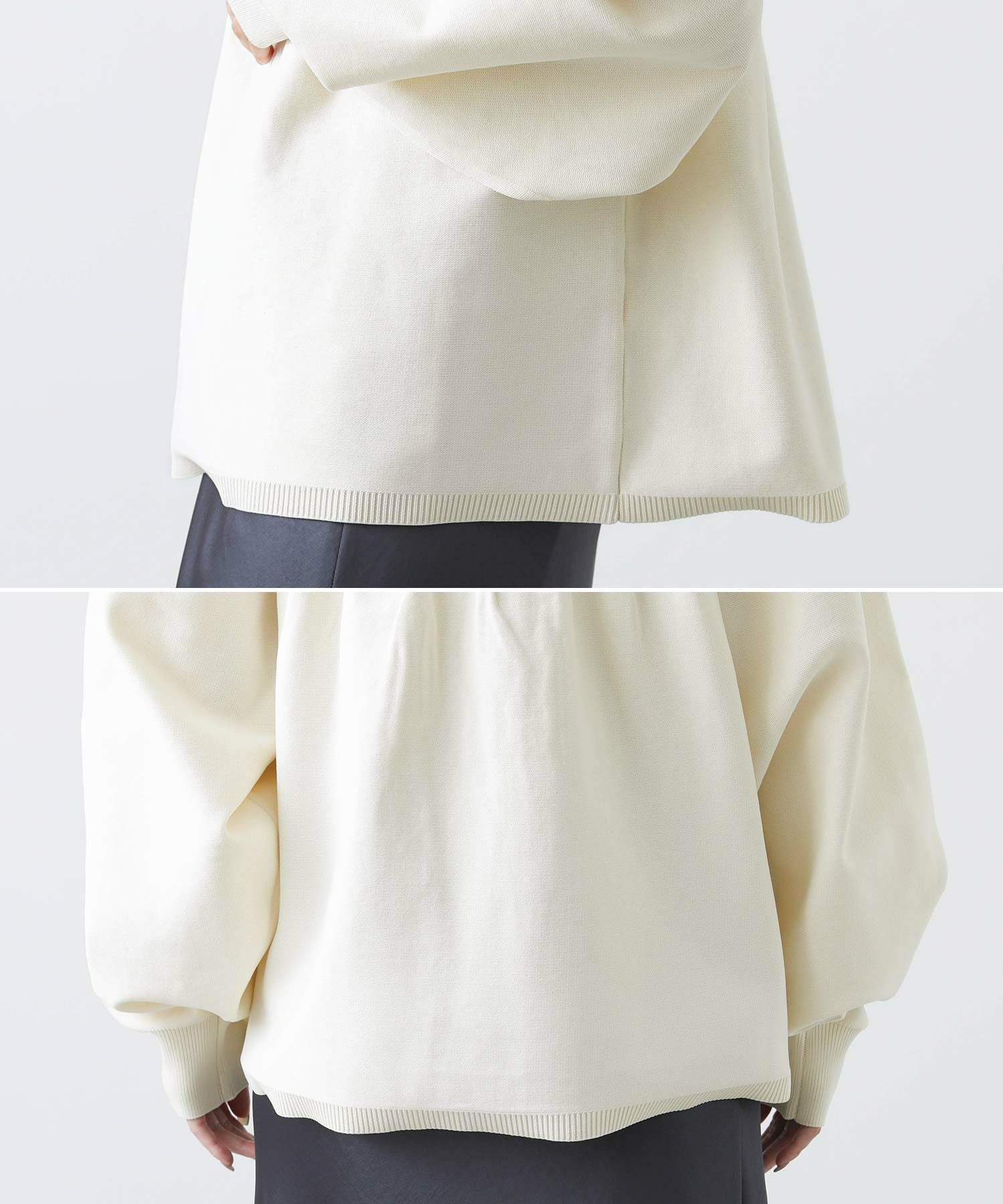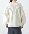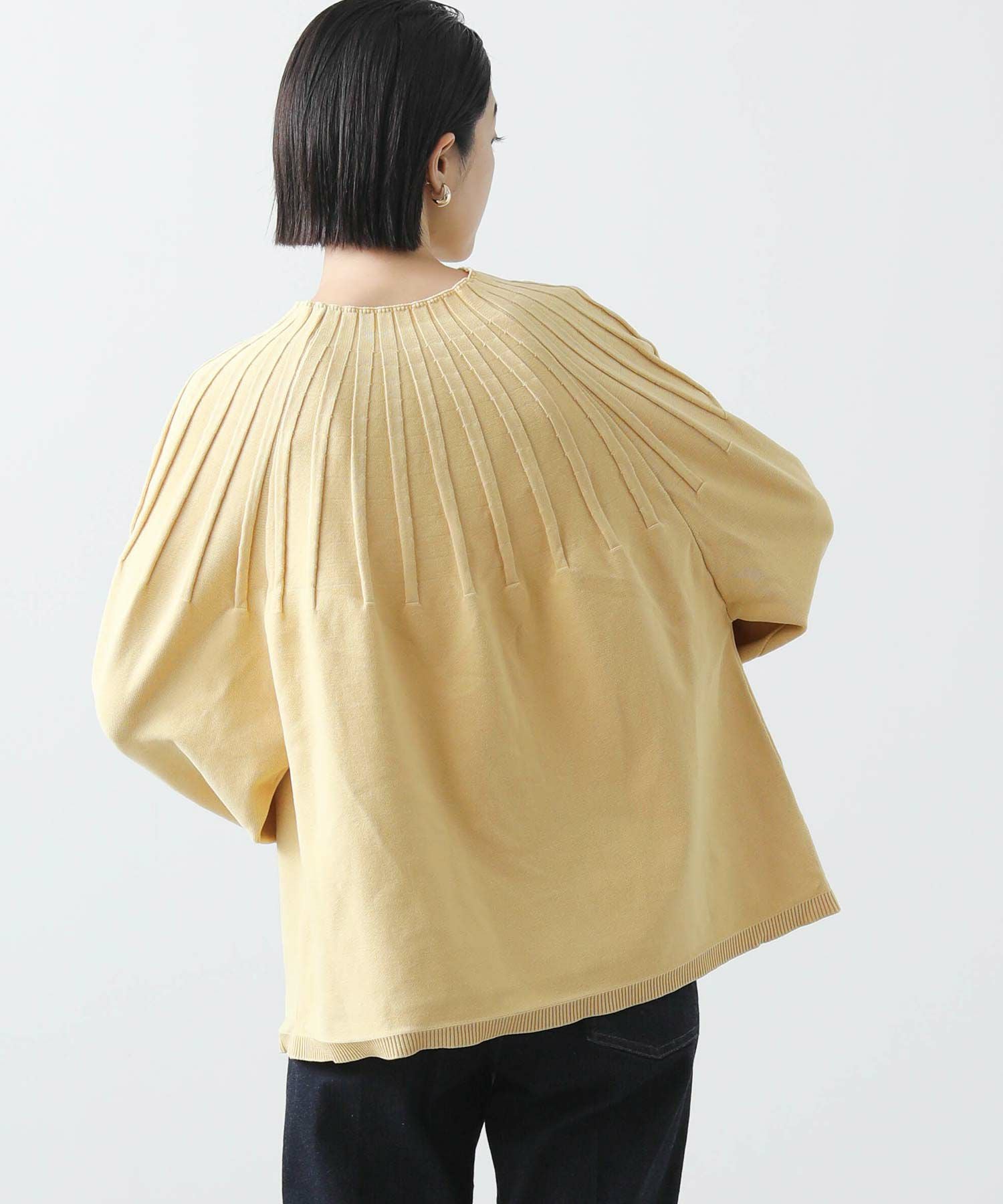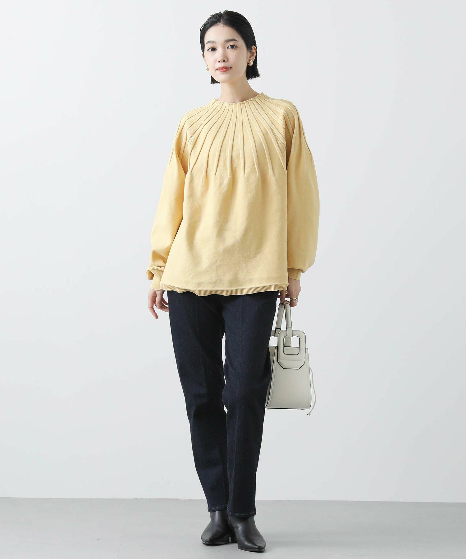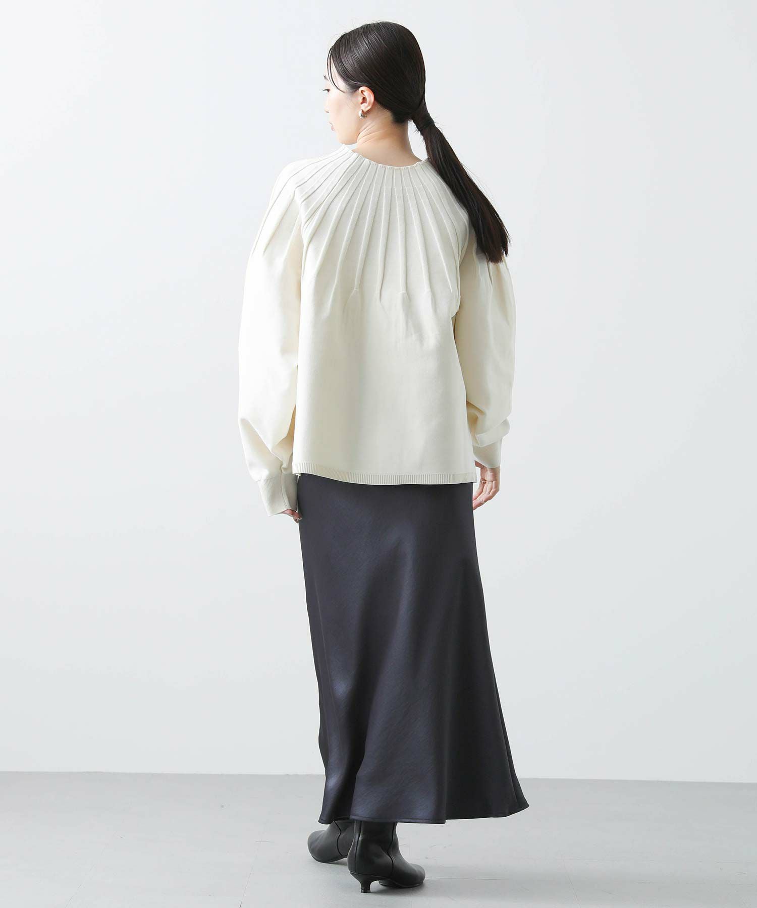 ハイネックに沿って360度施された求心編みが目を惹くポイント。ラグランのパフスリーブでやや丸みのあるシルエットが可愛らしさのある1枚。