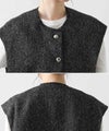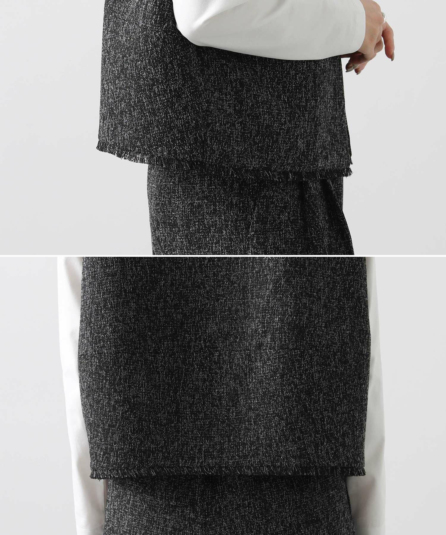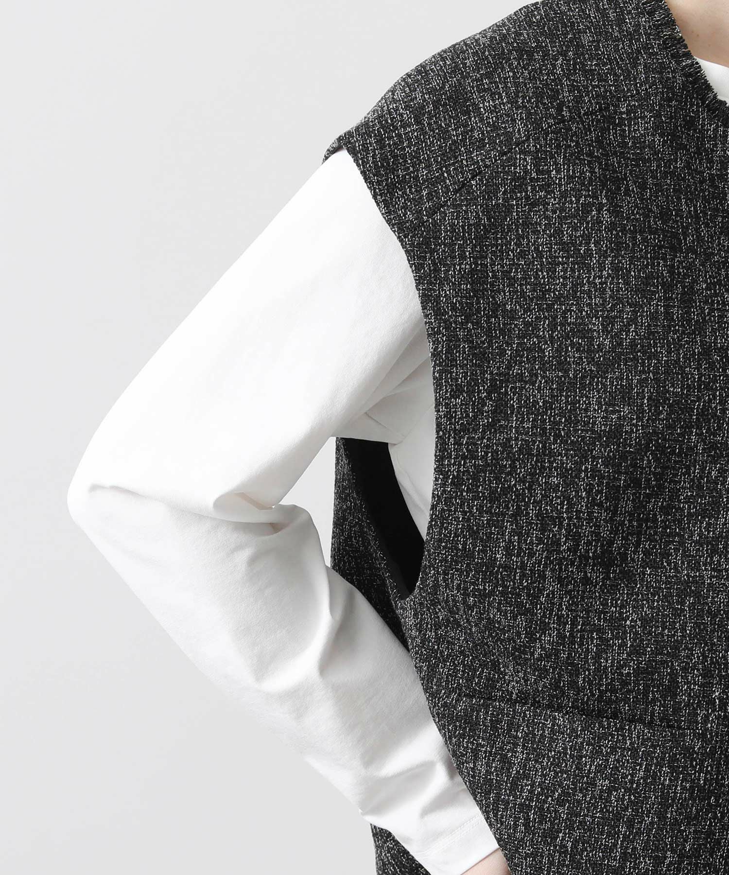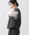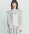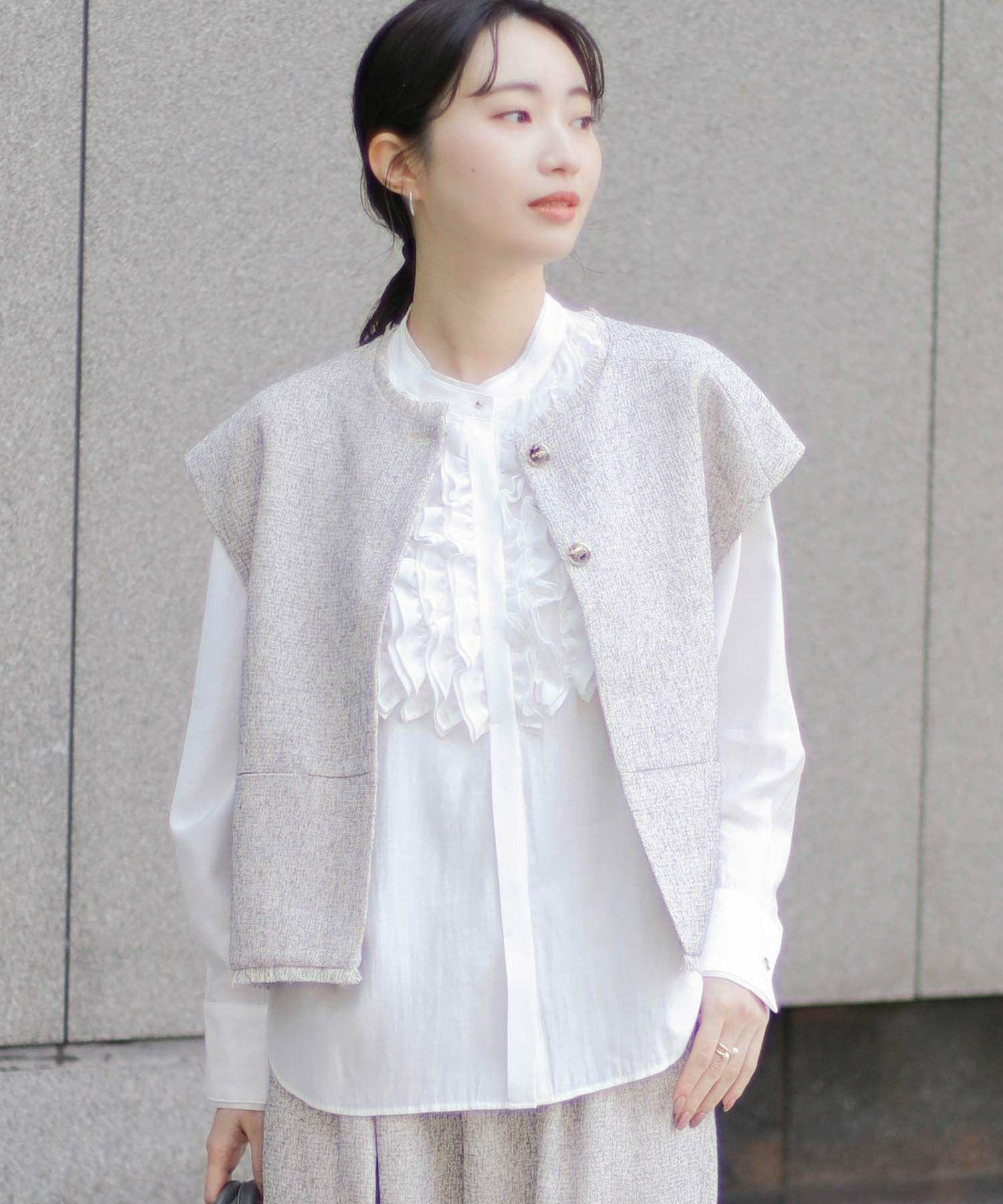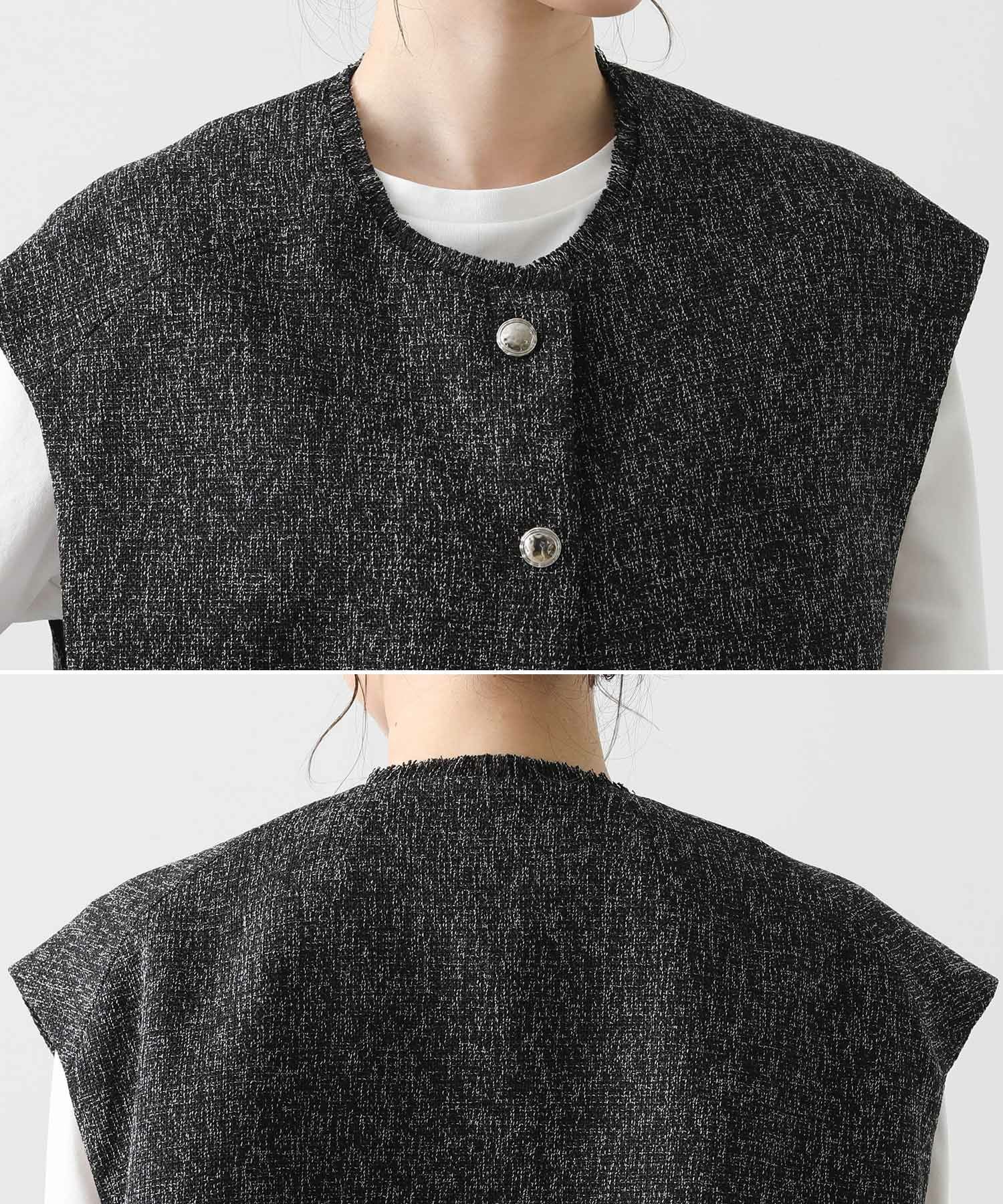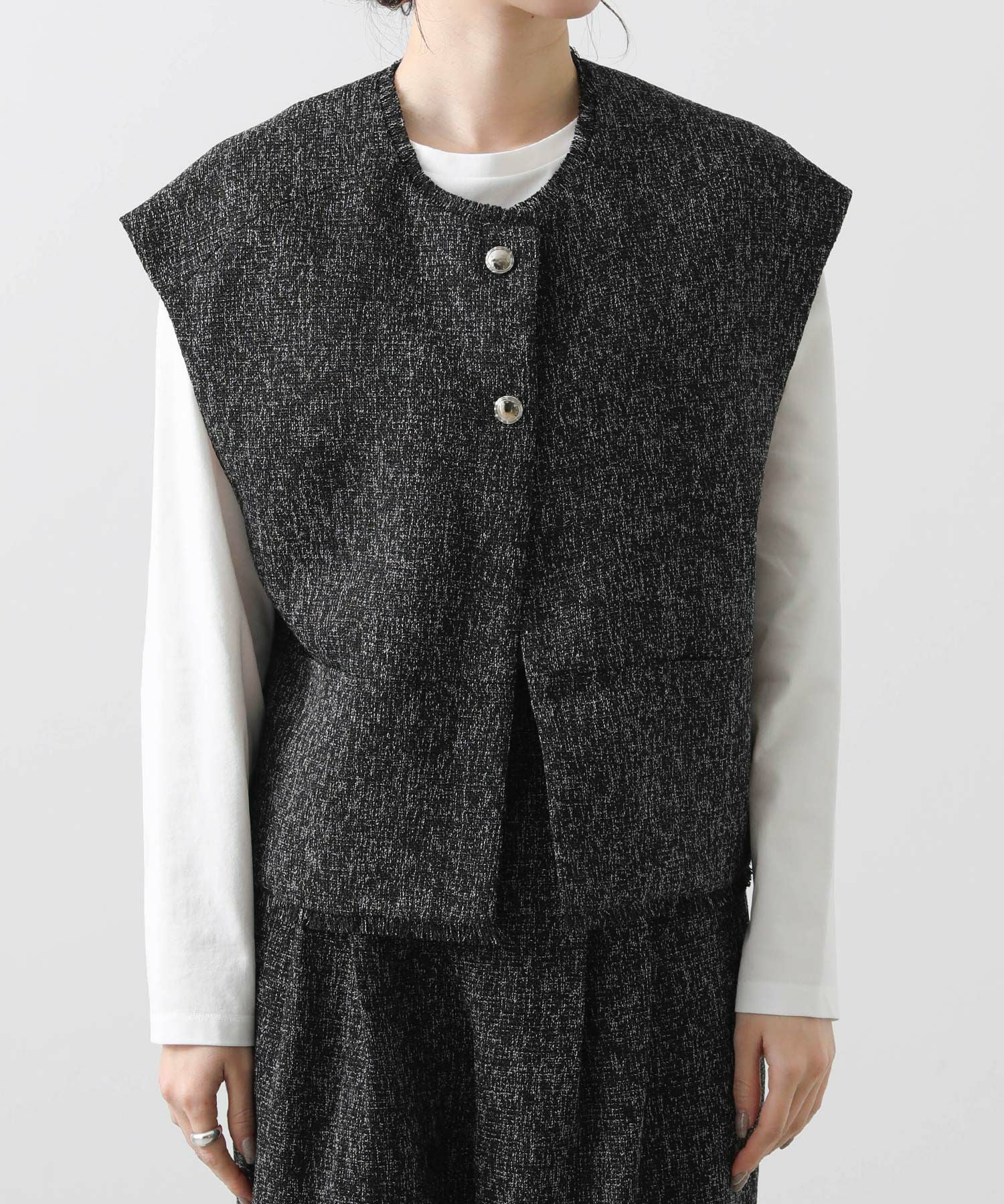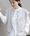 細かく織られたツイード素材を使用したショートジレは、程よくゆったりとした丸みのあるシルエットが柔らかい印象に見せ、ツイードの上品さもプラスされ女性らしさが光る一枚。肩先が隠れるフレンチスリーブで、スリーブレストップスとしても着やすいデザインです。