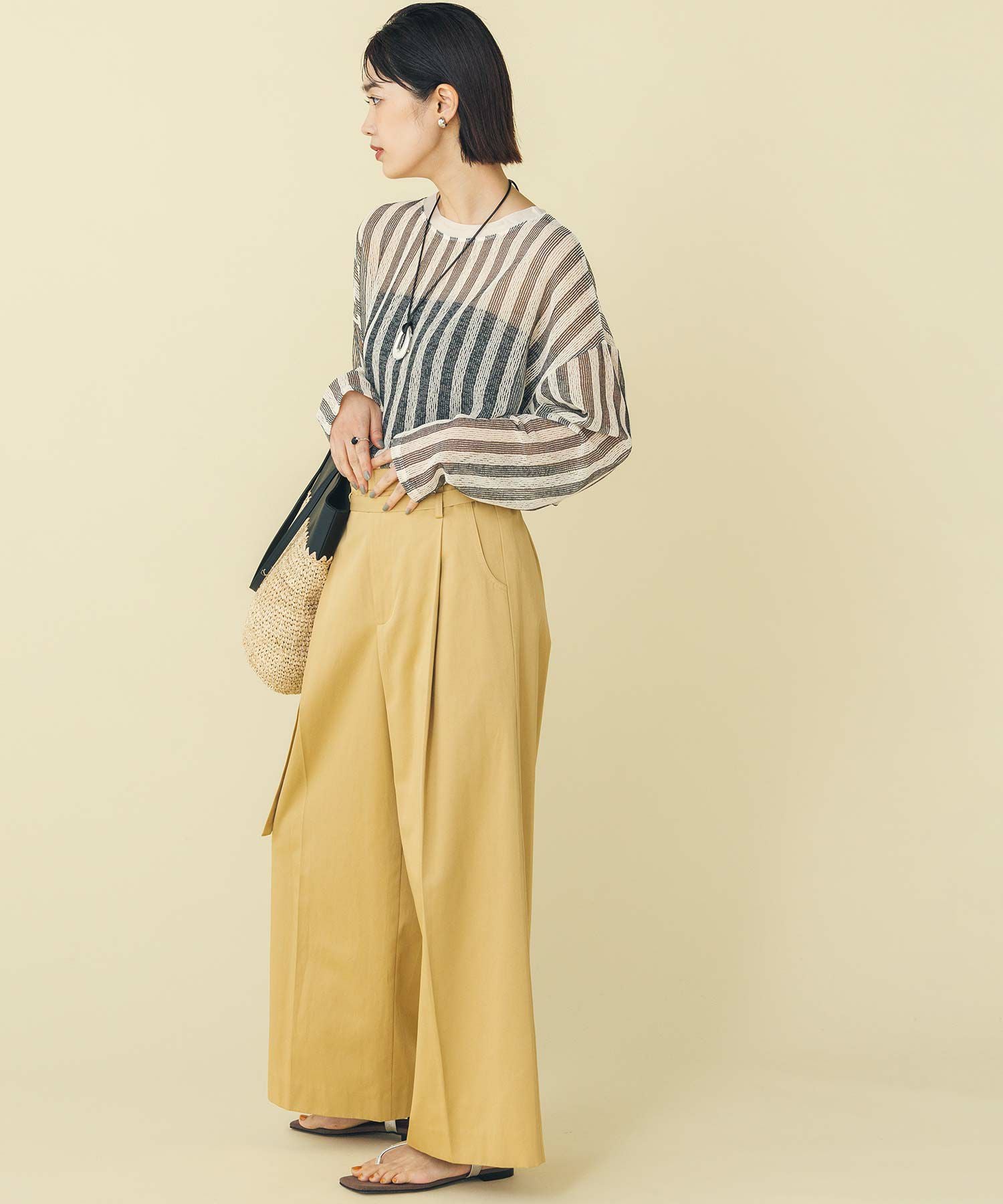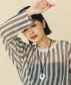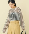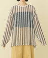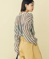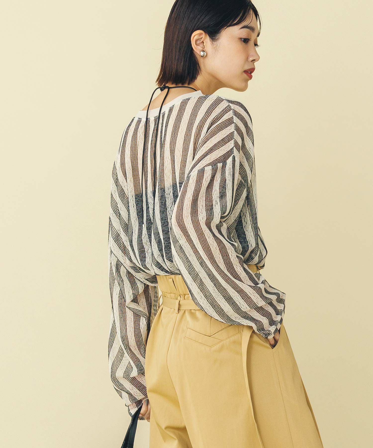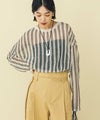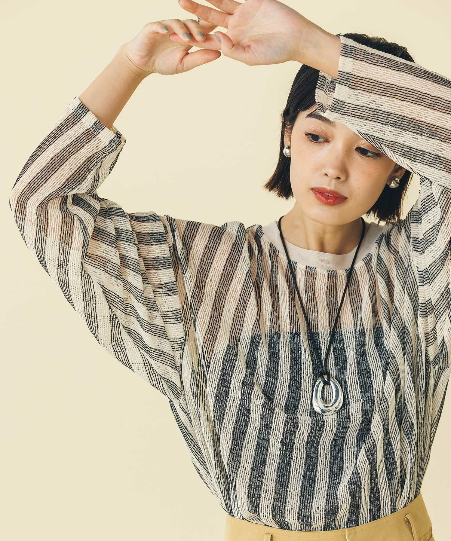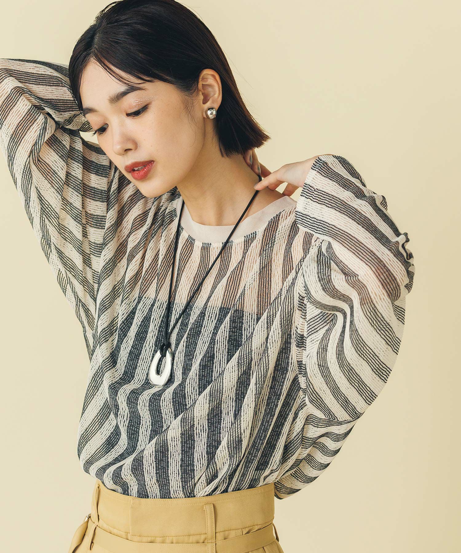 ワイドストライプが目を惹くシアー素材のプルオーバーカットソー。衿ぐりにチュールを施しデコルテラインにも抜け感を出しました。