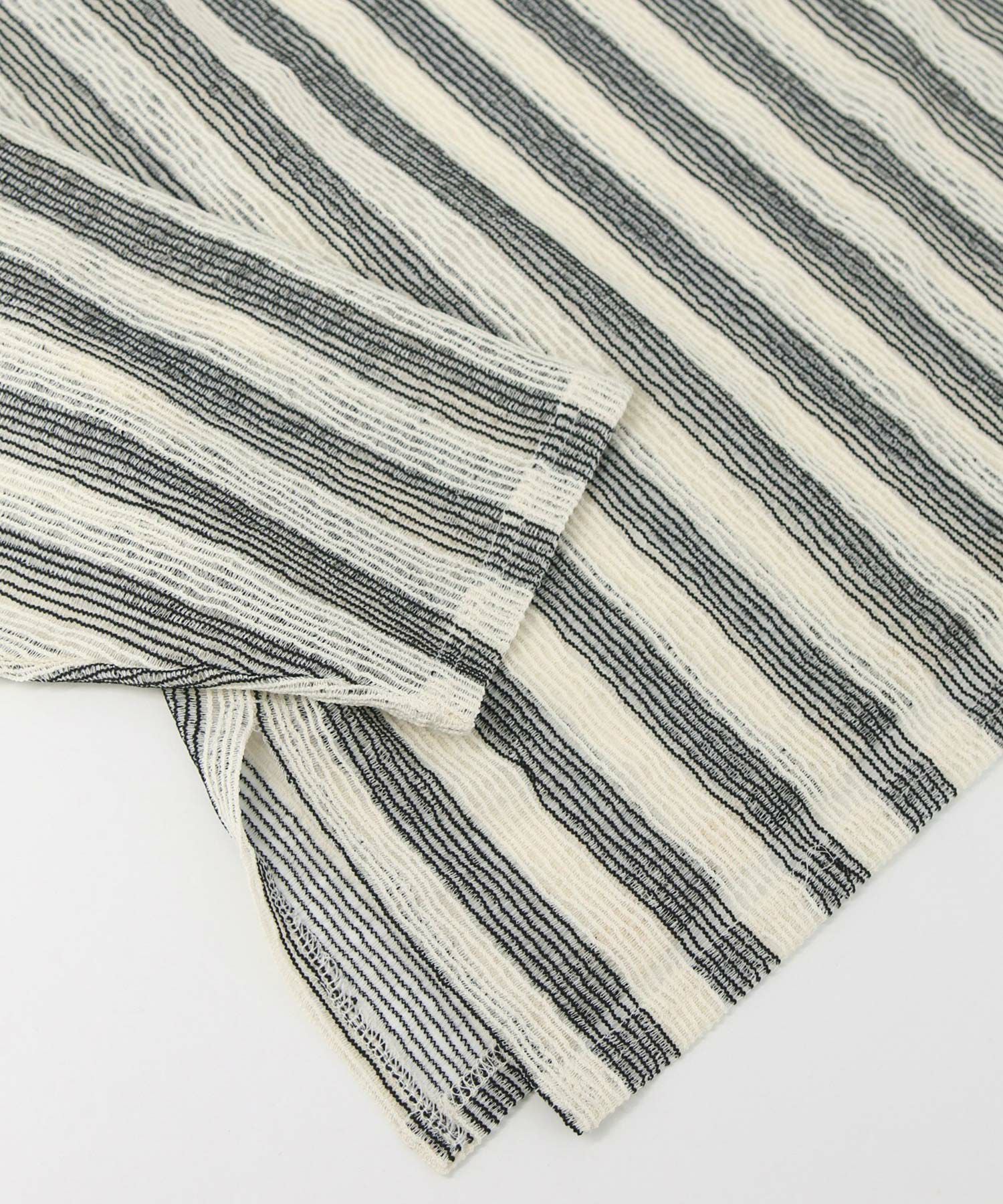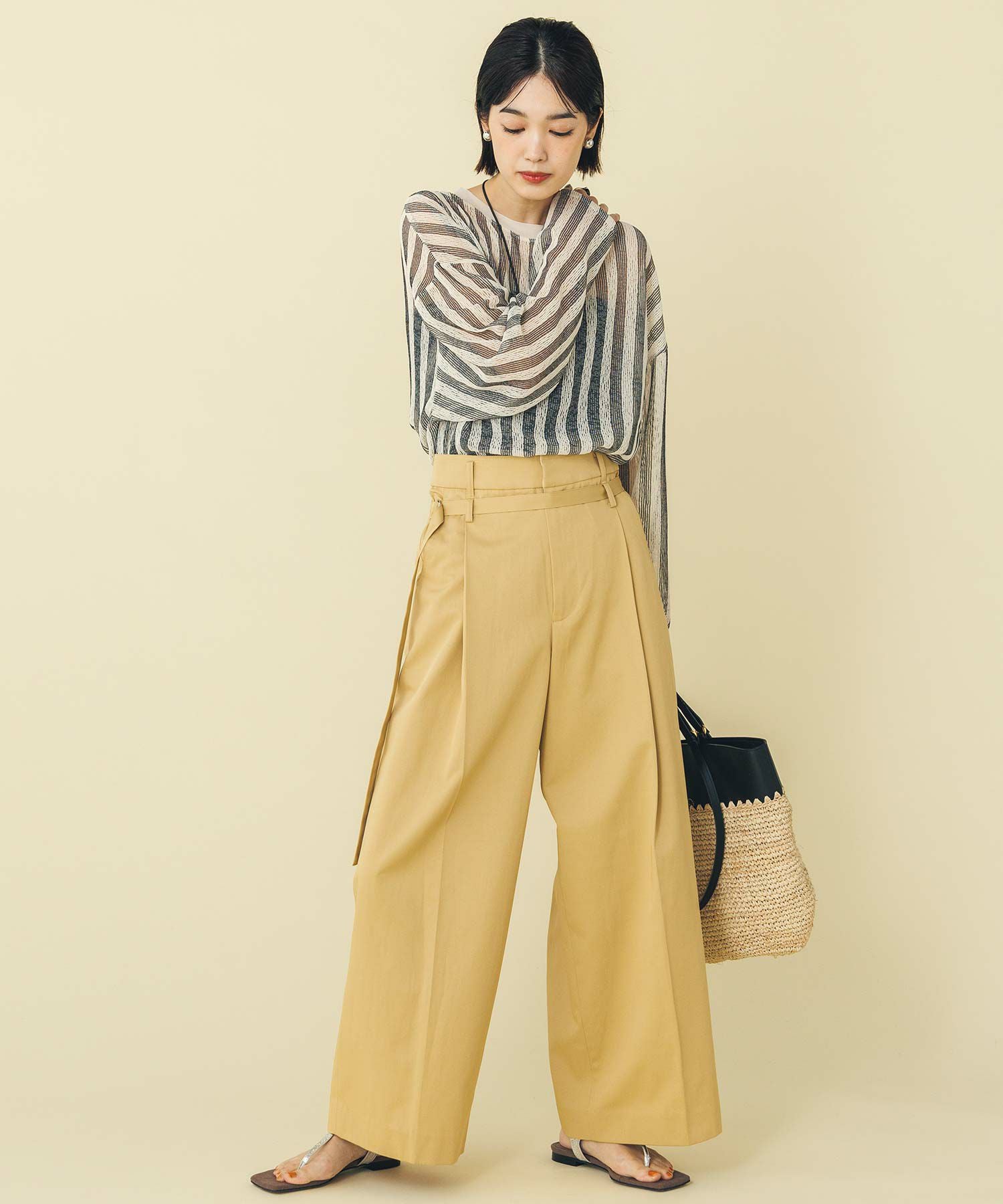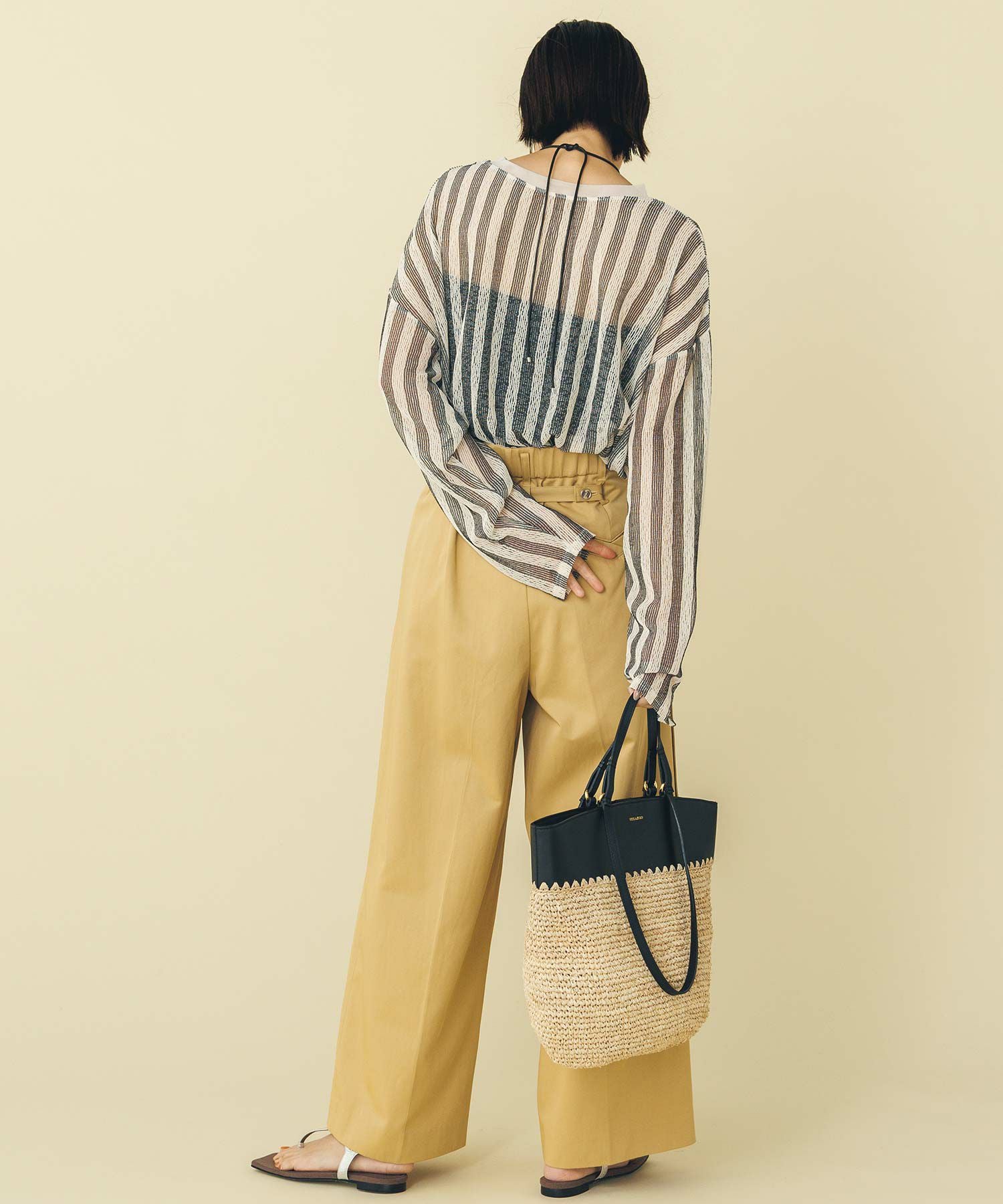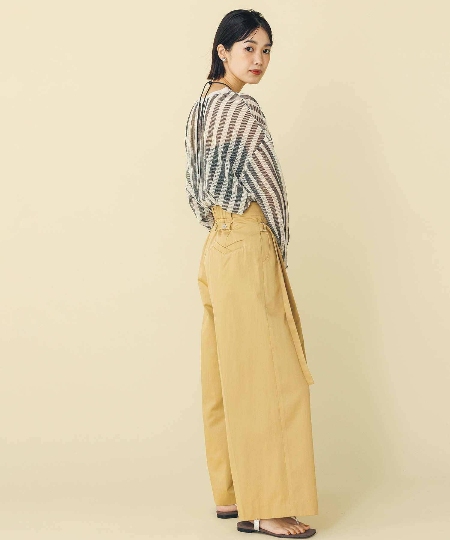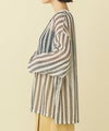 ワイドストライプが目を惹くシアー素材のプルオーバーカットソー。衿ぐりにチュールを施しデコルテラインにも抜け感を出しました。
