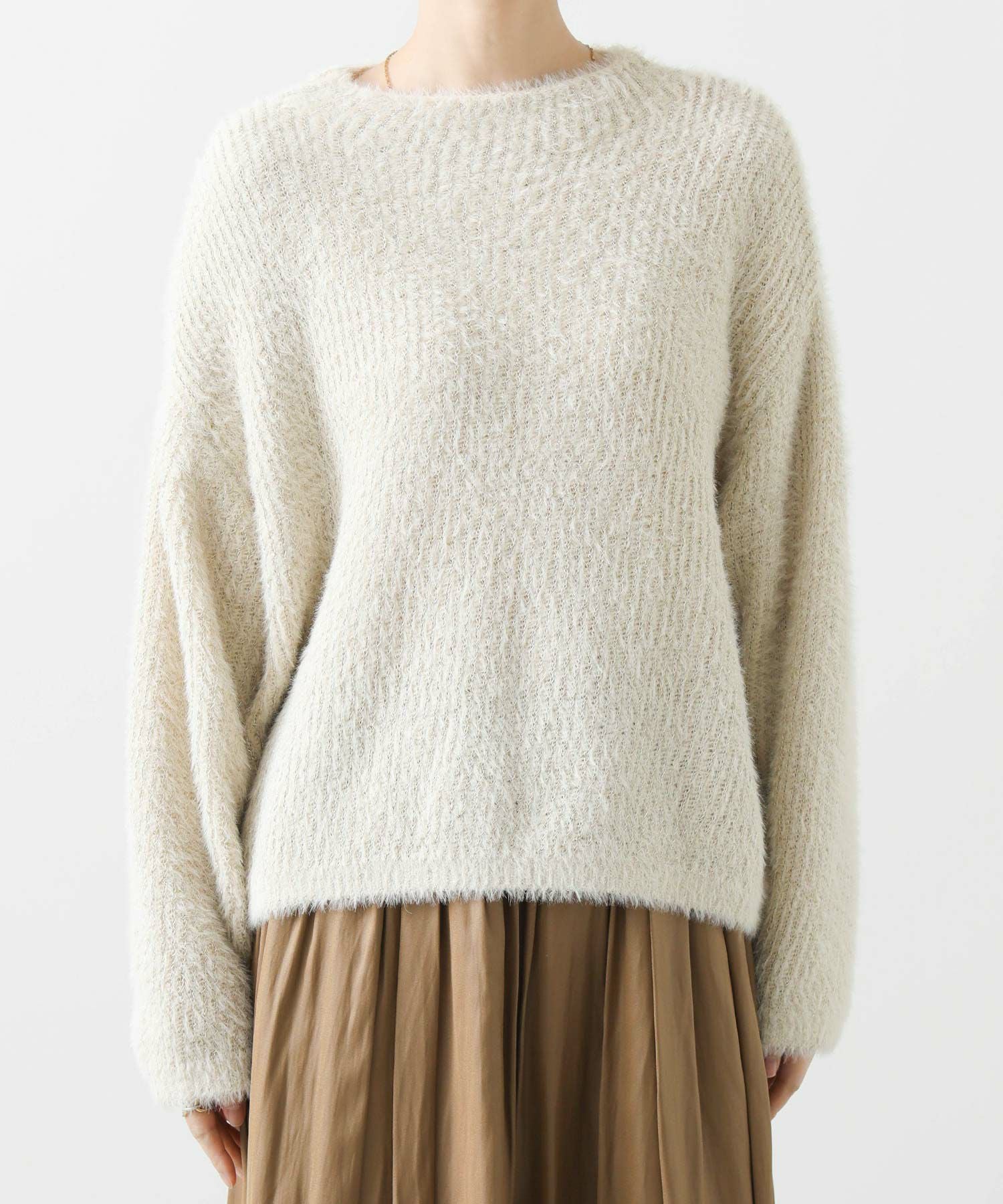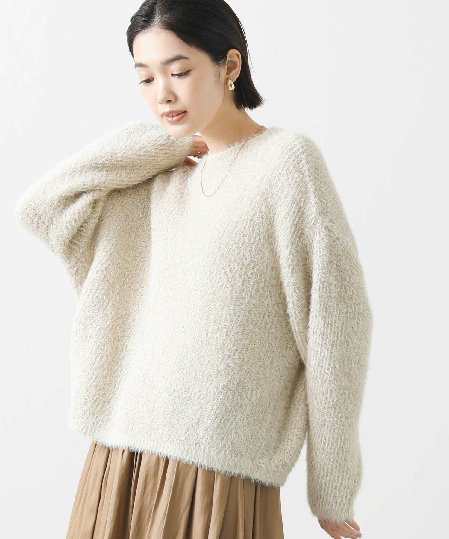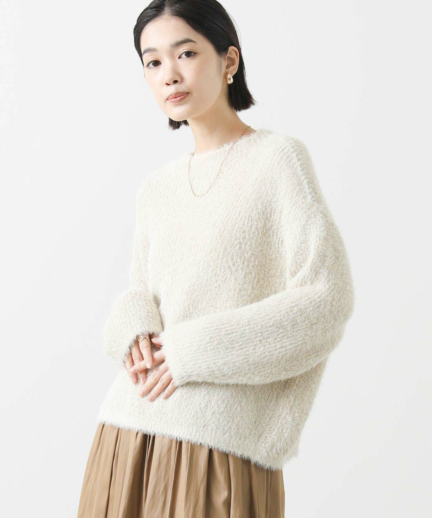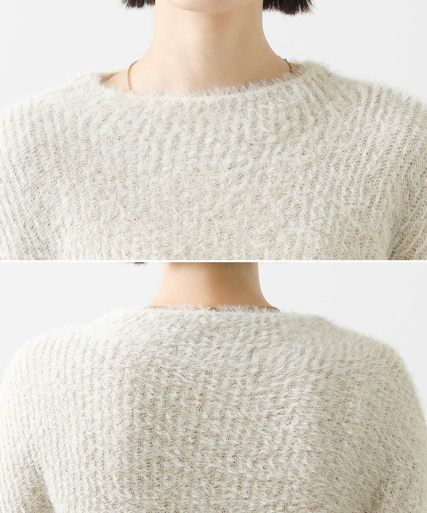 ふわふわのフェザー×キラキラニット編みが素敵なニットプルオーバー。毛足のあるフェザーヤーンと上品な光沢のアビガイルの糸を使用し編み立てた、柔らかな着心地の1枚。