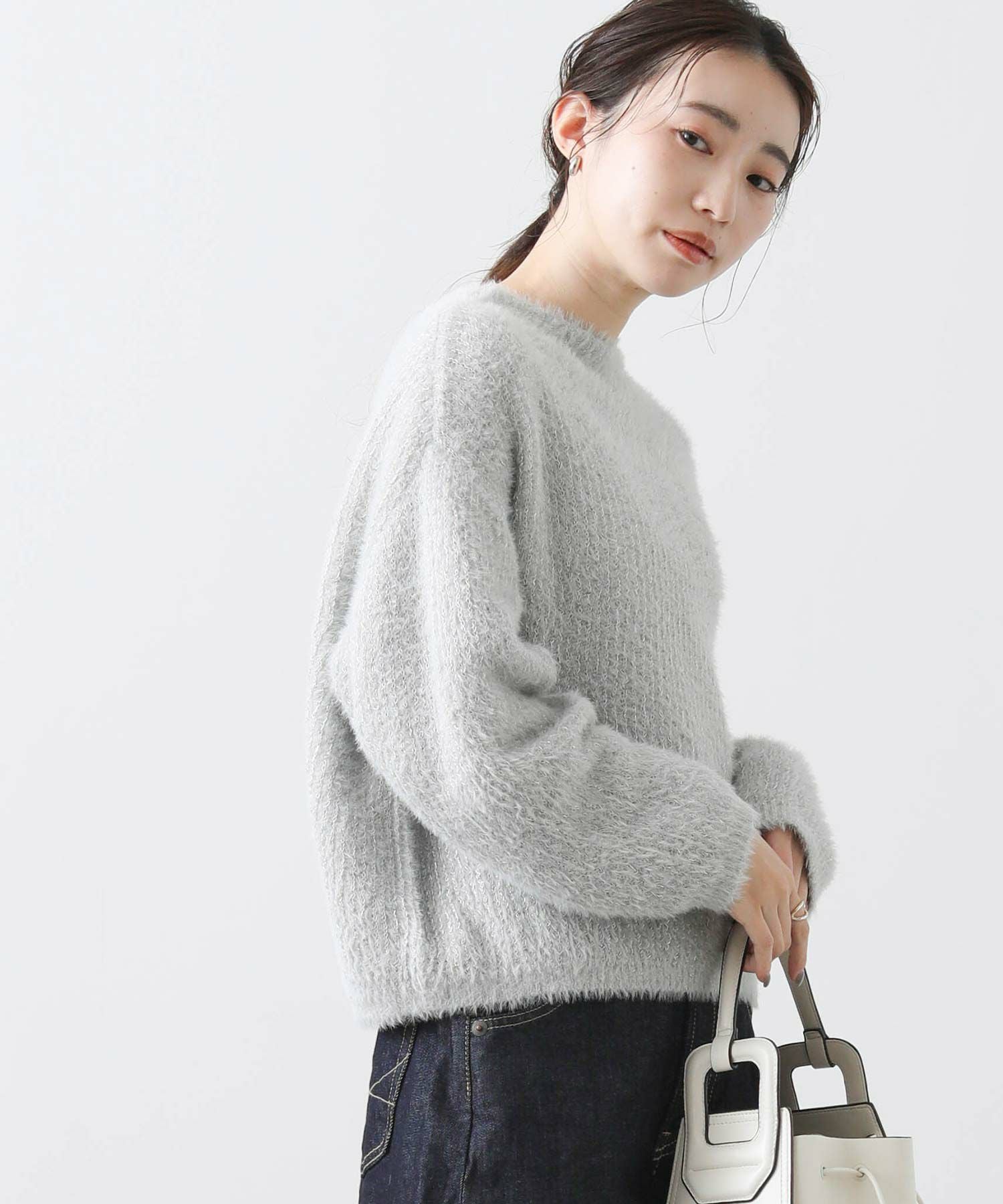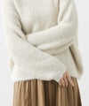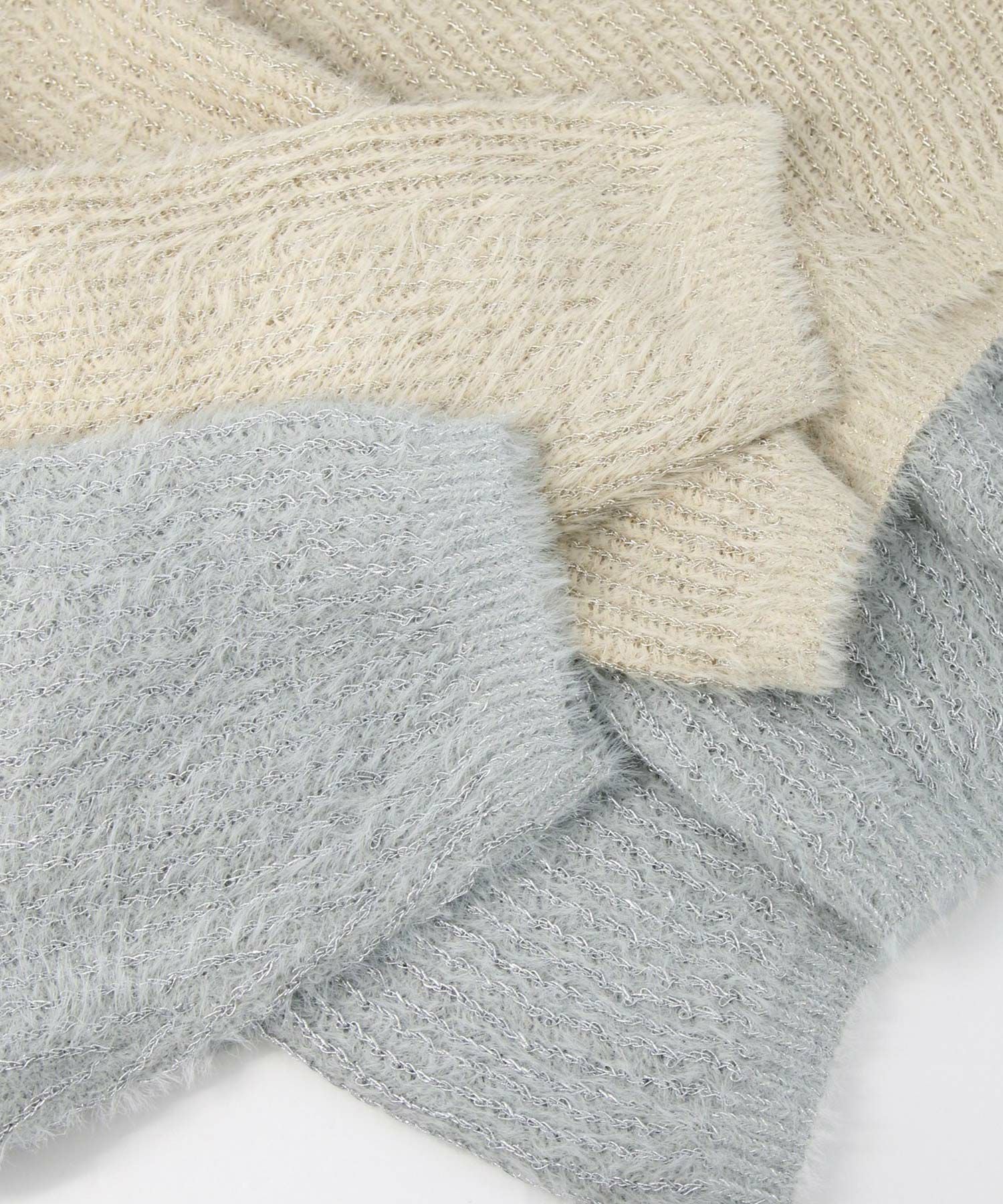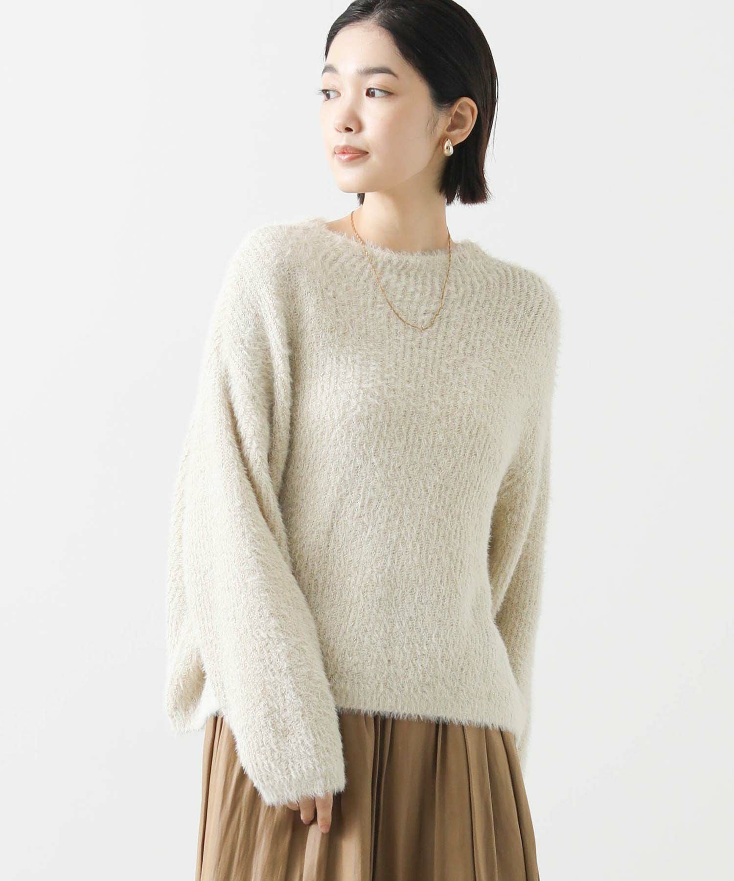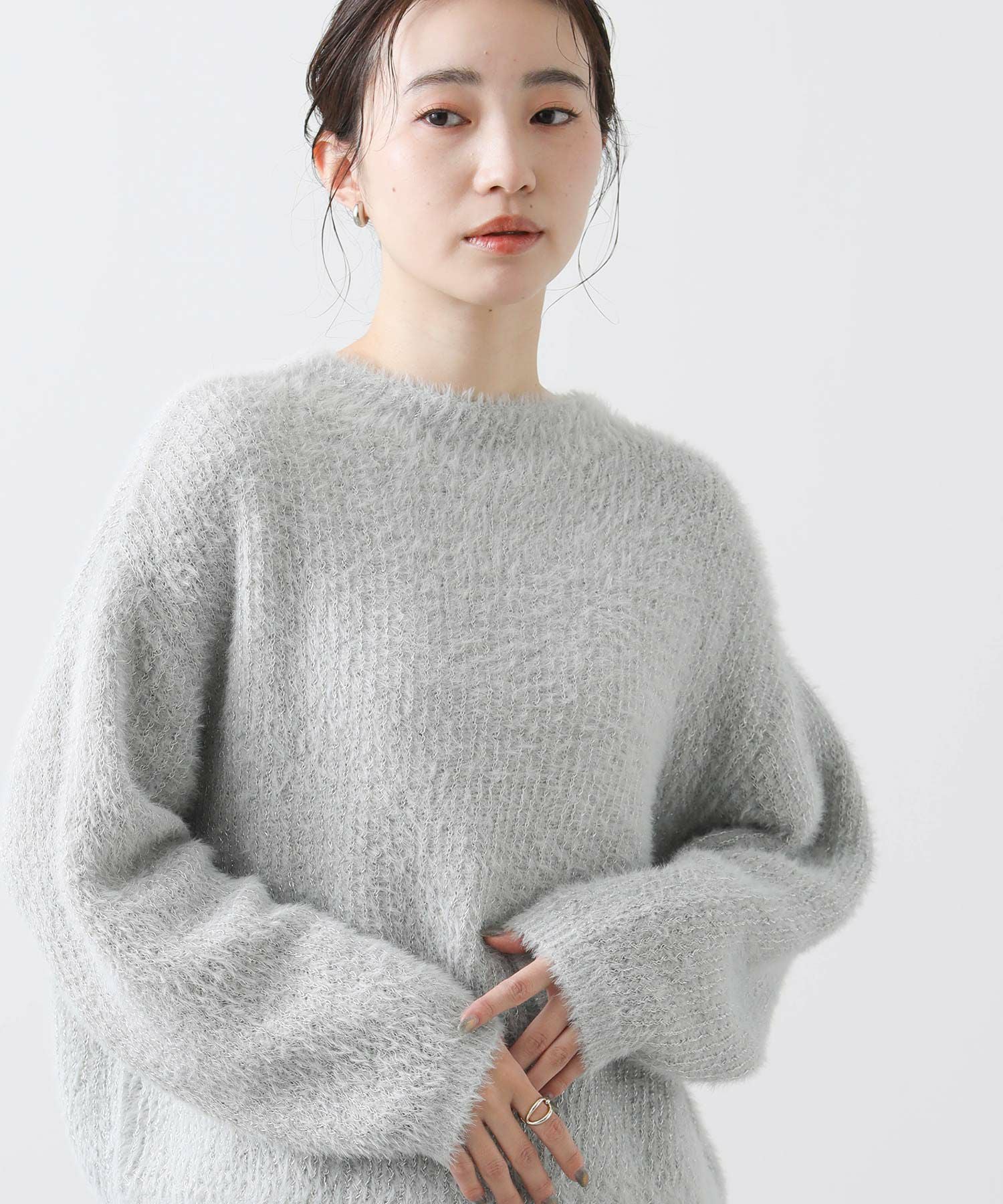 ふわふわのフェザー×キラキラニット編みが素敵なニットプルオーバー。毛足のあるフェザーヤーンと上品な光沢のアビガイルの糸を使用し編み立てた、柔らかな着心地の1枚。