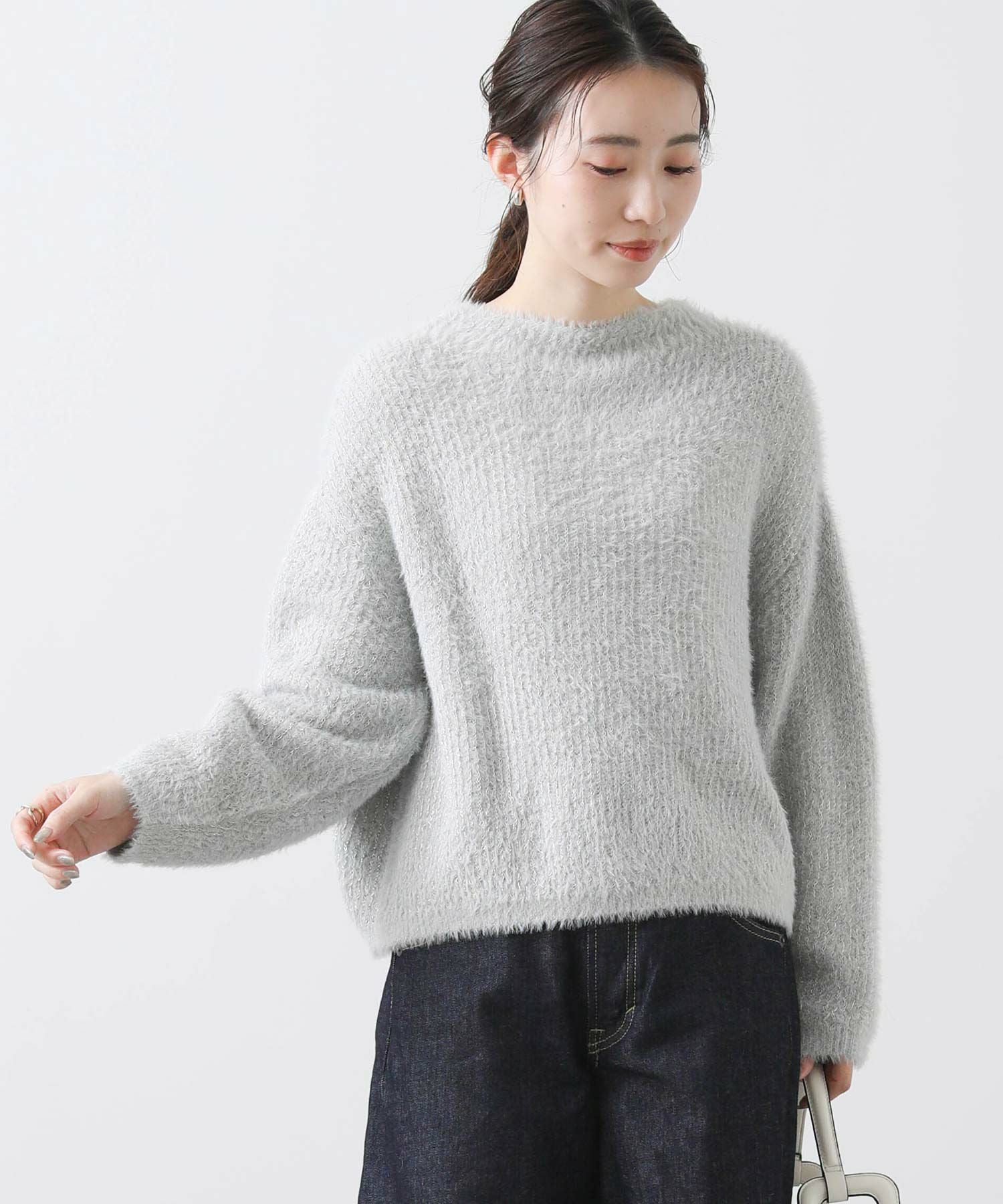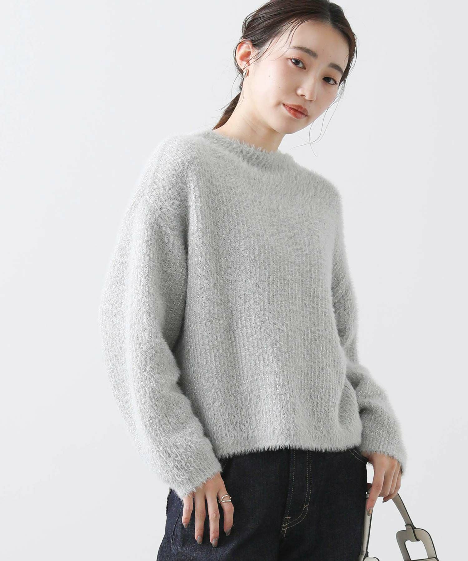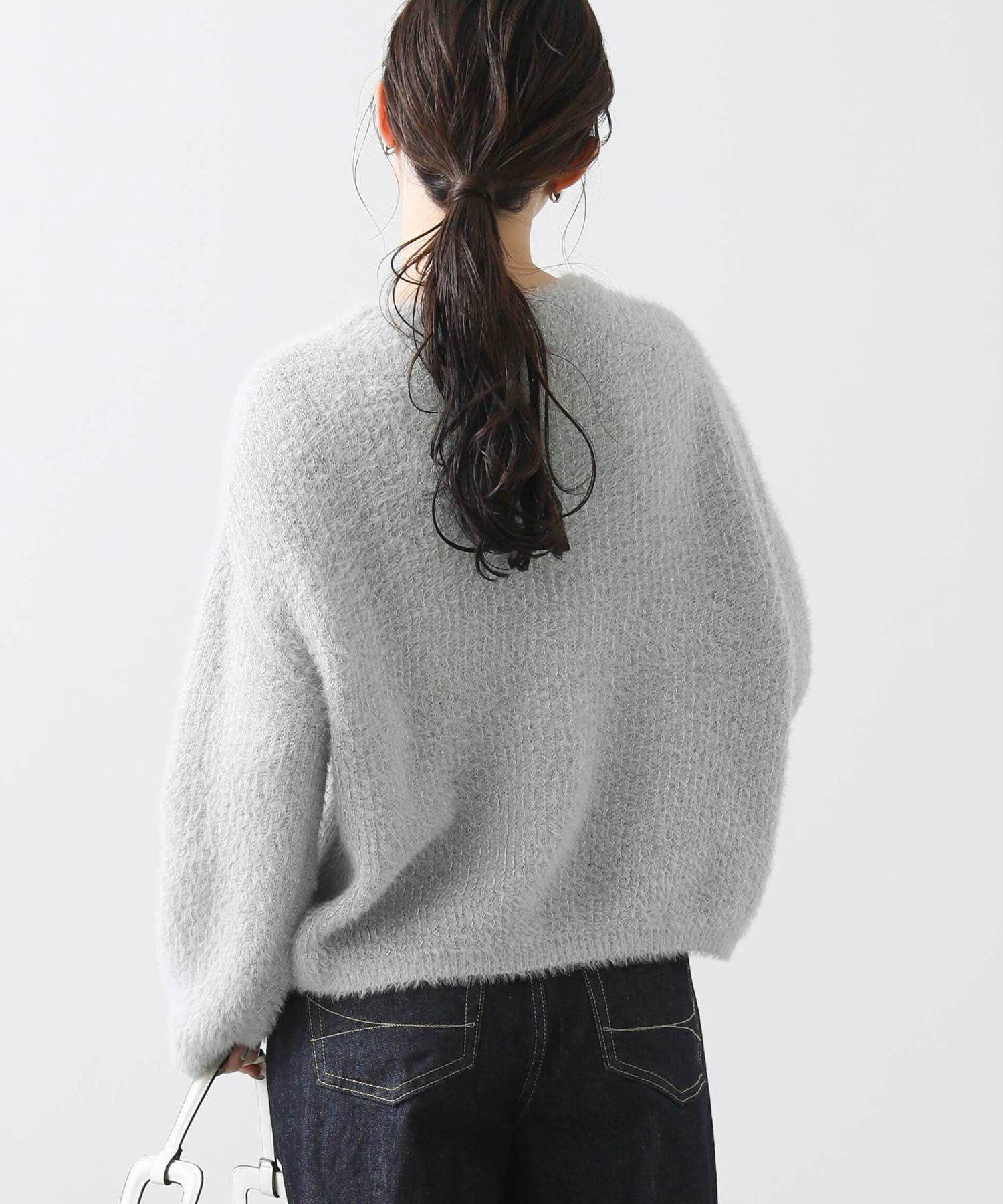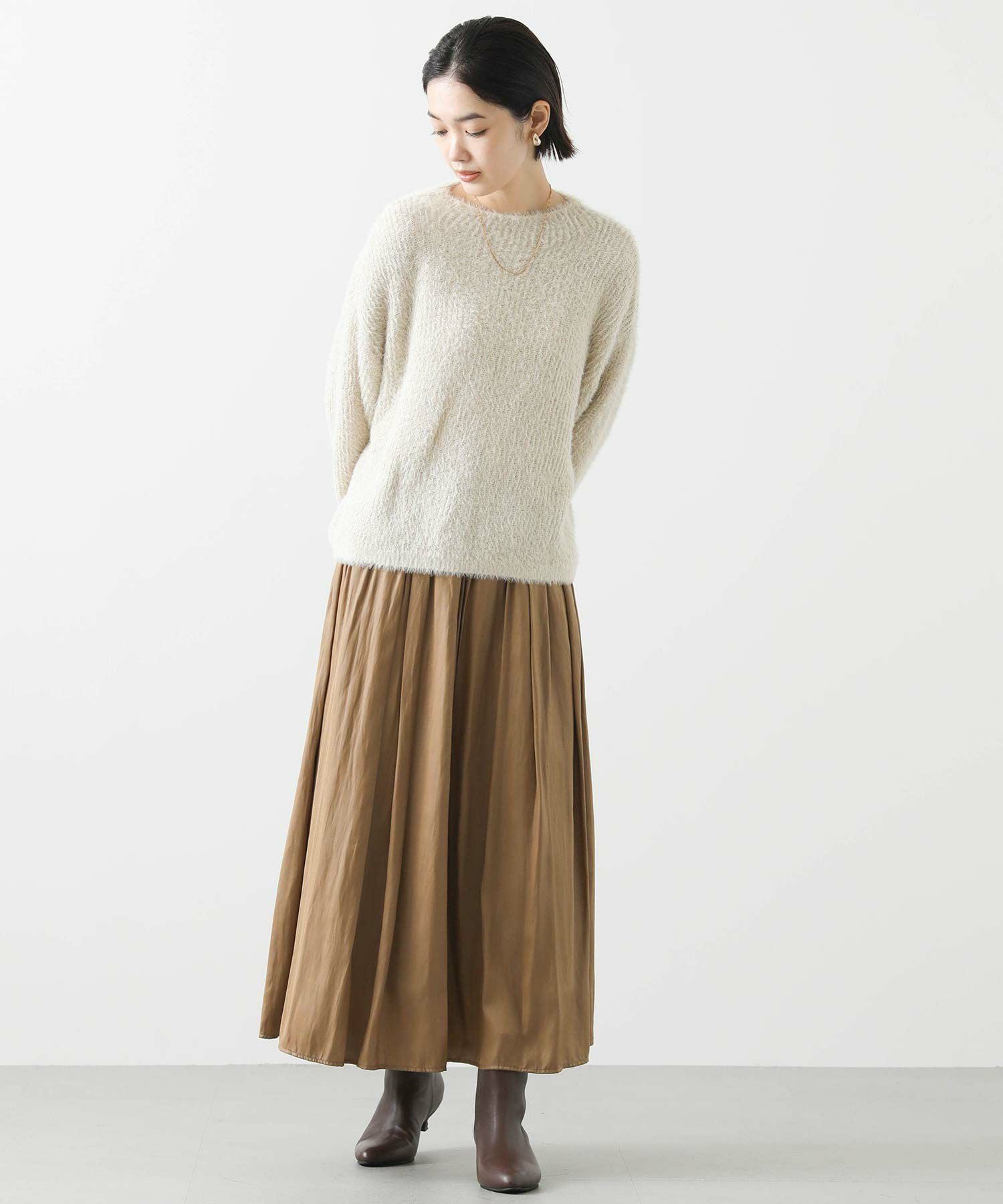 ふわふわのフェザー×キラキラニット編みが素敵なニットプルオーバー。毛足のあるフェザーヤーンと上品な光沢のアビガイルの糸を使用し編み立てた、柔らかな着心地の1枚。