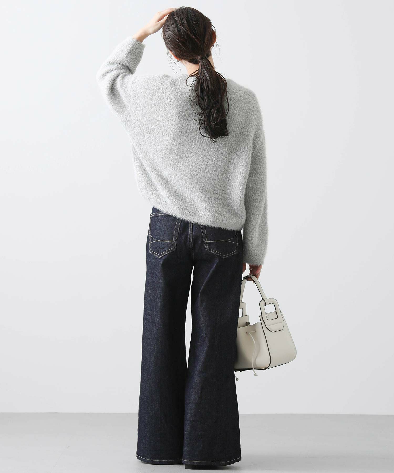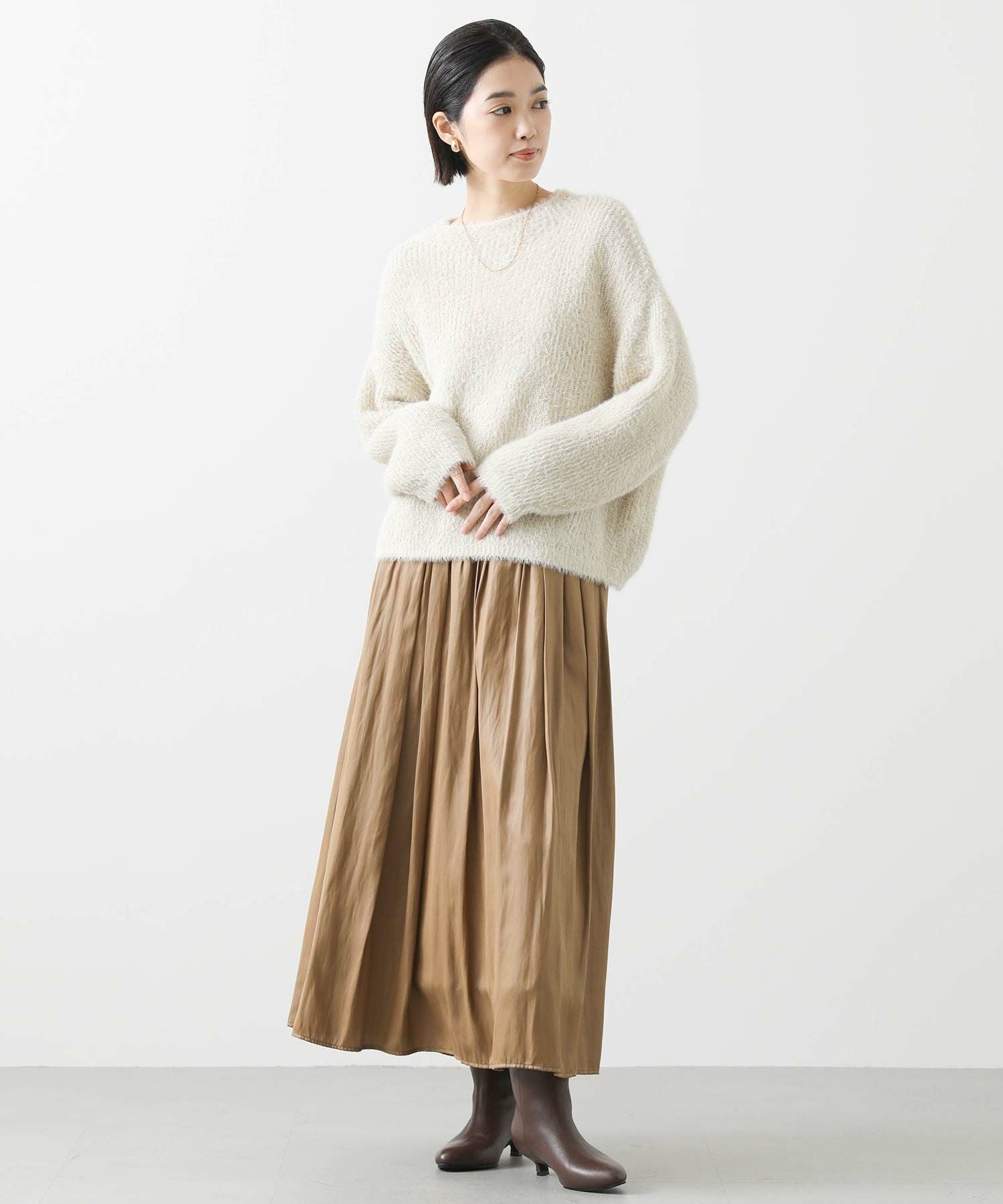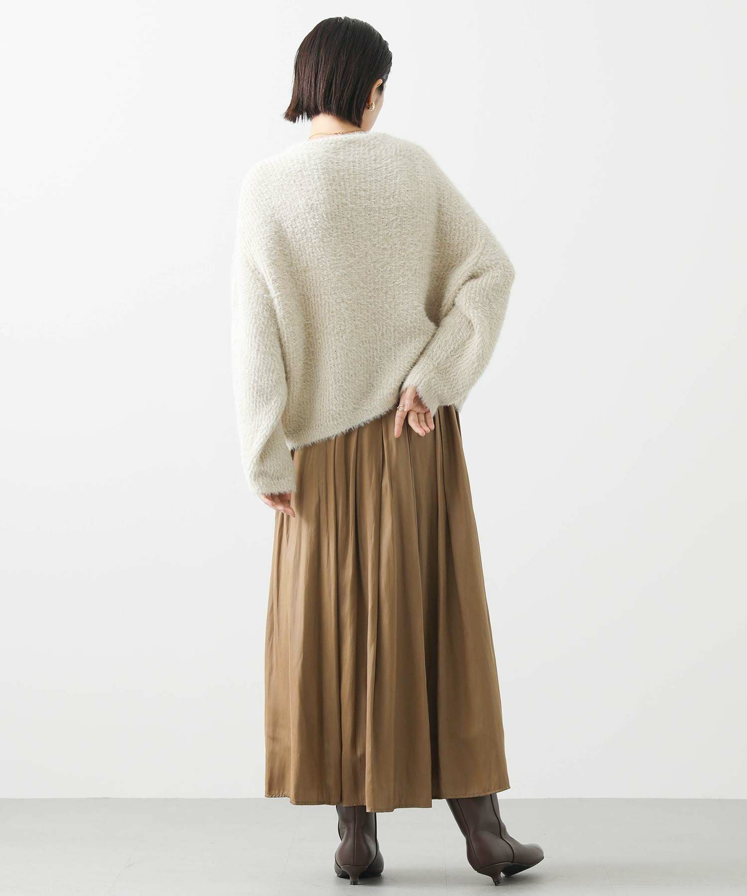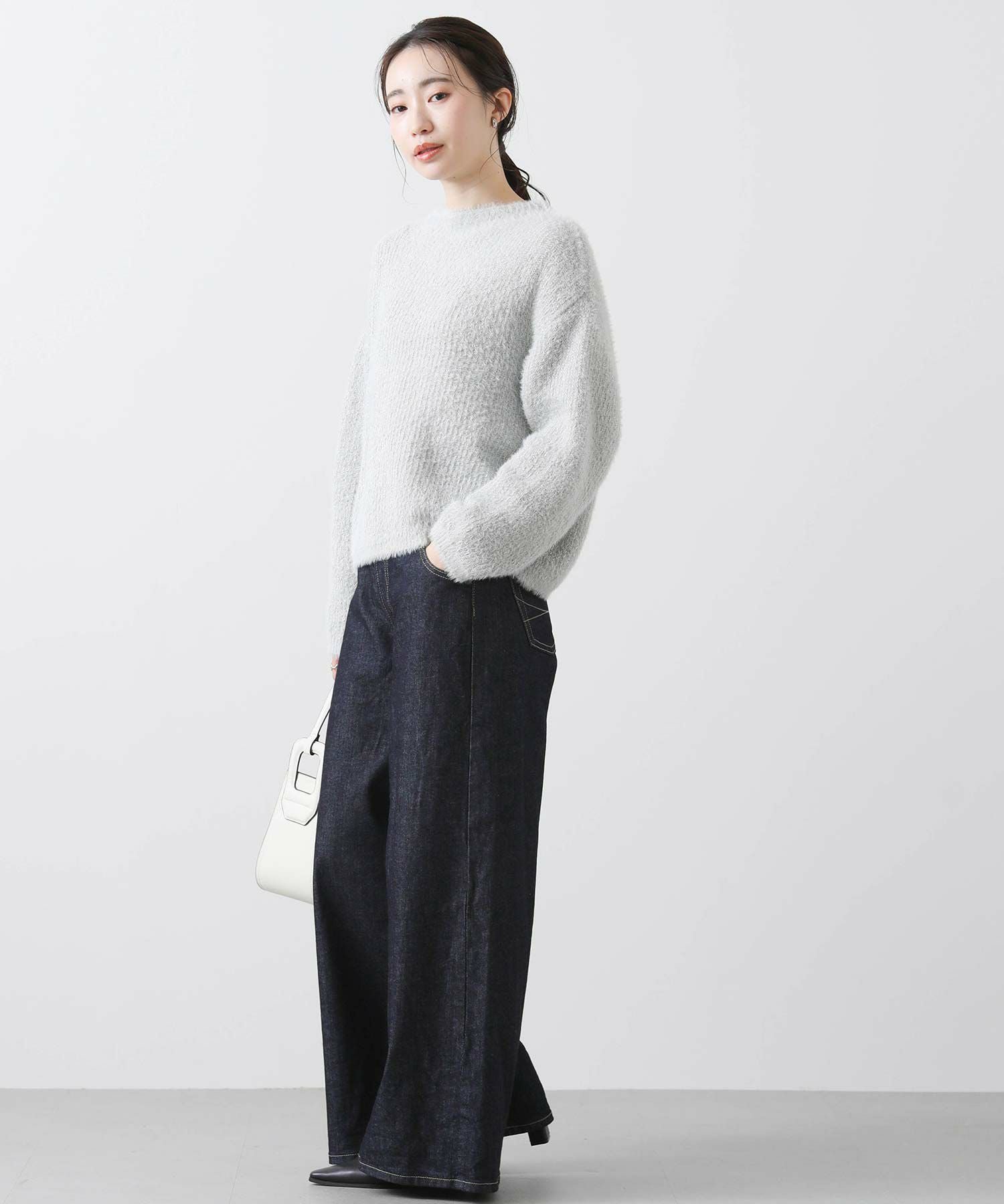 ふわふわのフェザー×キラキラニット編みが素敵なニットプルオーバー。毛足のあるフェザーヤーンと上品な光沢のアビガイルの糸を使用し編み立てた、柔らかな着心地の1枚。