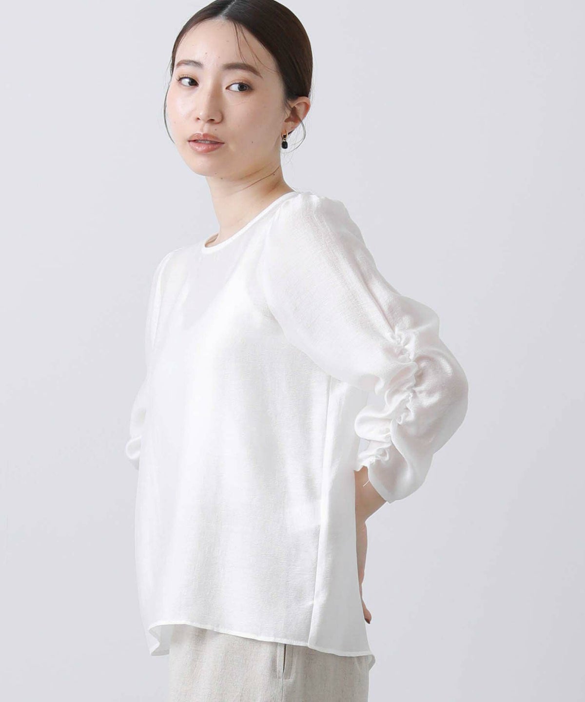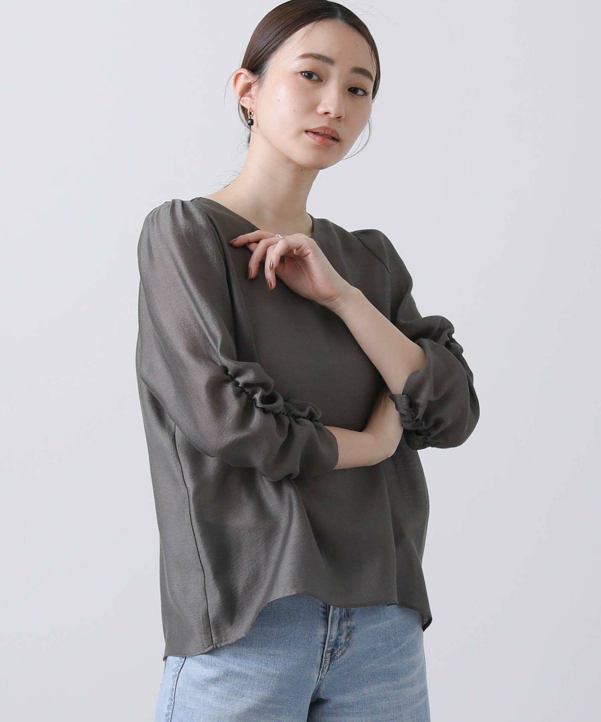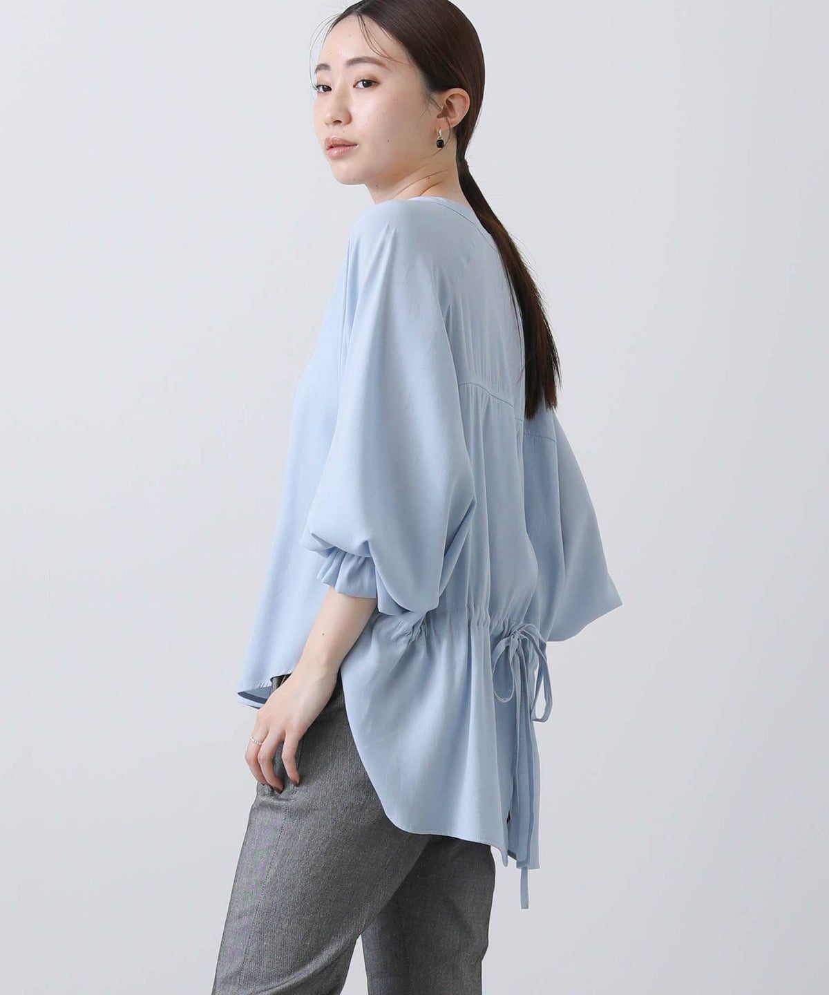 ギャザー7分袖クルーネックブラウス