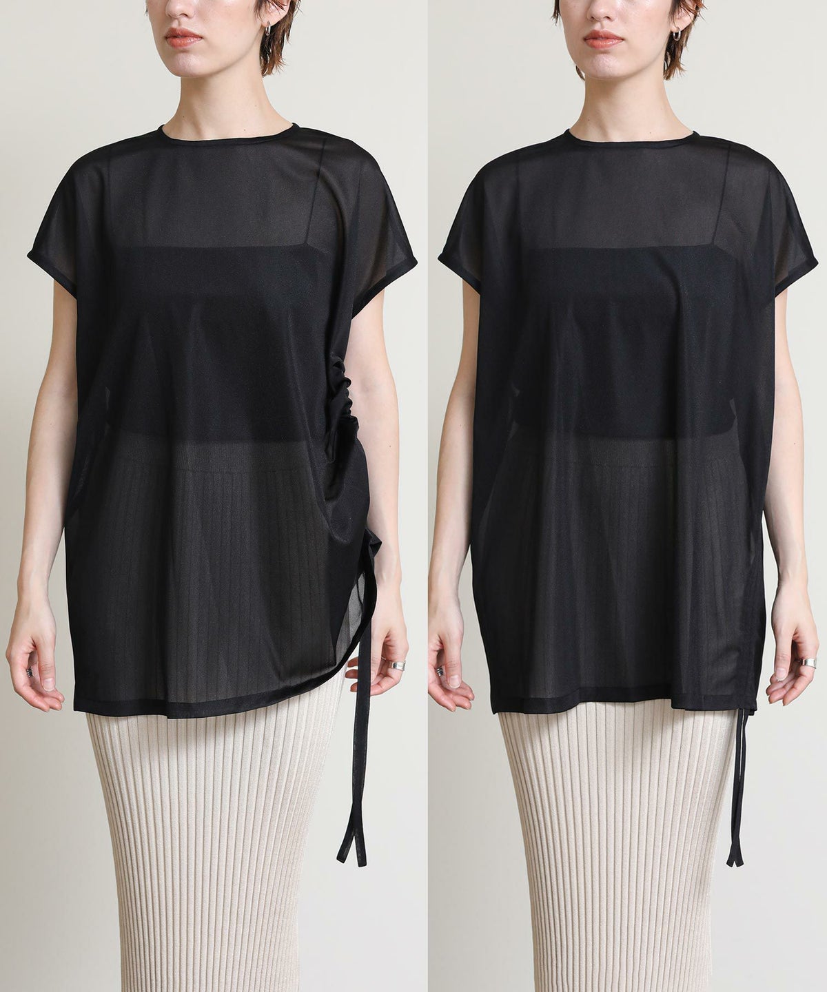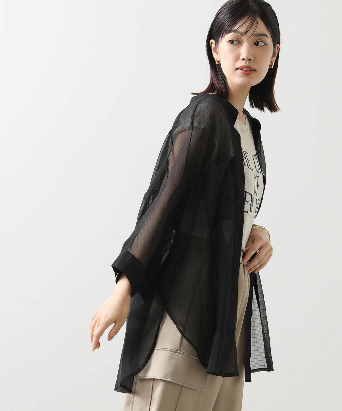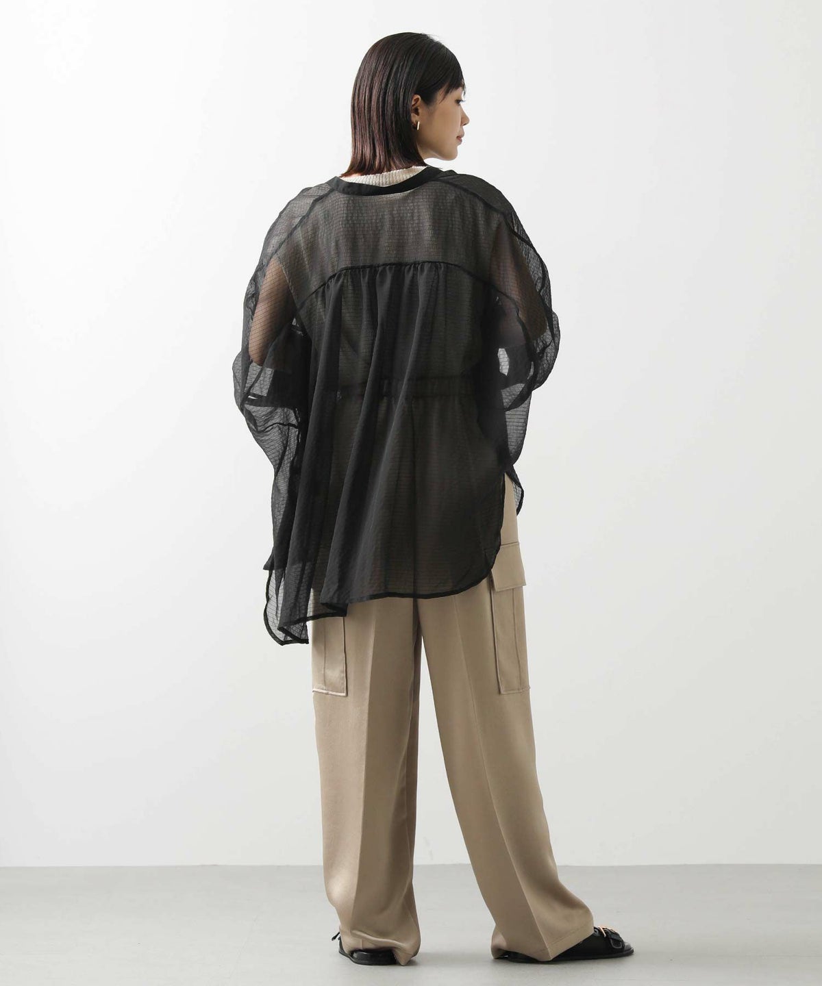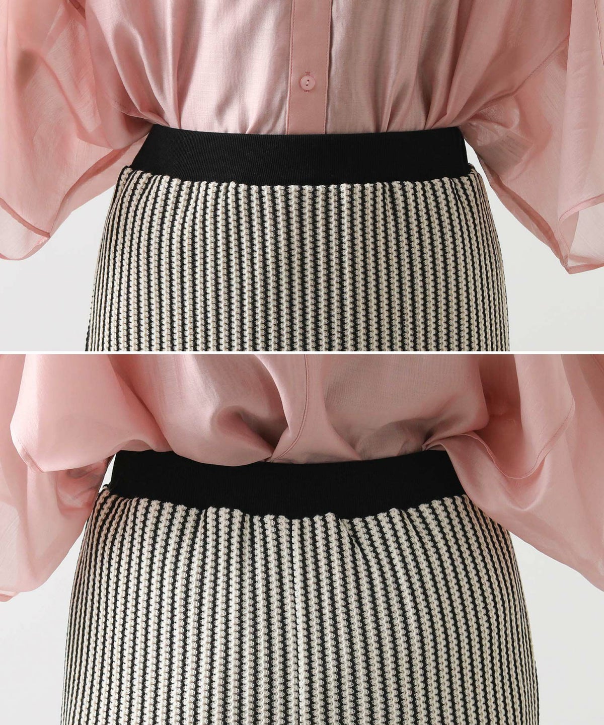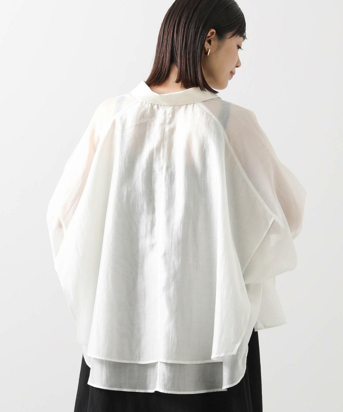 バイカラーシアーバンドネックブラウス