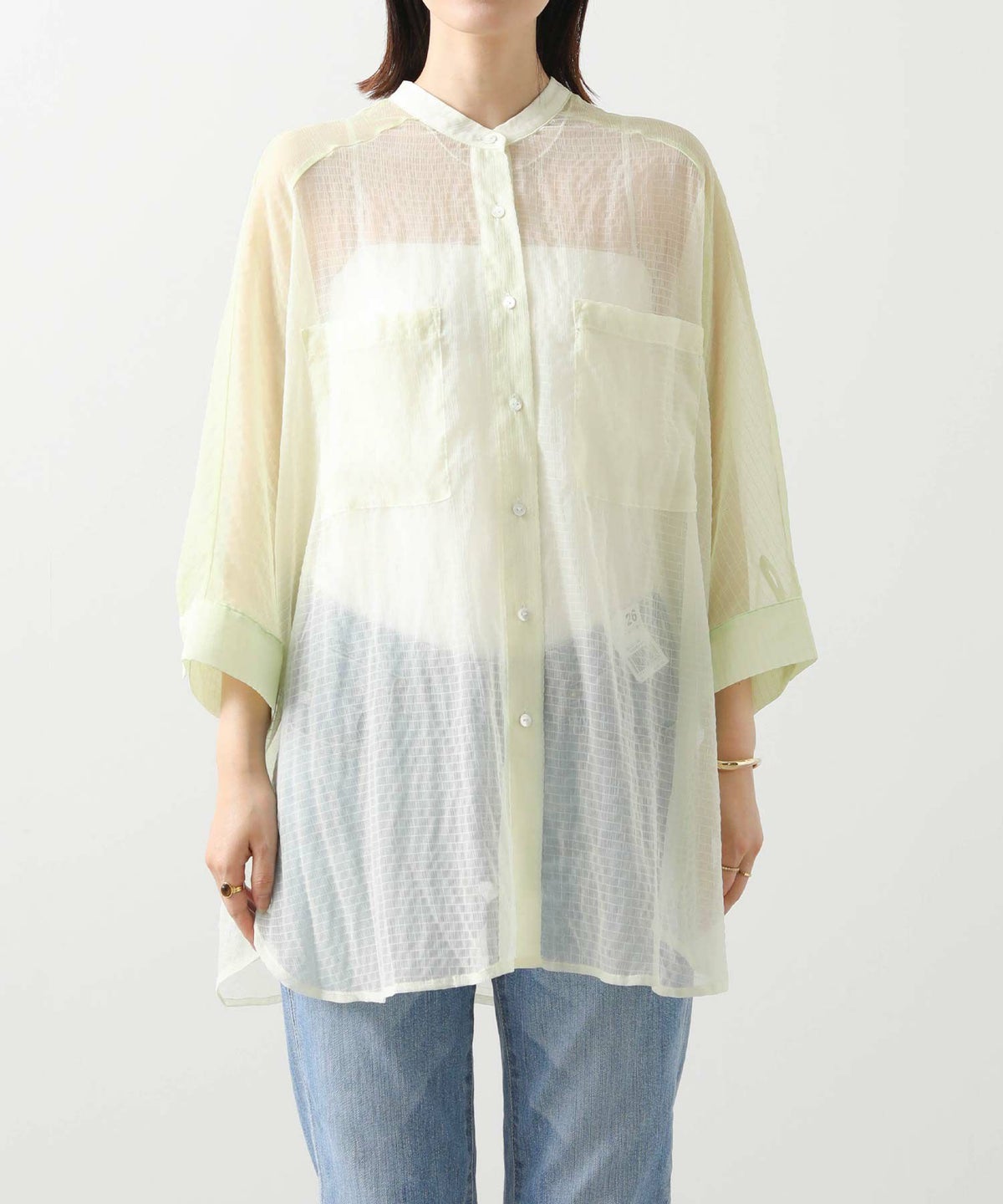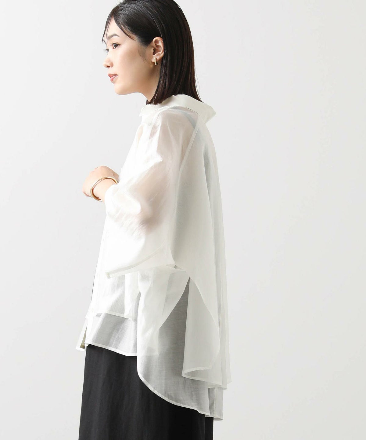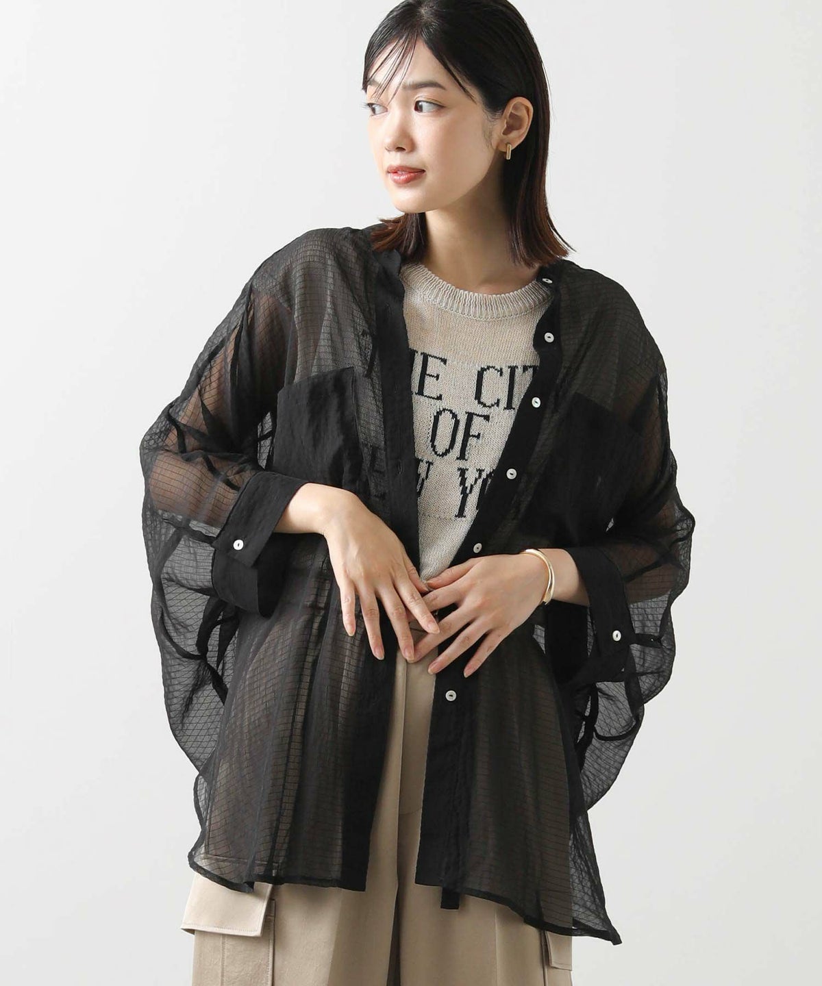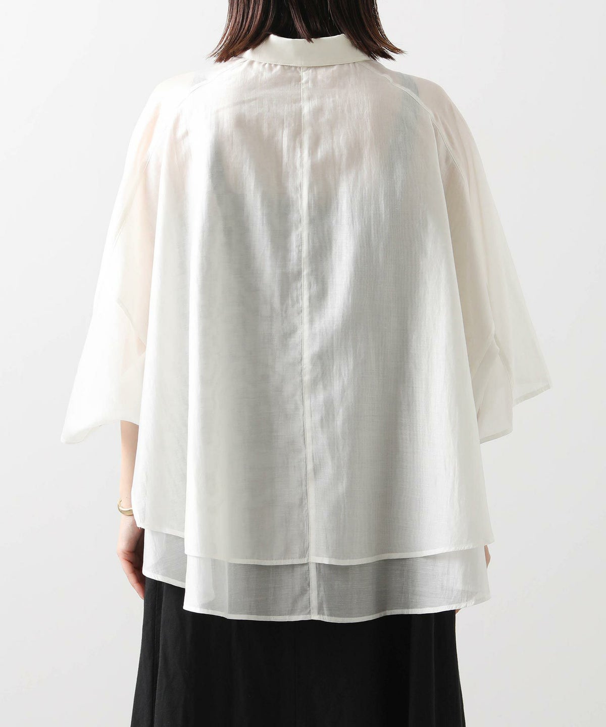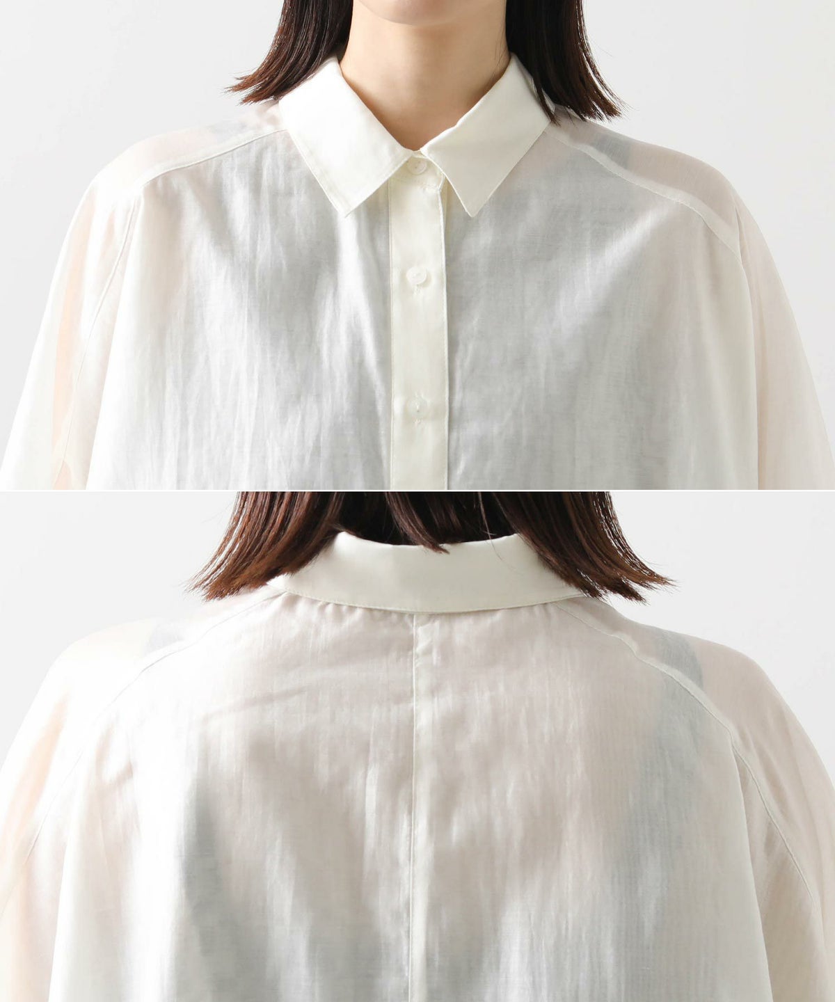 バイカラーシアーバンドネックブラウス