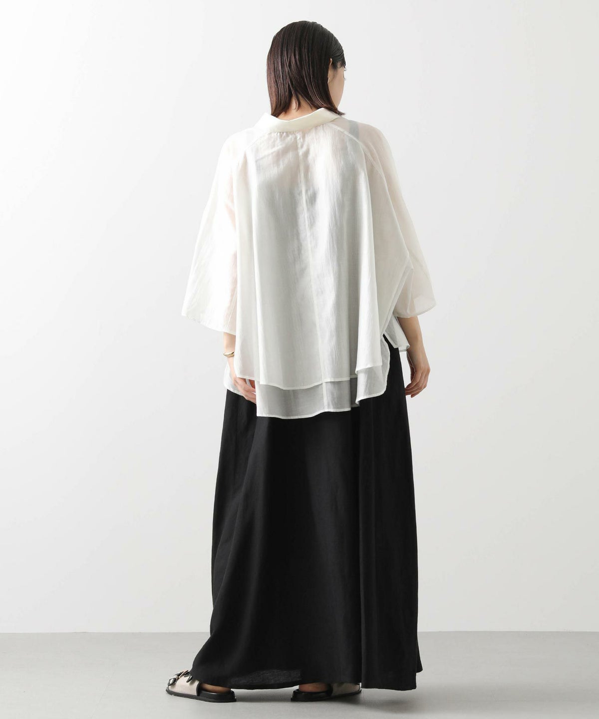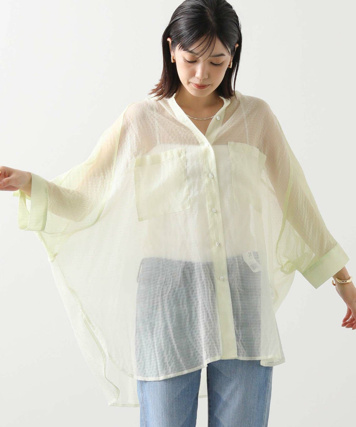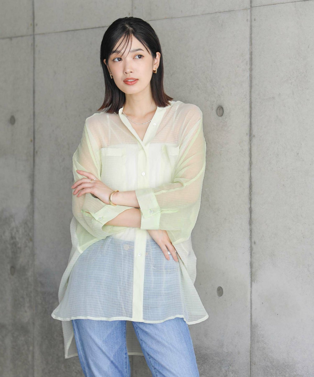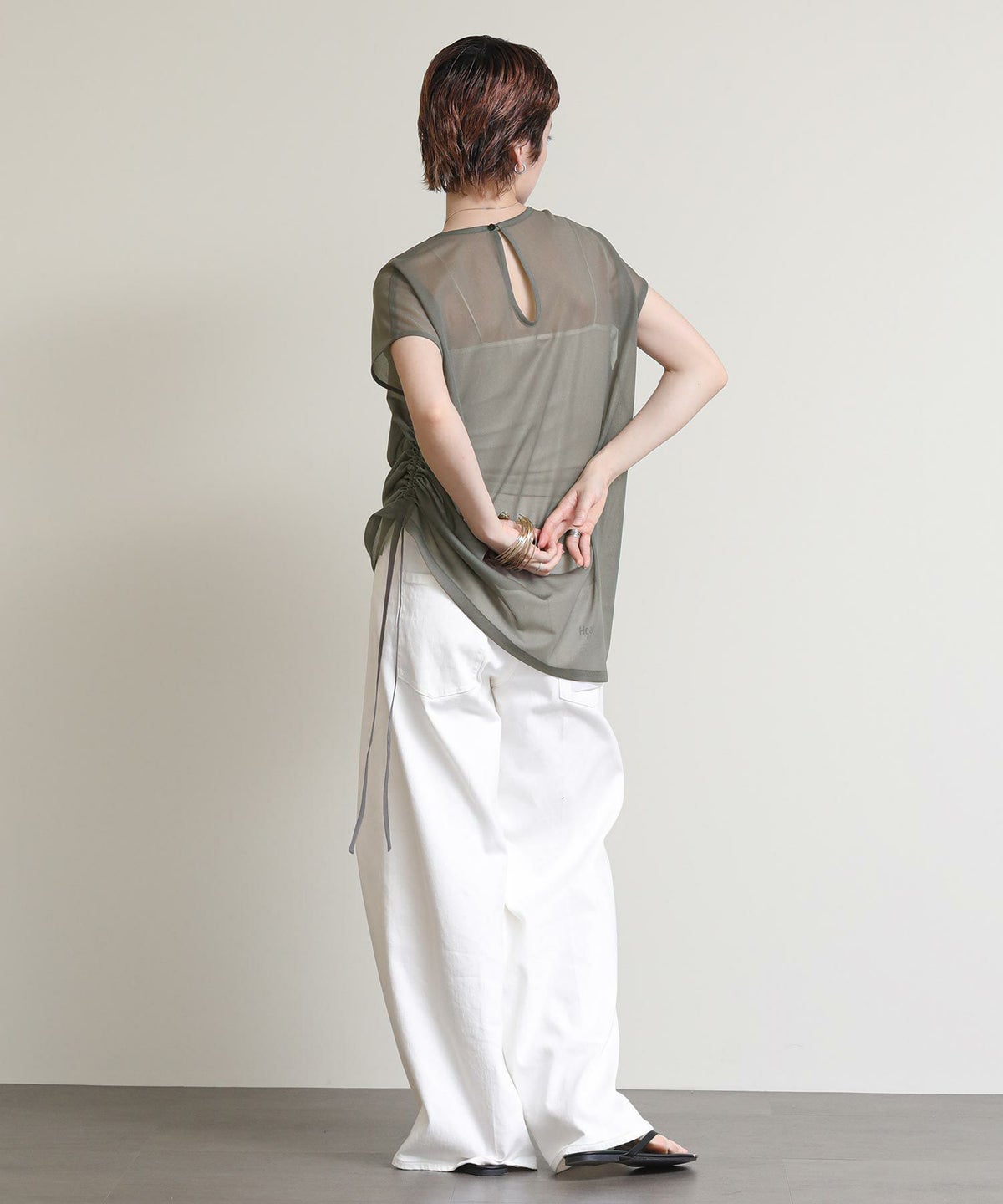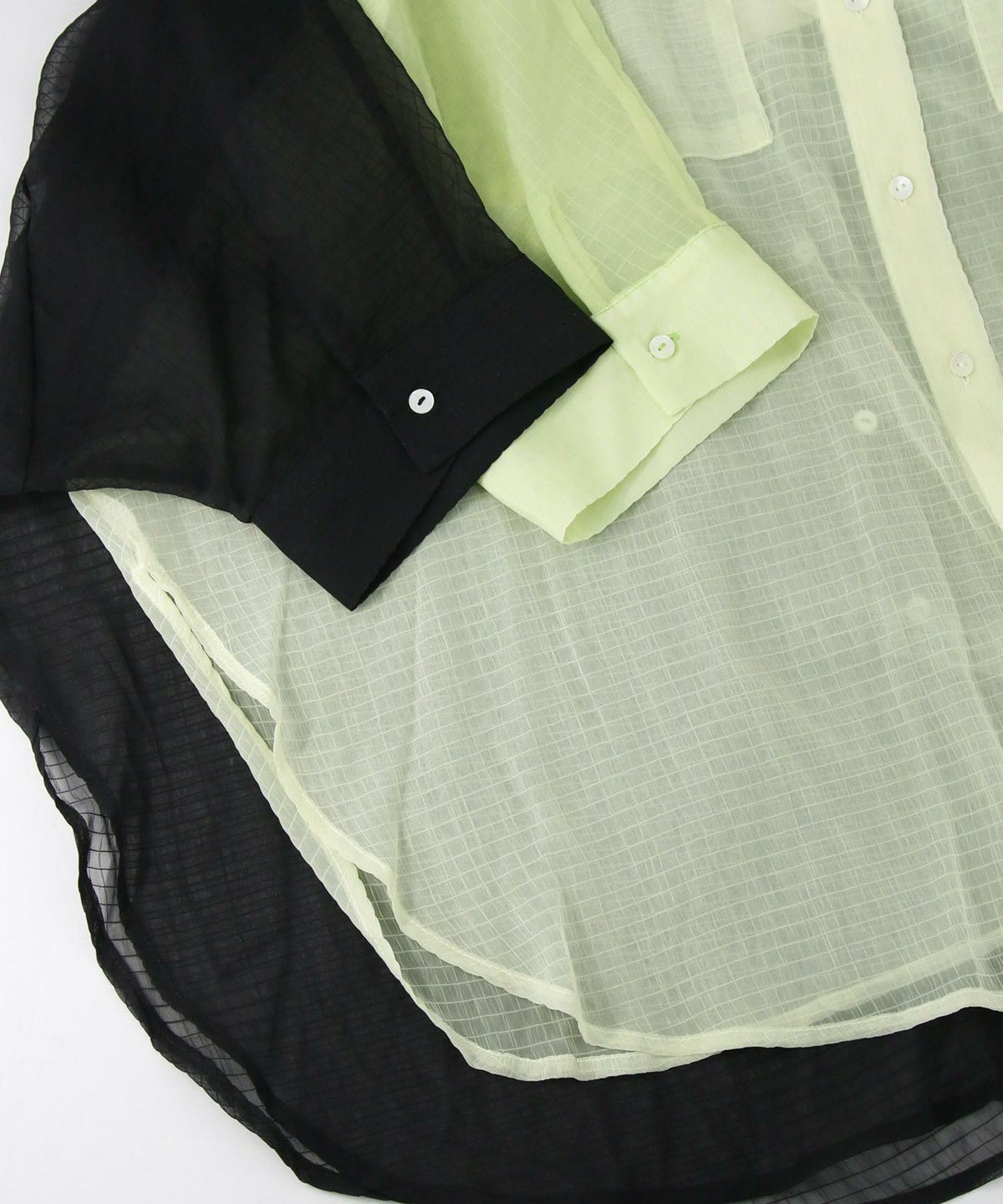 バイカラーシアーバンドネックブラウス