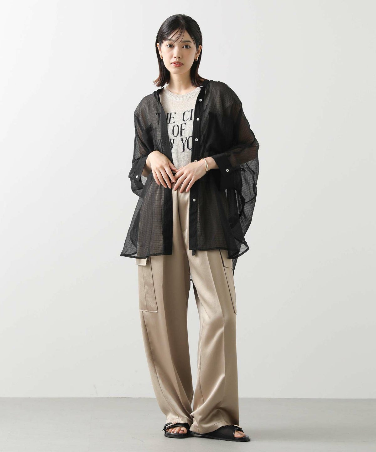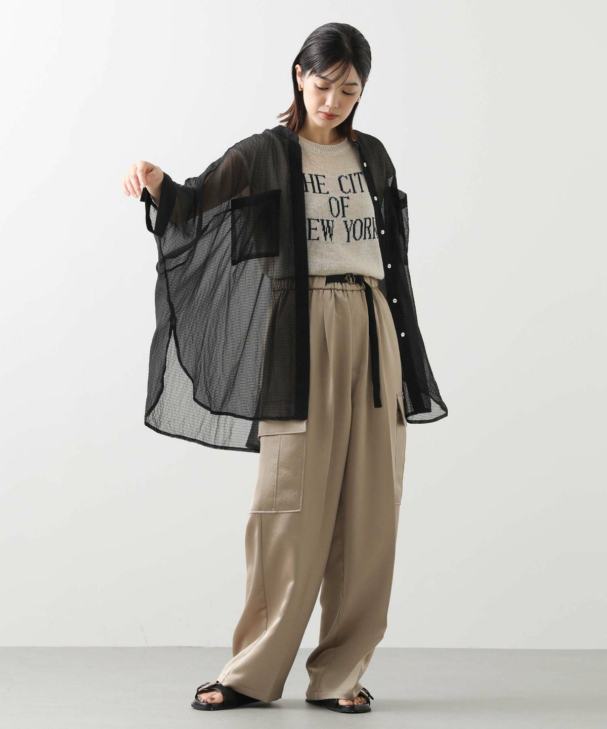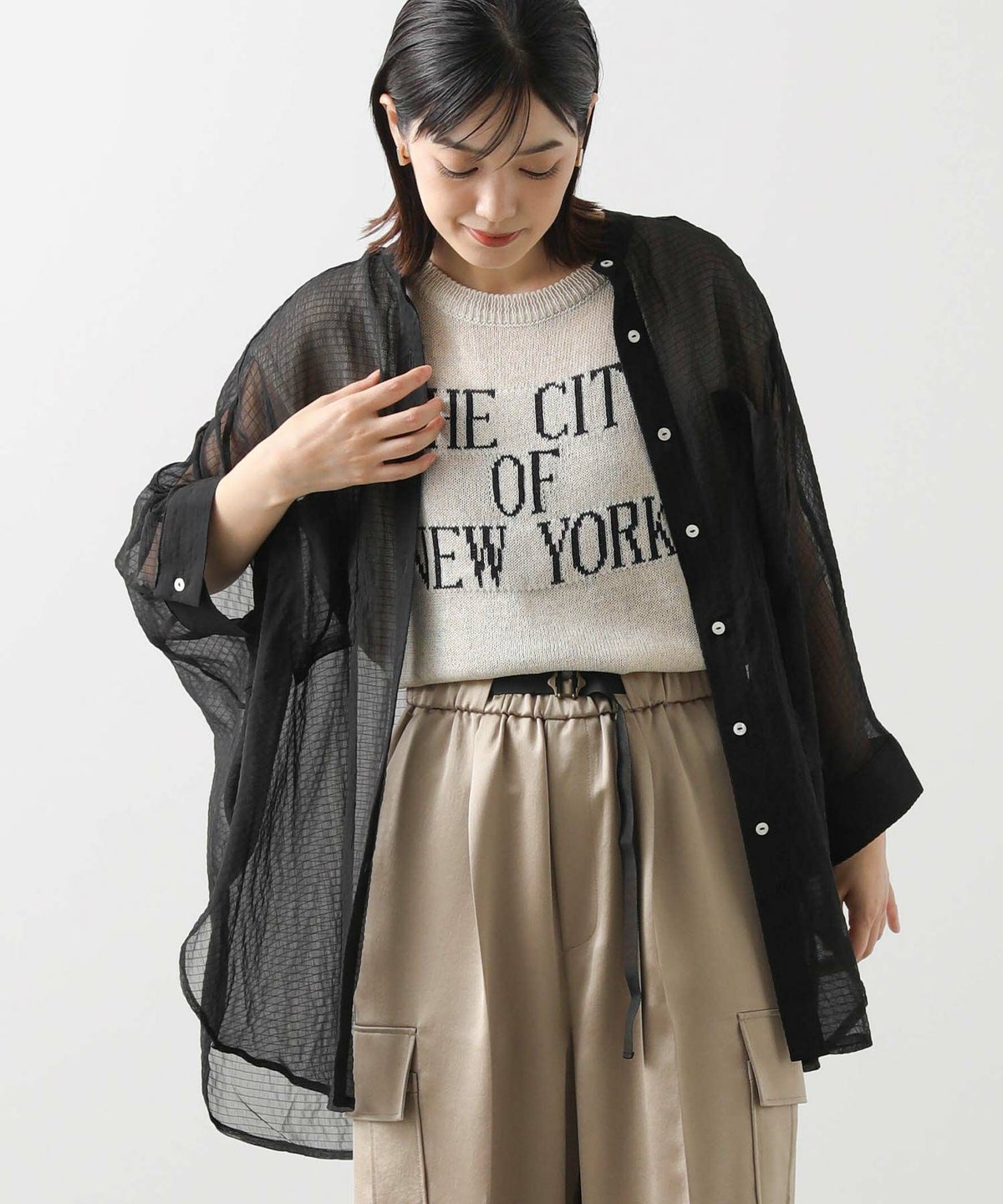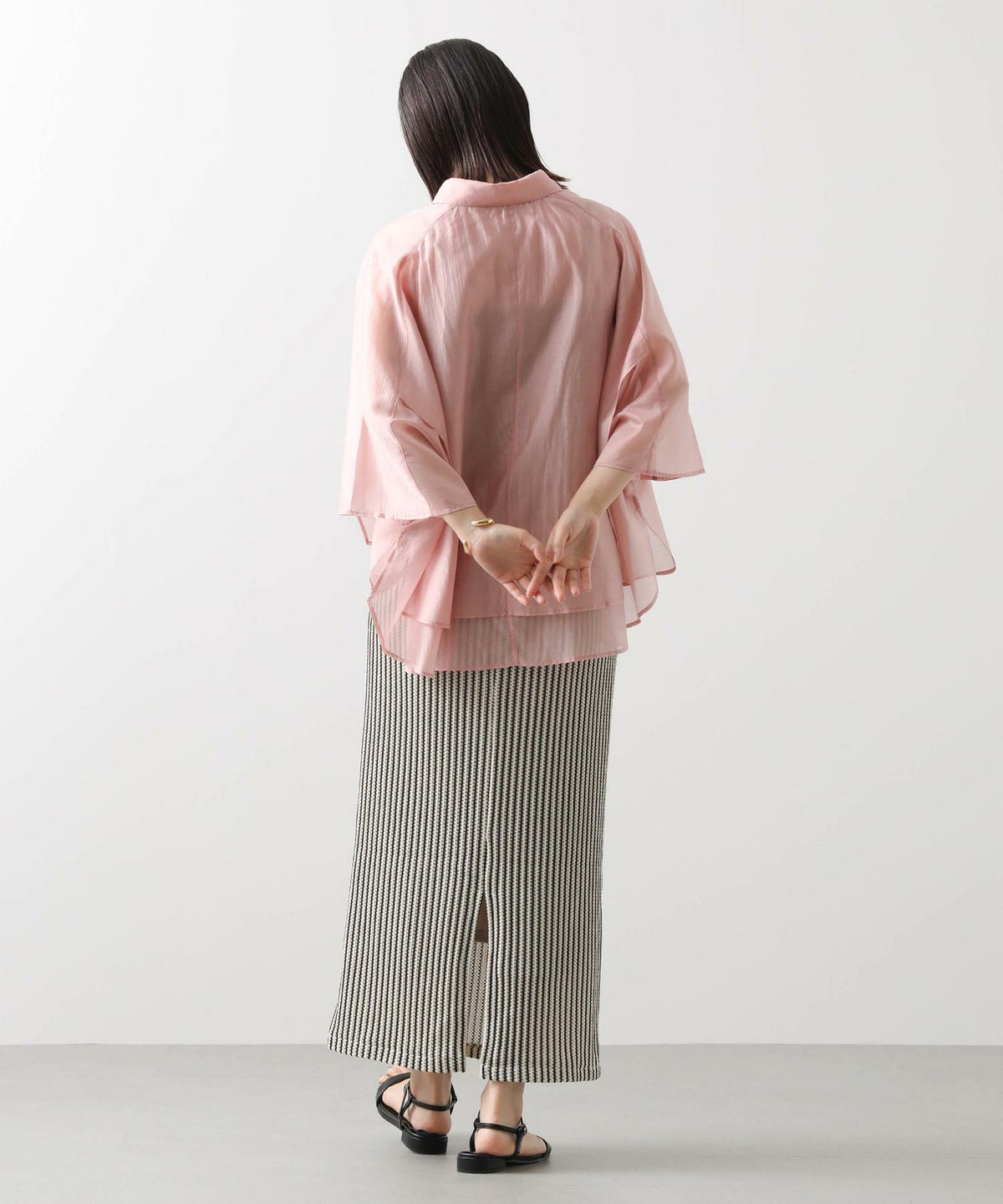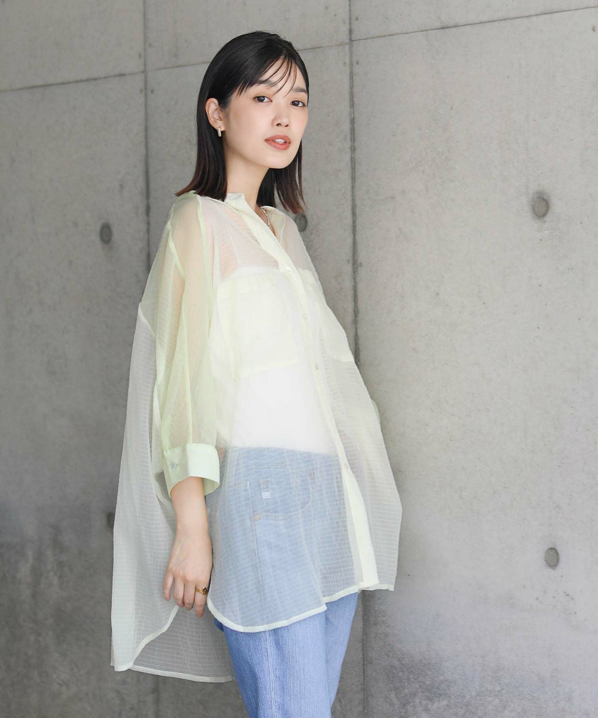 バイカラーシアーバンドネックブラウス