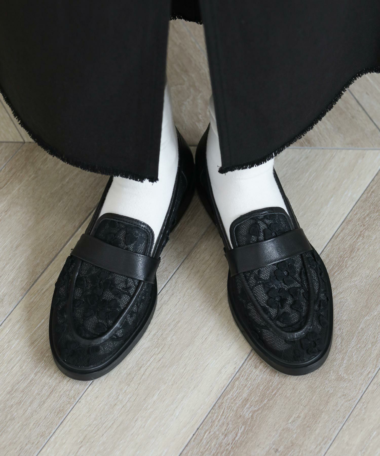 黒を基調としたメッシュ素材の透け感がレースの甘さを抑えモードな印象。甲部分にあしらわれたレザーディテールがアクセントを添えます。靴下を合わせて色の変化を楽しむのがおすすめ。いつものデイリースタイルに合わせるだけで、洗練された雰囲気に。
