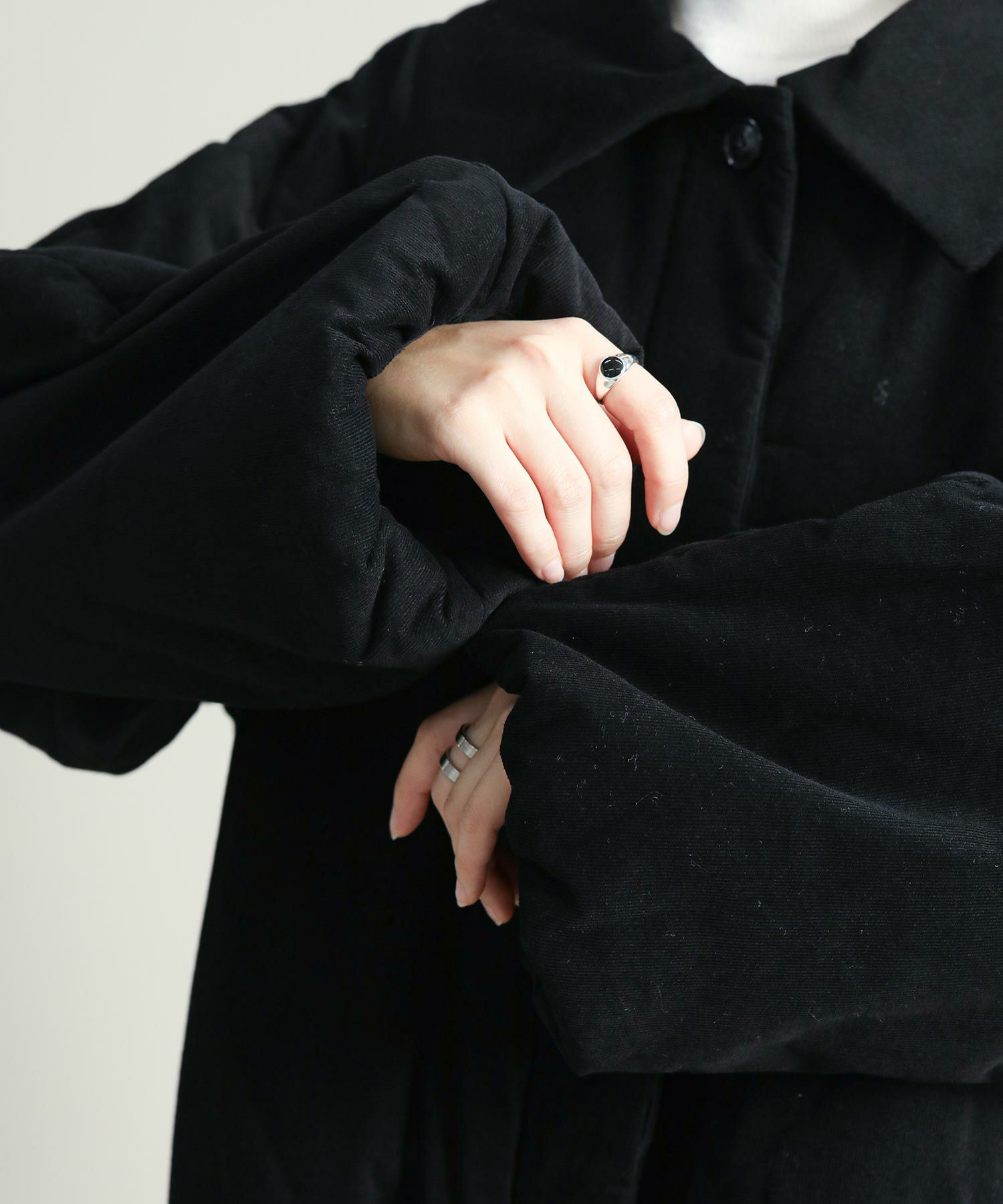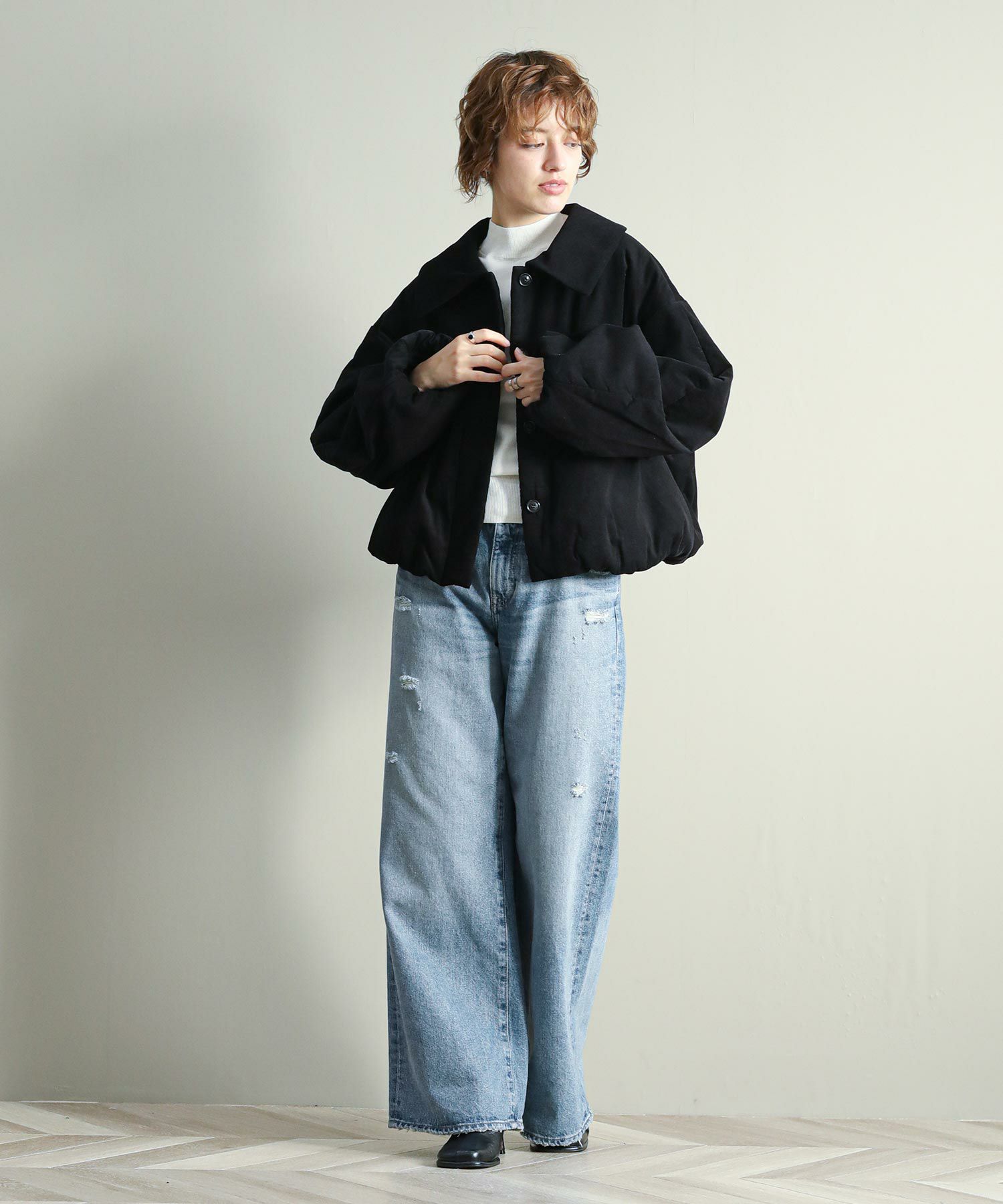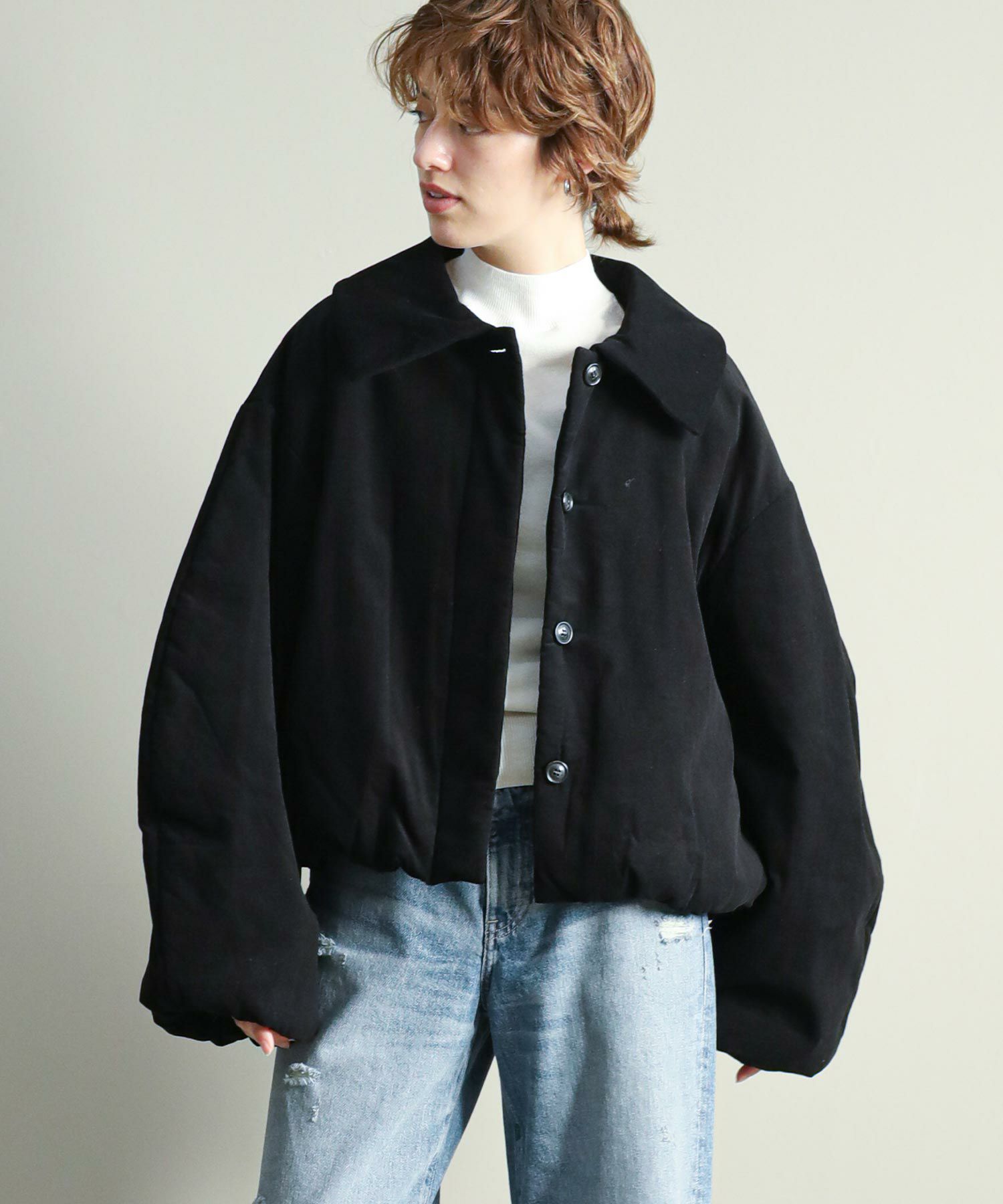 中綿入りなので軽量かつ通気性もありながら保温性にも優れており、気温の下がるこれからの季節にぴったりです。顔まわりを華奢に見せる大きめの襟と、MANOFらしいラウンドした袖のシルエットがポイント。裾と袖口のギャザーがニュアンスあるディテール。比翼仕立てで可愛らしくなりすぎず、大人っぽいスタイリングにマッチするデザインです。ショート丈なのでボリュームのあるワイドパンツやカーゴパンツ、ワンピースにも合わせやすいバランスで、ロングシーズン着用していただける一着です。