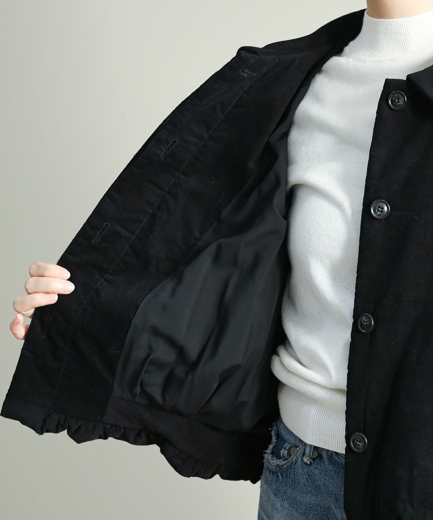 細畝のコーデュロイ素材を使用した中綿入りのショートコート。