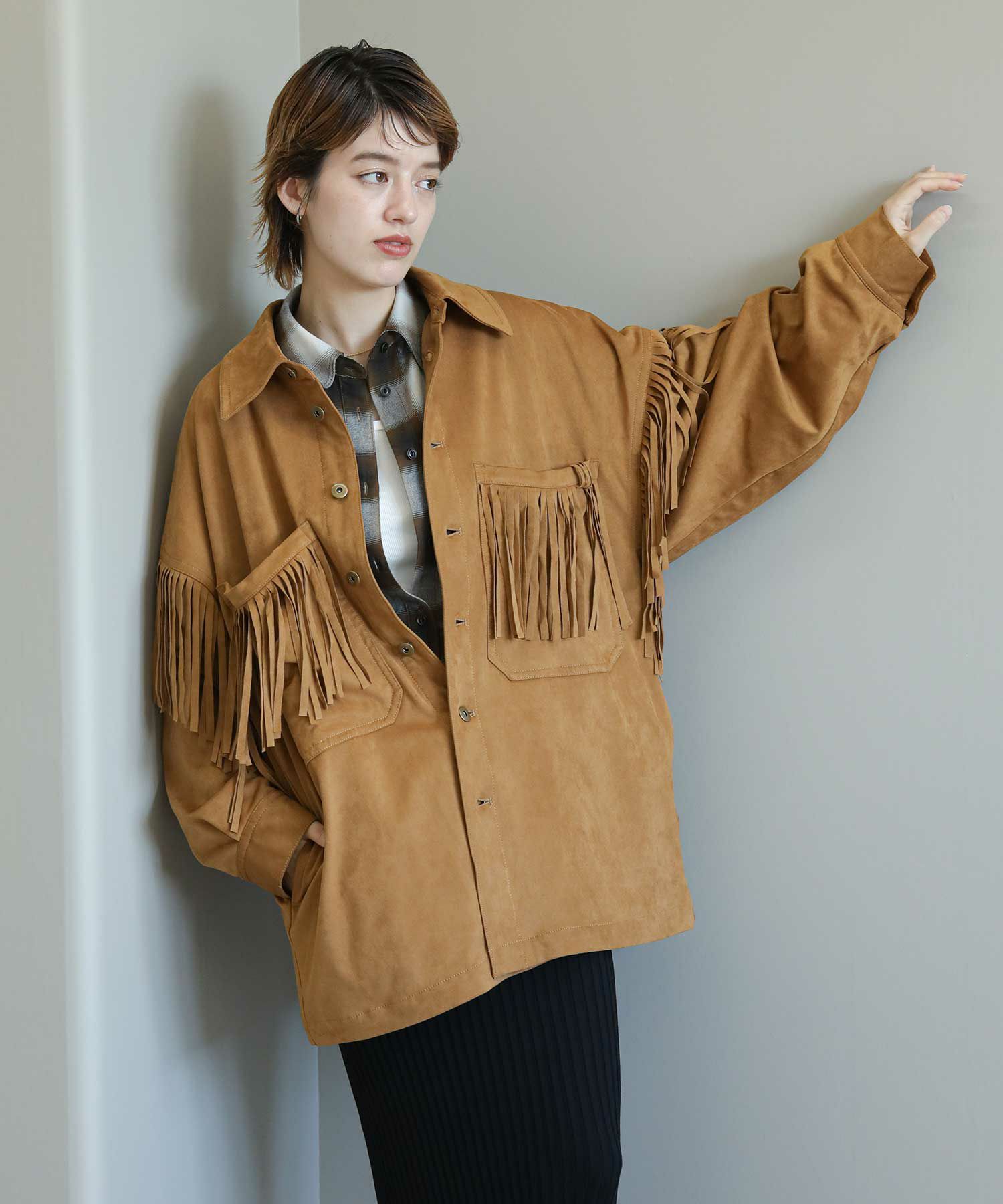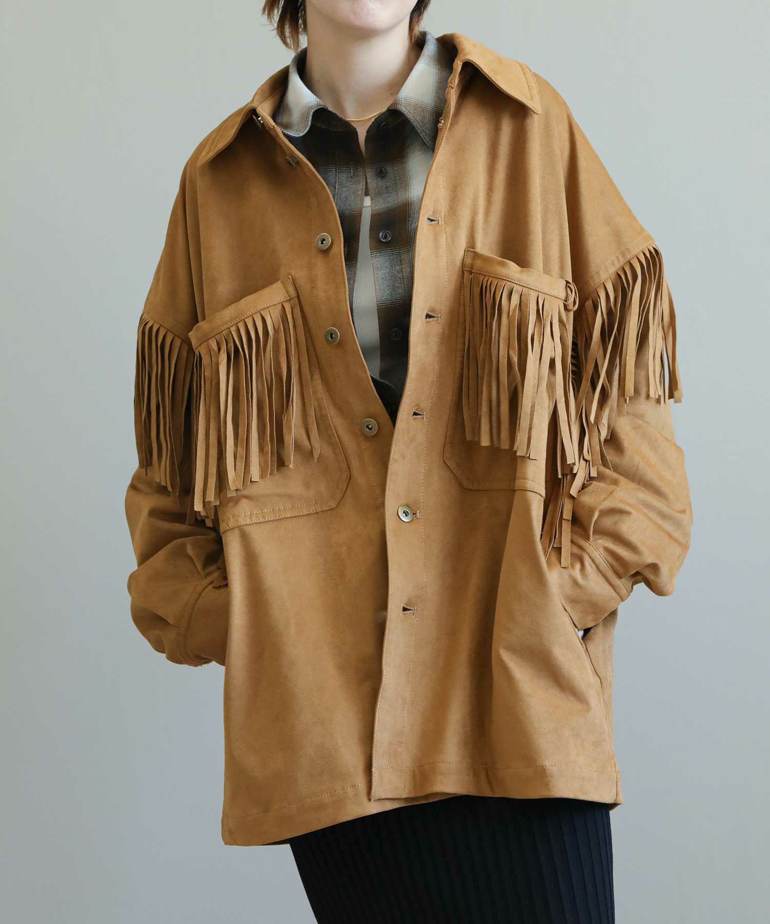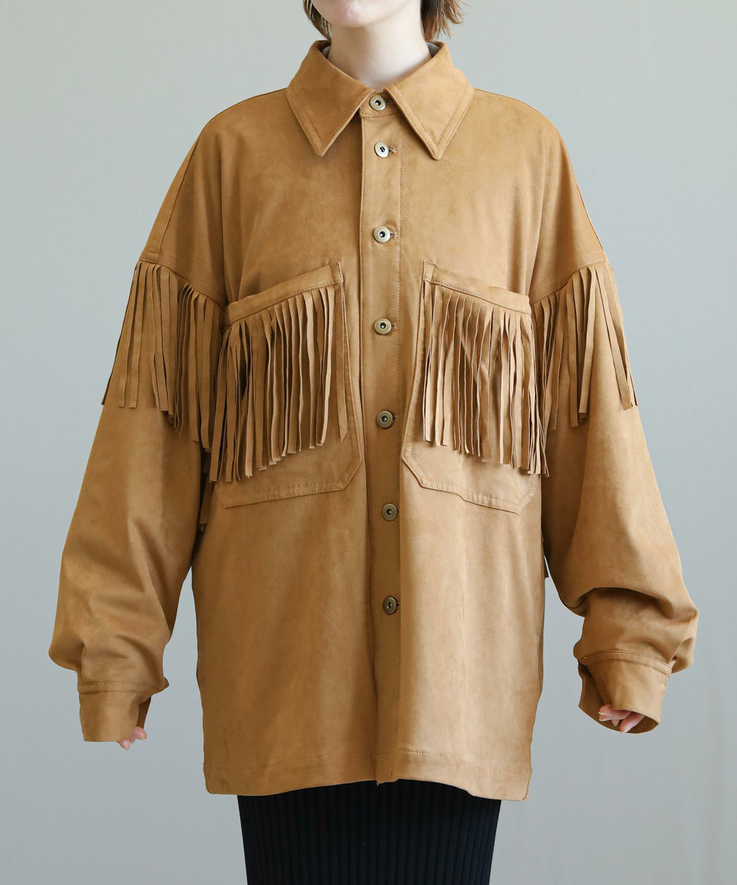 フリンジがアクセントになったスエードライクなシャツジャケット。