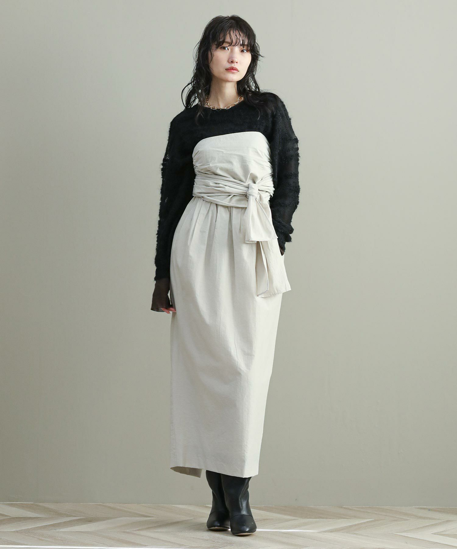 ビスチェは、ウエストに巻きつけてもスタイリング可能。スカートのウエスト部分にボタンが付いているのでズレてきてしまうこともなく安心。