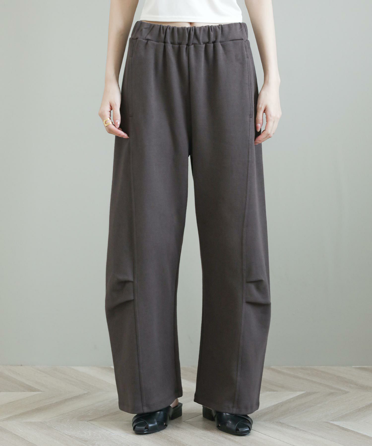 綿ポリエステルのほどよいカジュアル感のあるダブルジャージー素材は、裏毛ほどカジュアルすぎない、裏側もスムースな肌あたりでパジャマっぽくならない大人におすすめのスウェットパンツです。膝に入れたタックで作るカーブシルエットがモードな雰囲気をプラス。ざっくりニットや、少しきれいめなシャツと合わせてもこなれた印象を与えてくれます。秋を感じる落ち着いたカラーも魅力。