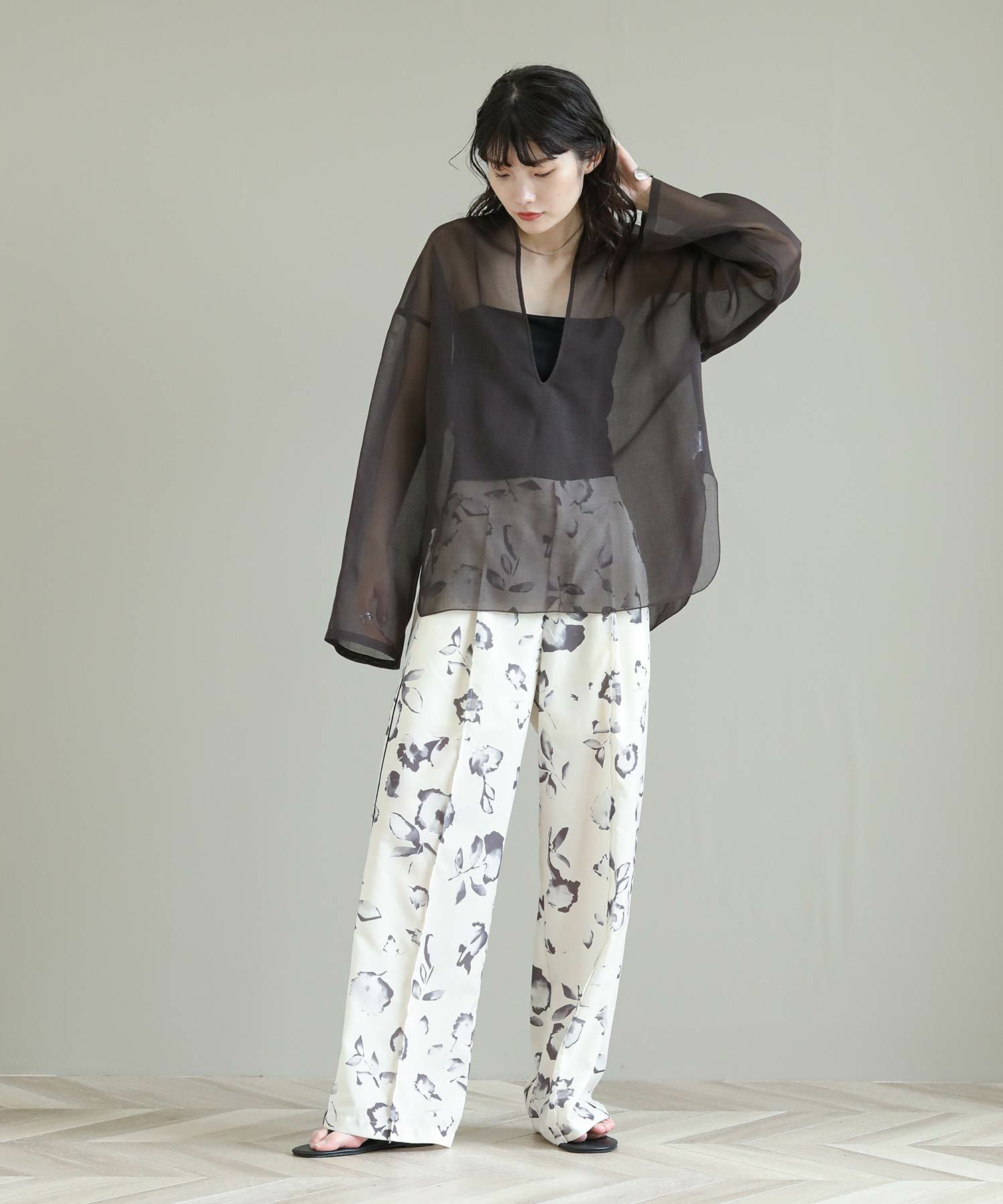 シックな色合いの滲んだフラワーモチーフのパンツ。