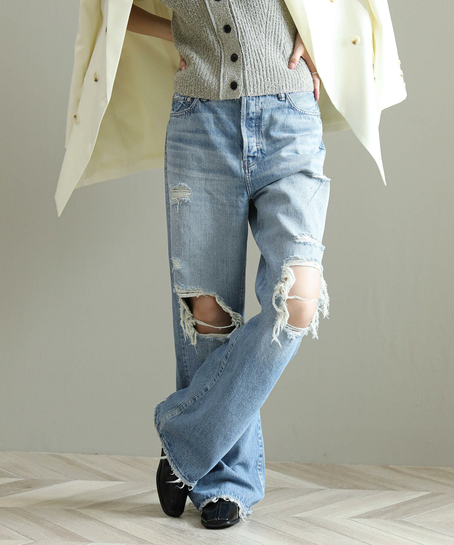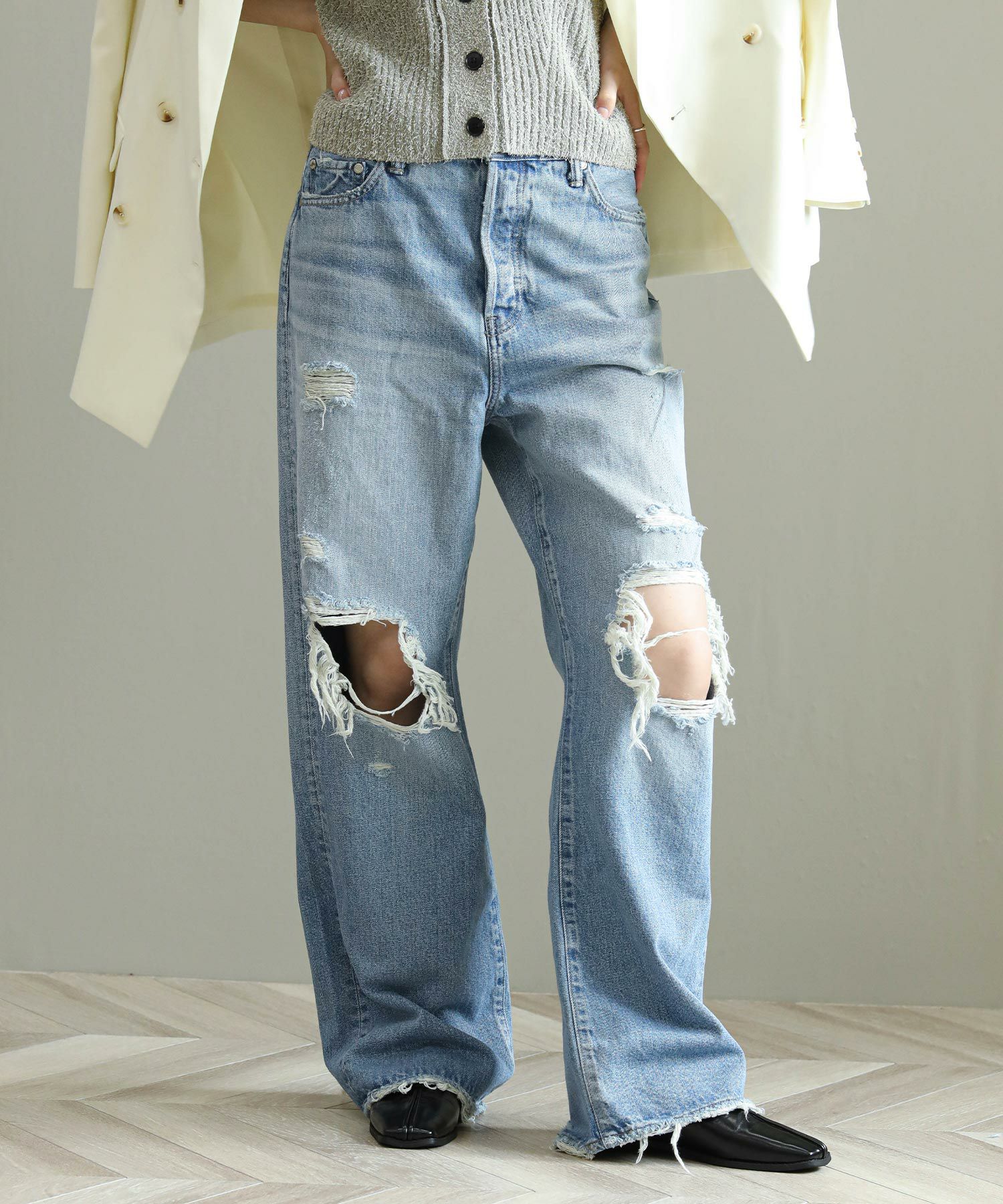 一般的なブーツカットと比べ膝の絞りが少なく、裾への広がりも緩やかな為、ストレートとワイドの中間のような着用感が特徴。ウエストは少し大きめの設計にしており、腰上で留まってヒップからワタリにゆとりをもたせることでリラックスな印象に。またウエスト位置で絞って履いてもキレイなラインが出るので着こなしに幅があるアイテムです。大胆なダメージ加工がトレンド感もあり、スタイルの巾が広がります。
