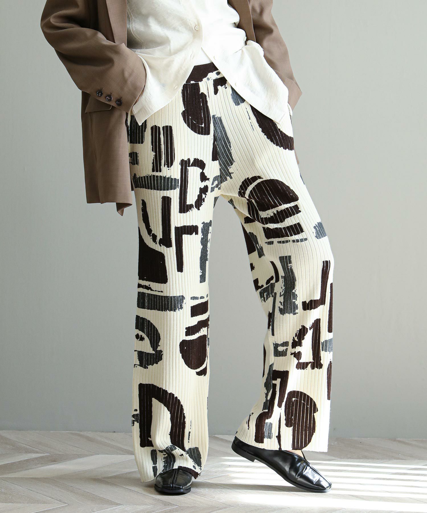 3色の内、1色は箔プリントが施されています。適度な落ち感を重視し、重みのない軽やかな履き心地が特徴です 。ニットパンツでは珍しいサイドポケットが付いており、ウエストはゴム仕様も嬉しい。編地と柄の配色が目を惹くリブニットパンツです。