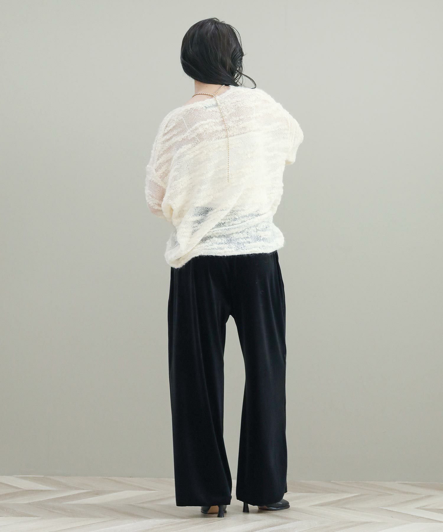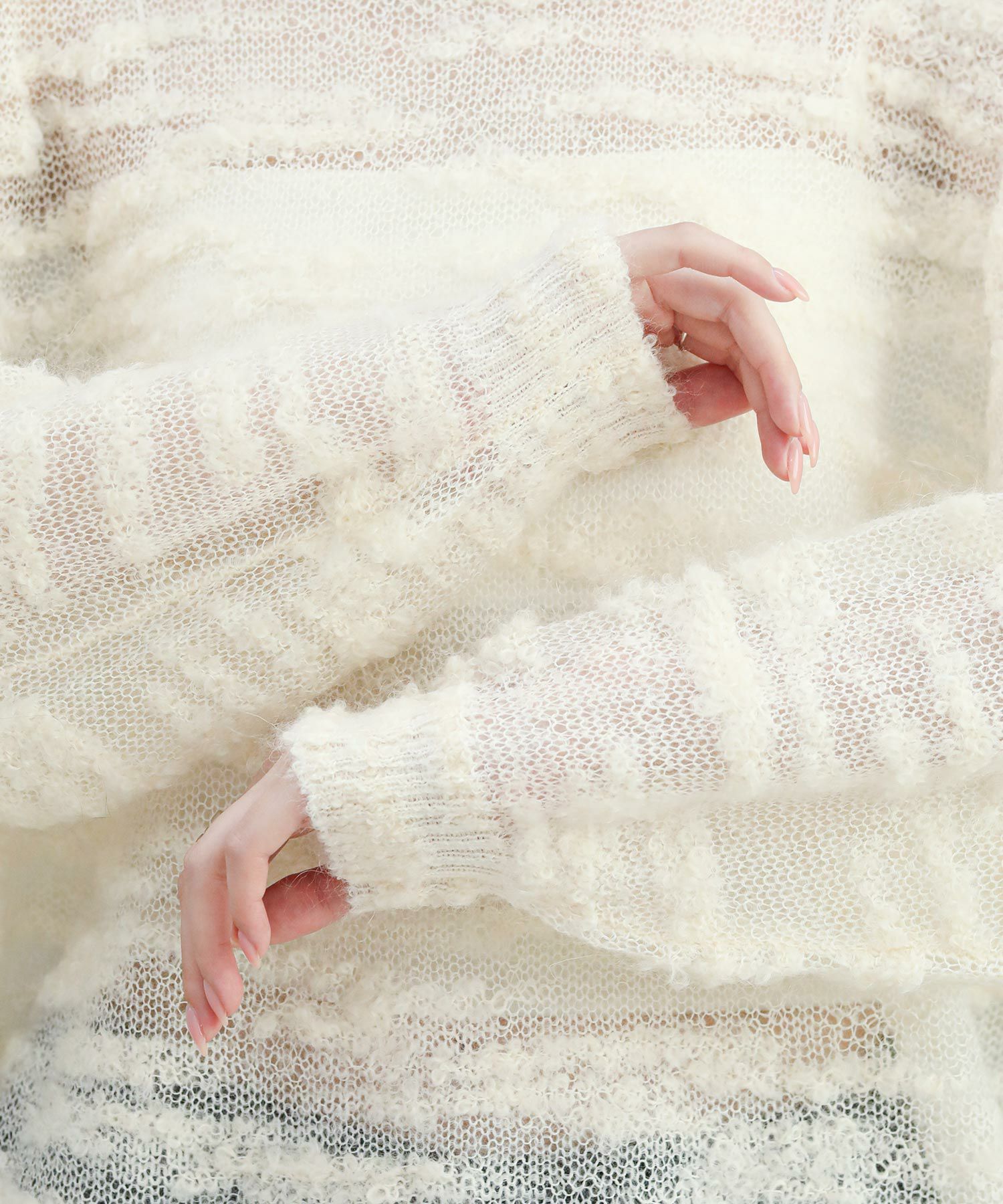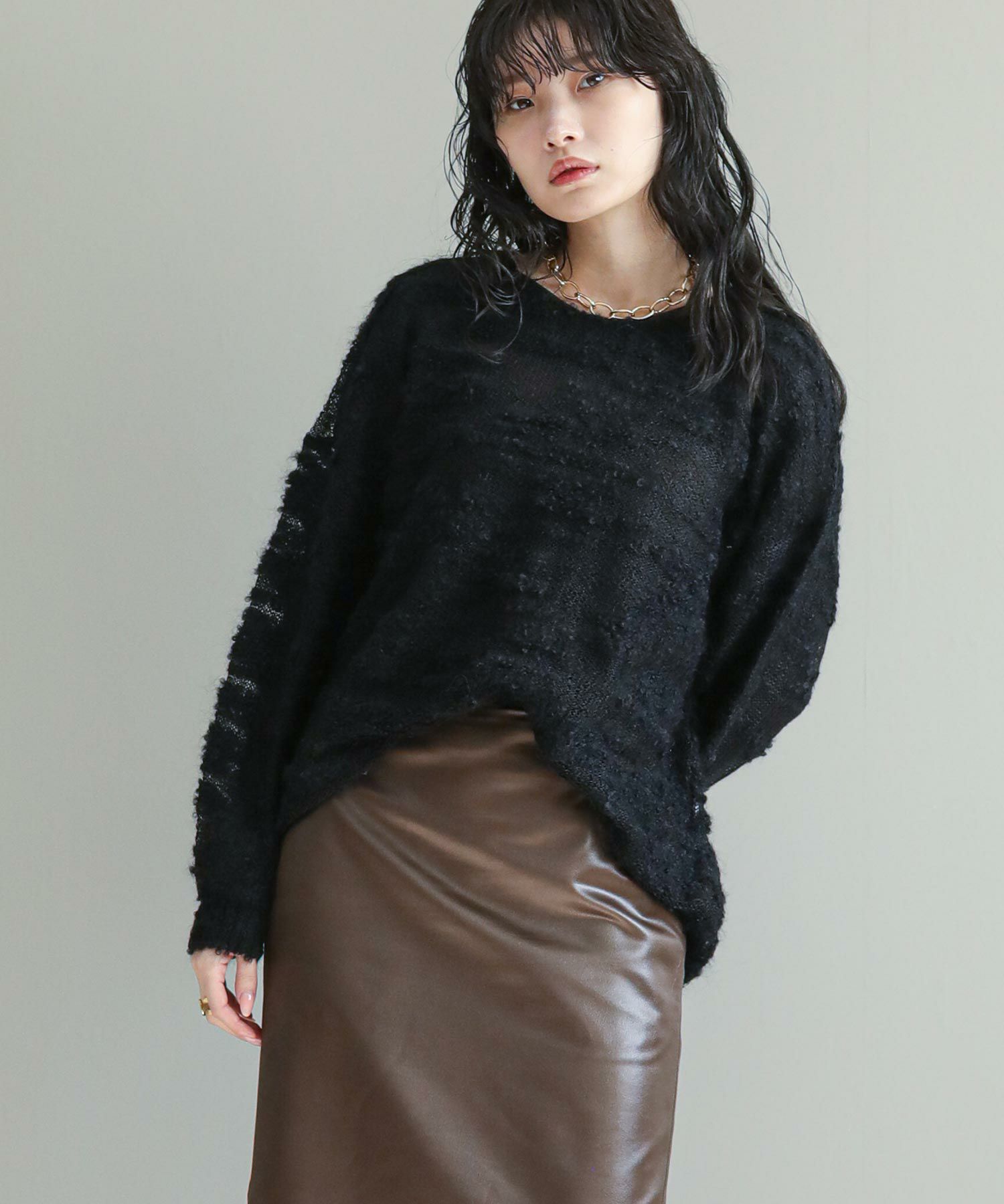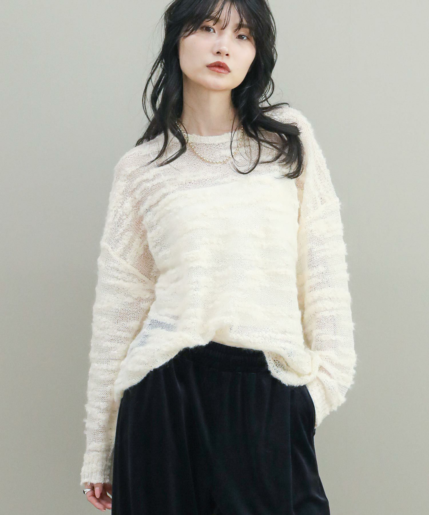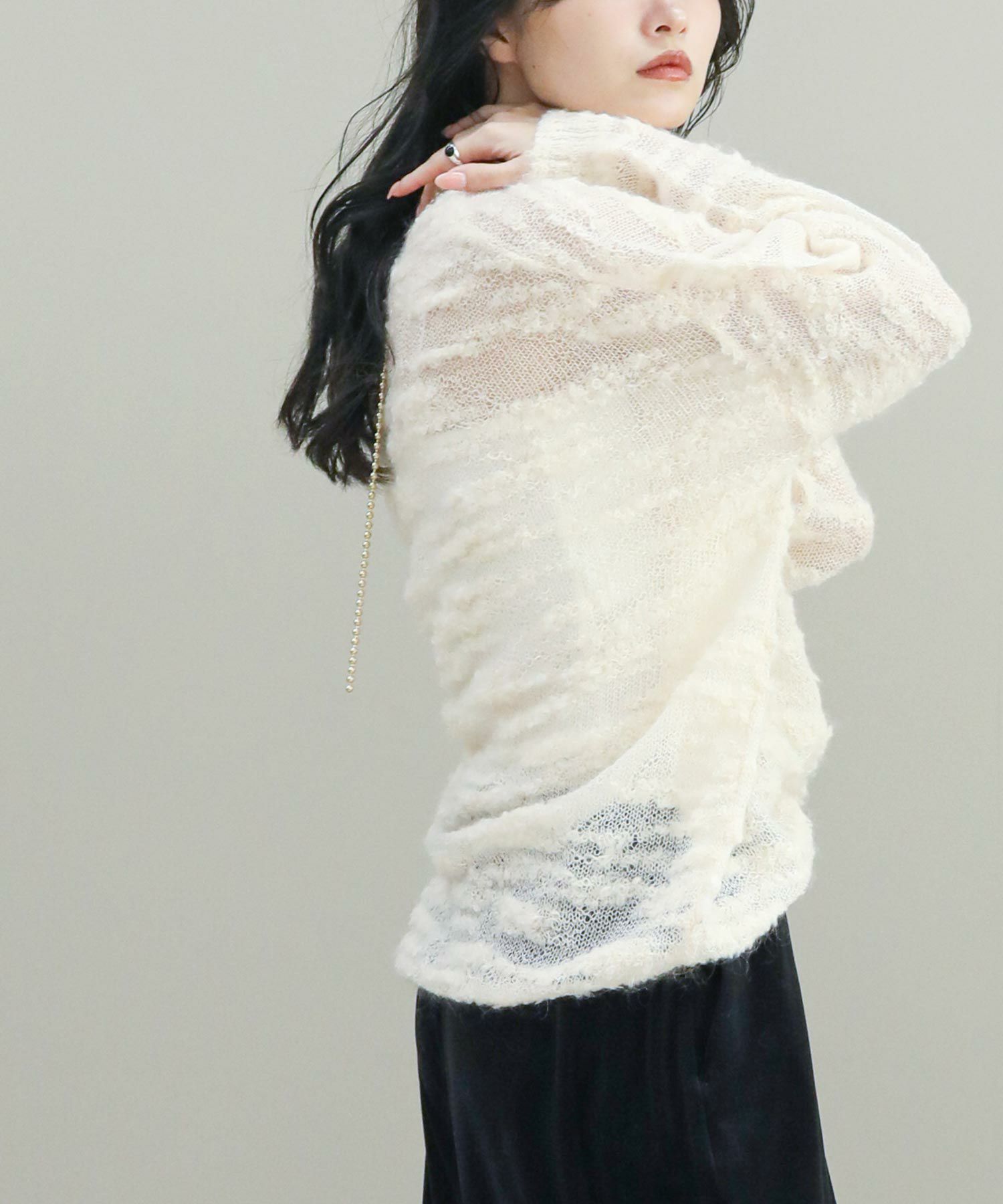 糸の繊細さやループ感を引き立てるためにざっくりとシアー感のある編地に仕上げています。ゆったりとしたサイジングに仕上げているので、シアー感を活かしたレイヤードスタイルを楽しんでいただけます。