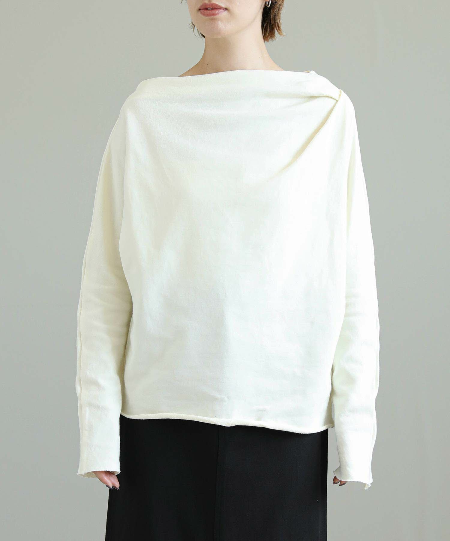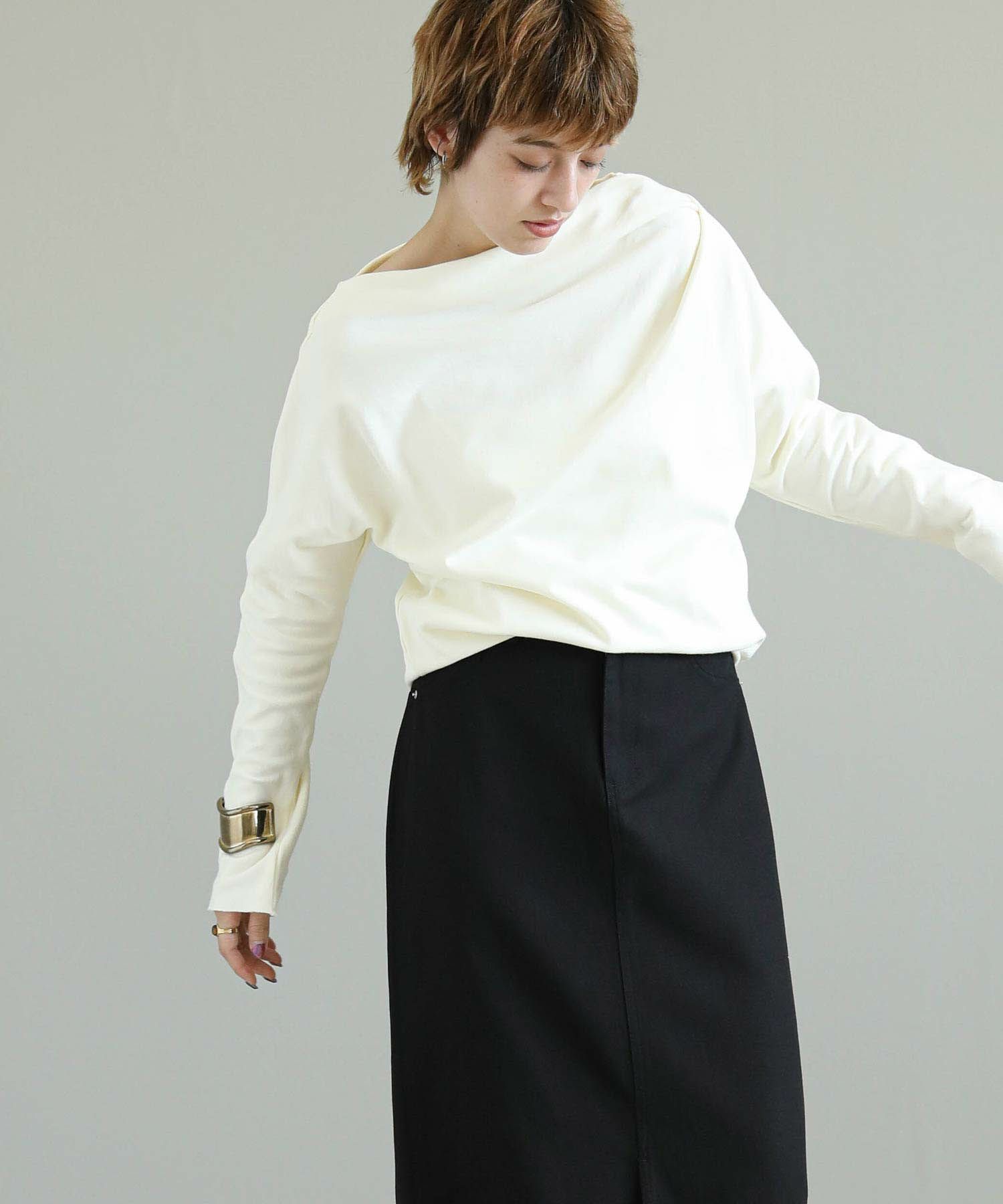 柔らかな素材感が心地よい、アシンメトリーデザインの長袖トップス。