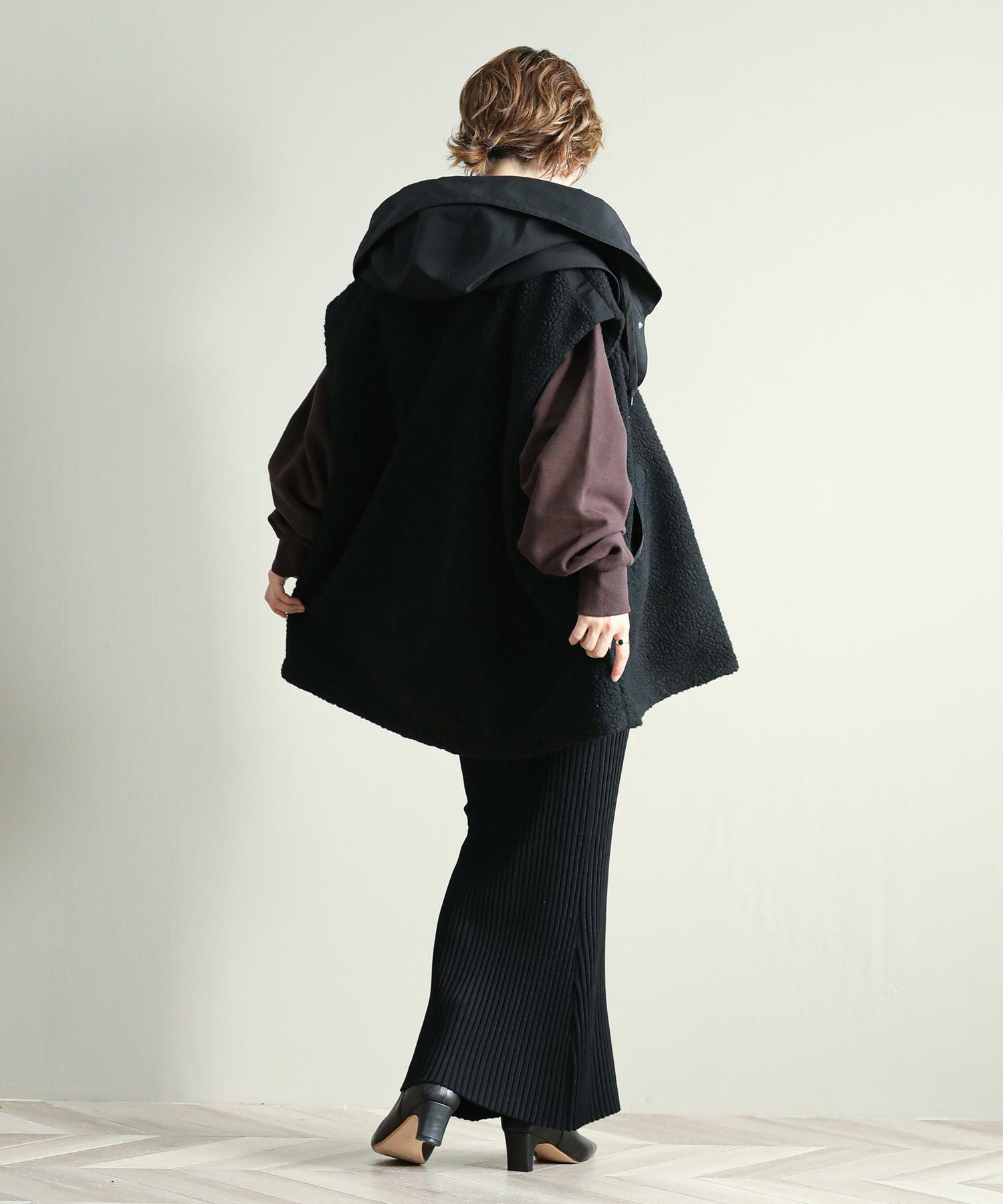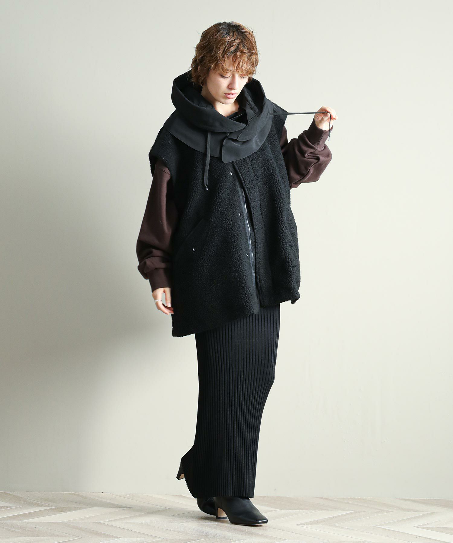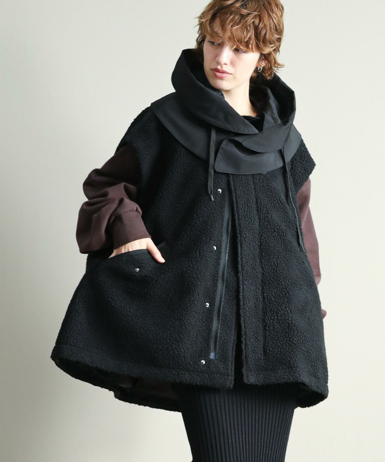 ゆったりとしたサイズ感で厚手のニットやスウェットはもちろん、アウターの上からでも羽織れるデザイン。M65の外付けフードをデザインソースに、しっかり立つ首回りとフードの大きさにこだわり、小顔効果も◎ハリ感のある素材できれいなシルエットを作ります。テーラードジャケットやMA-1の上から羽織るとこなれ感も出ておすすめです。ボアとタフタを同トーンでまとめワーク感が出すぎないようにしています。