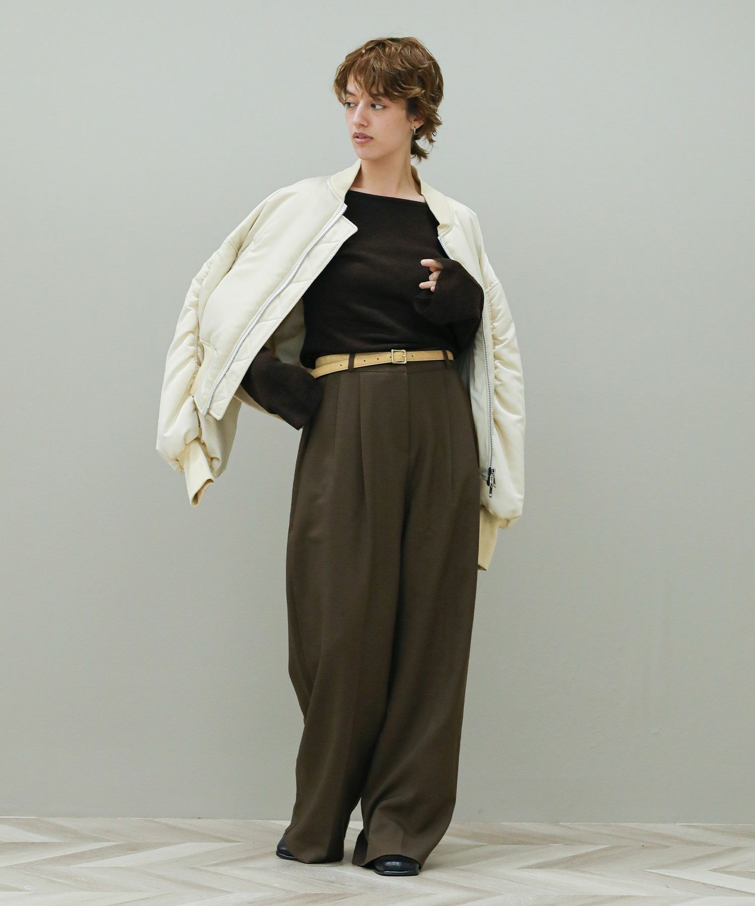 着丈と袖のバランスがポイント。さっと羽織るだけでスタイルが決まります。重厚感のあるファスナーやヘビーなリブなどMA-1らしさに拘りながらも女性らしいスタイルにマッチするシルエットです。今シーズンはライトベージュとカーキの2色。重くなりがちな秋冬スタイルを軽やかに仕上げてくれます。