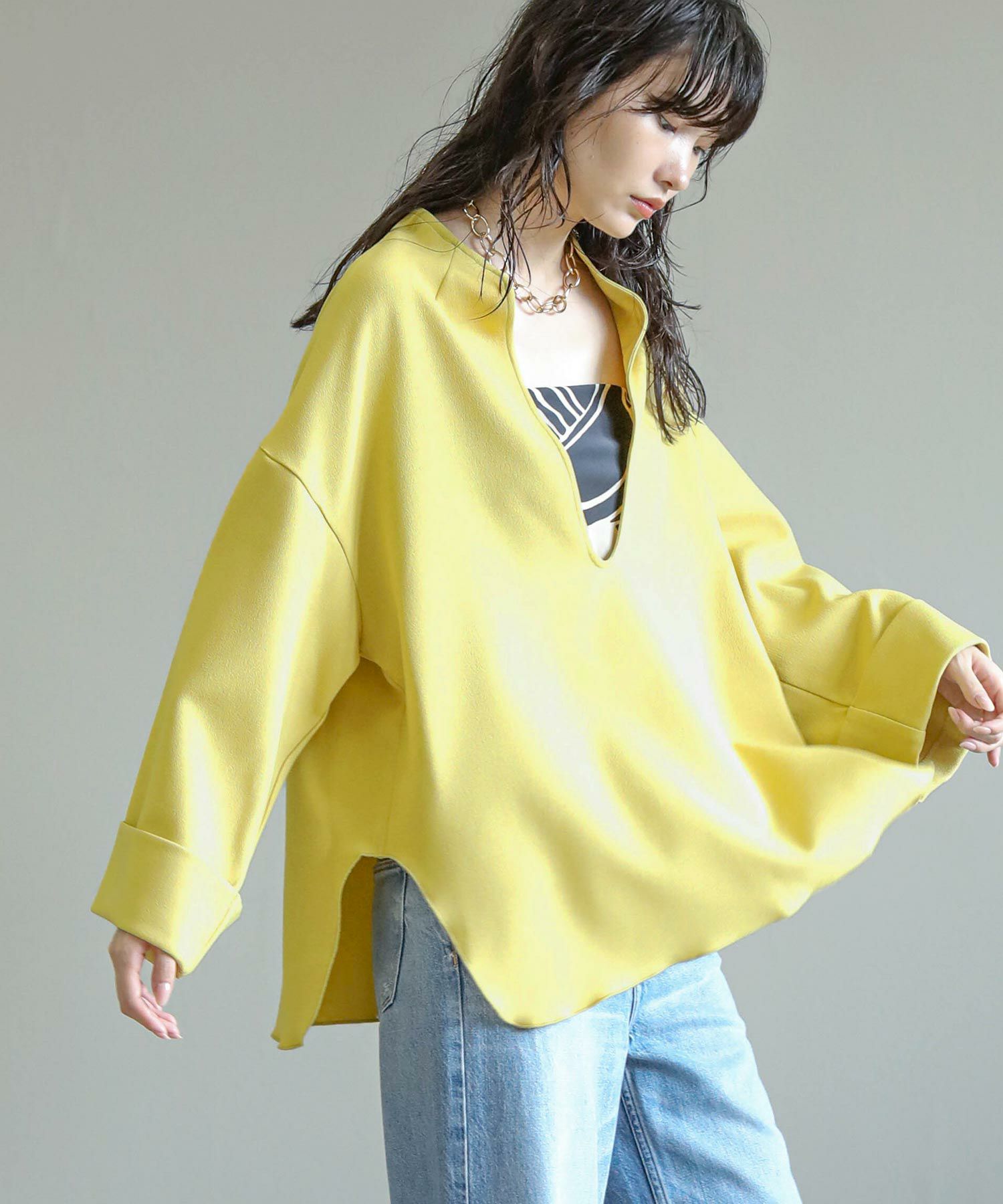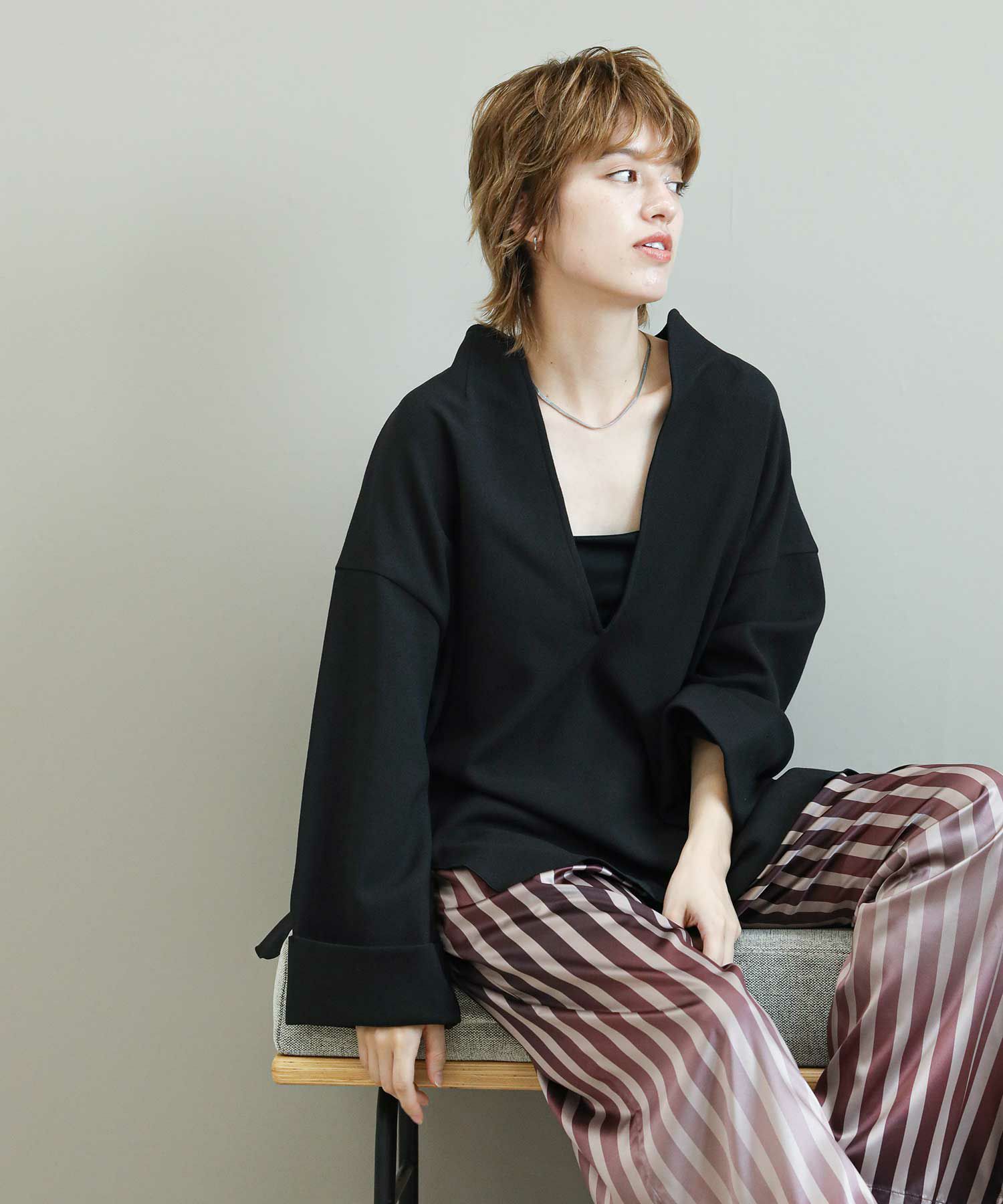 滑らかな落ち感のあるアムンゼン素材を使用したスリットブラウス。