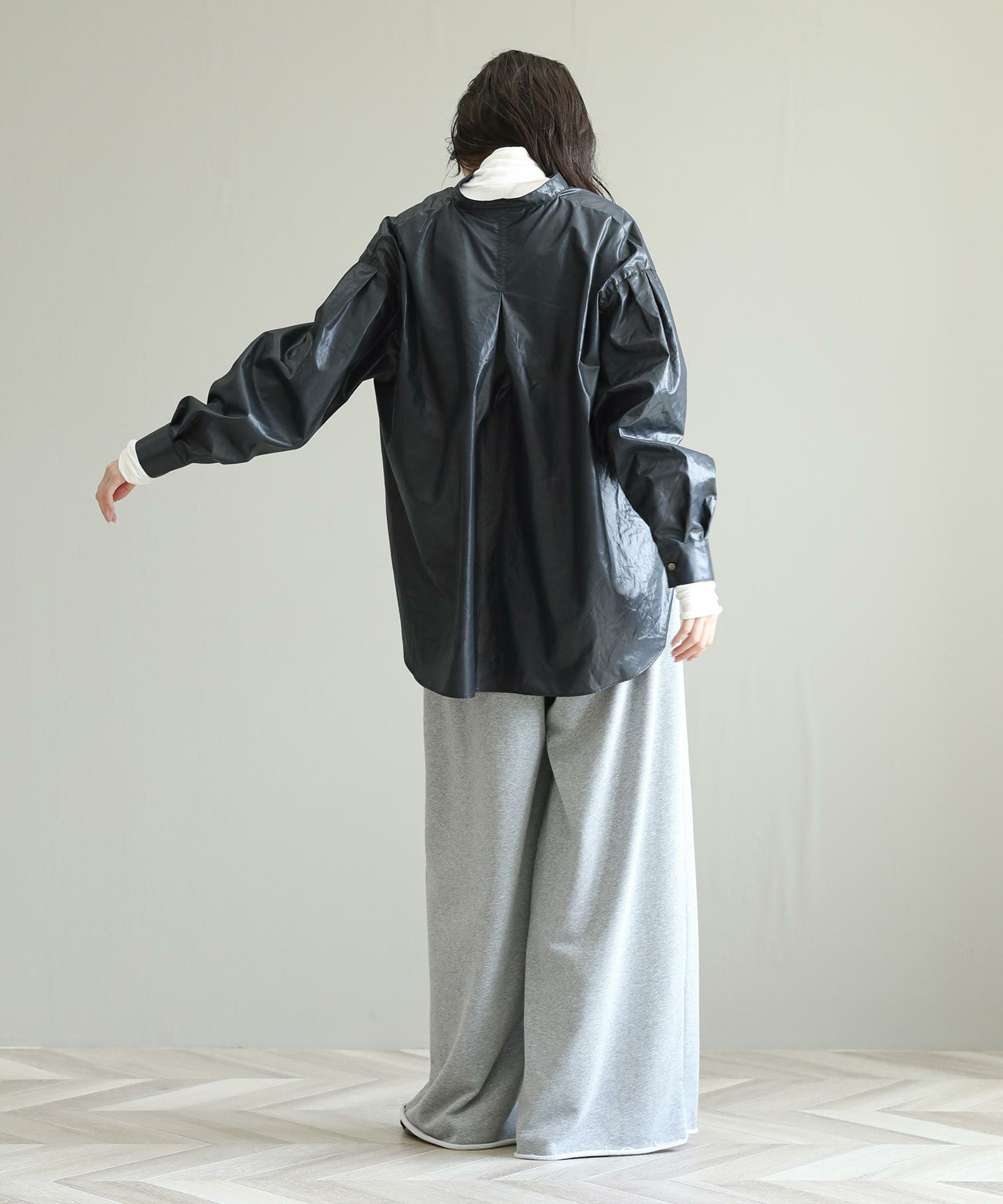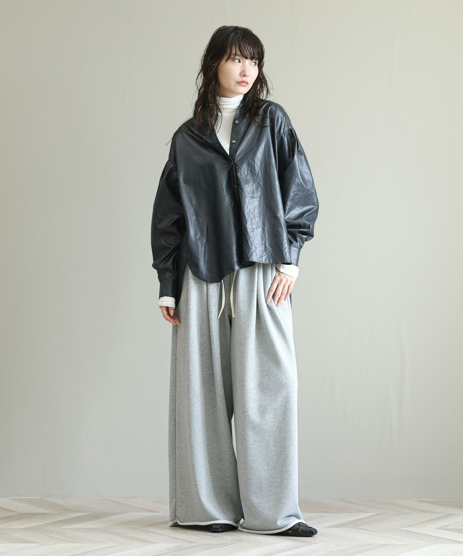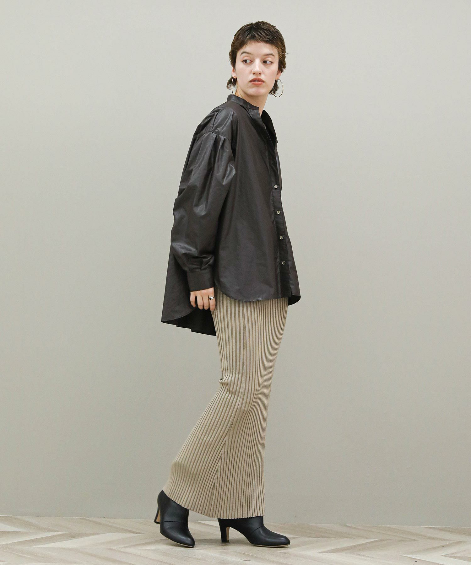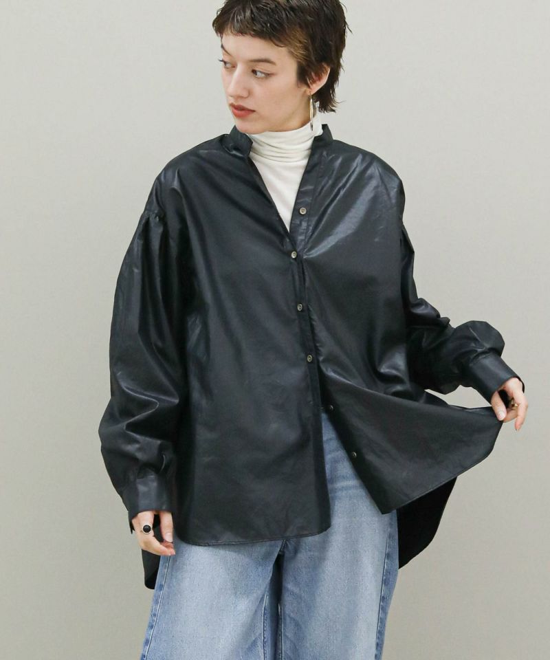 袖にボリュームをもたせることでハードになりがちなレザーアイテムを女性らしく仕上げました。スキッパーデザインを活かしてインナーにタートルやロンT仕込むのもおすすめ。腰回りをカバーしてくれる着丈なのでタイトスカートと好相性。スラックスやワイドパンツとはタックインしてきるとバランスも取りやすいです。