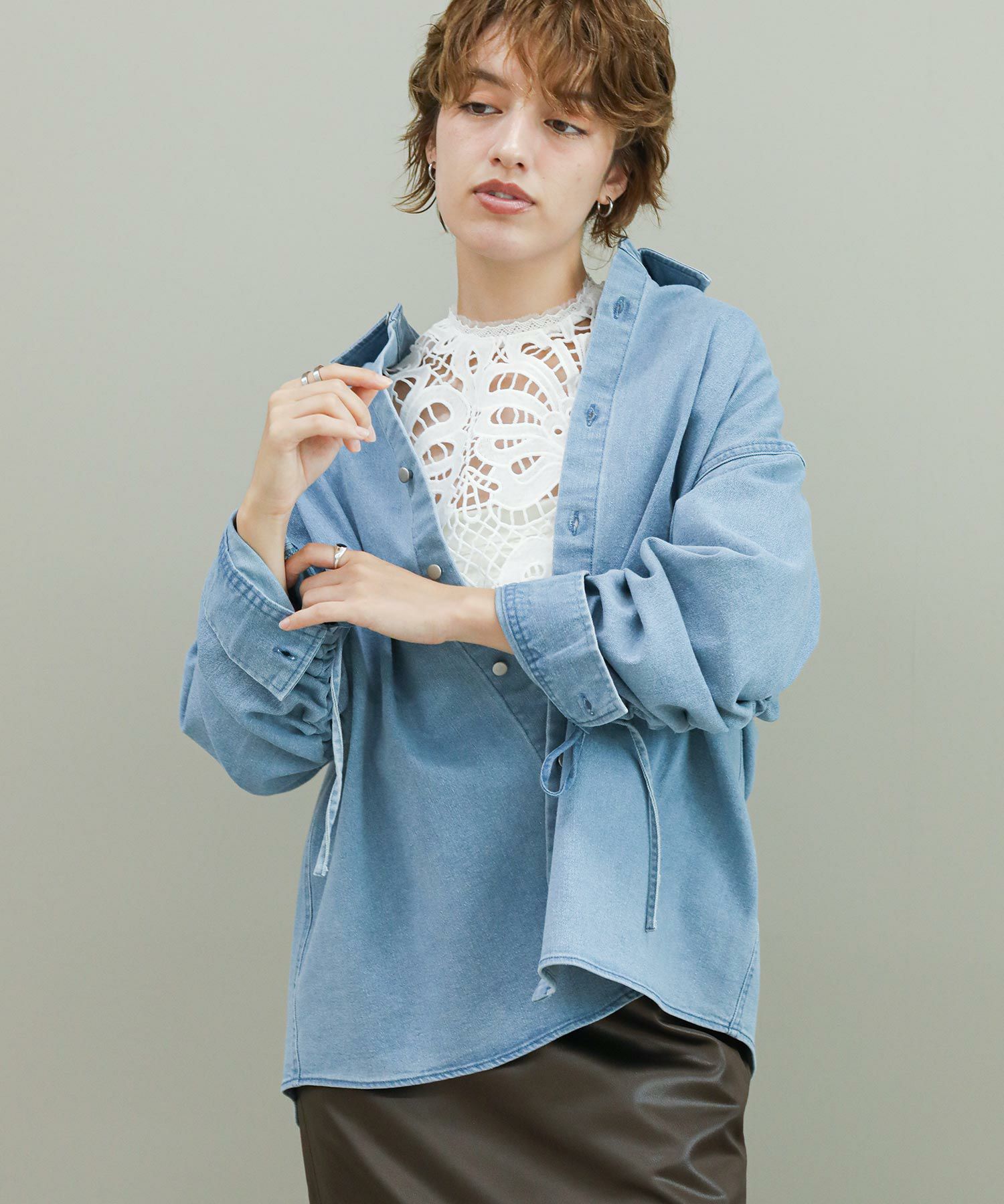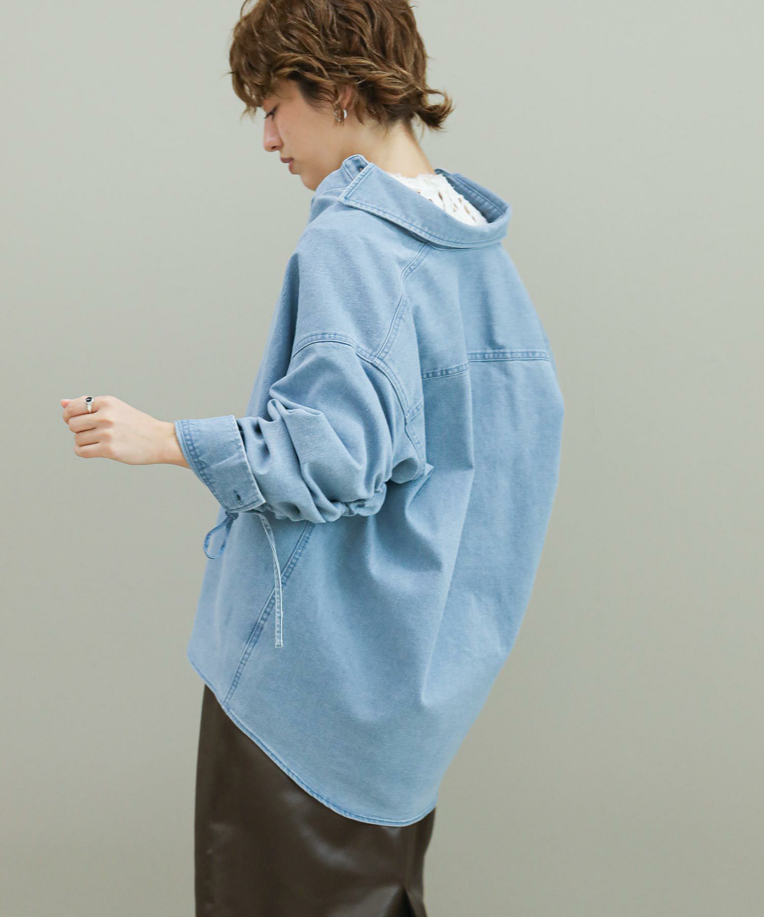 袖のドローコードでシャーリングを作り、袖のフォルムをアレンジできます。程よい肉厚のデニム生地がジャケット代わりにも。デニムはブリーチとボールバイオ加工でヴィンテージライクな風合いに仕上がっています。