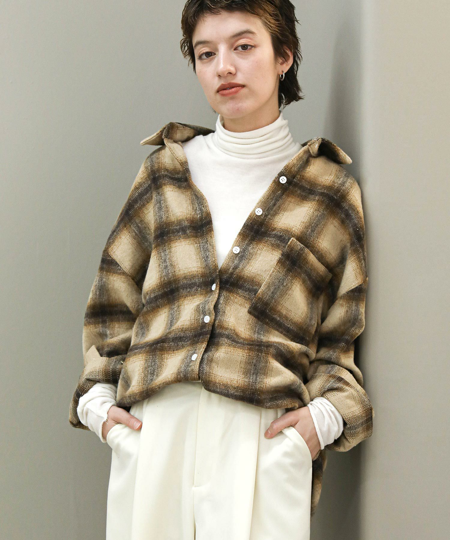 生地はしっかりと厚みがありながらもソフトな風合いが魅力。こなれ感のあるオーバーサイズでインナーにニットやスウェットを着て羽織ることもできます。腰回りをカバーしてくれる着丈でタイトスカートとも好相性。