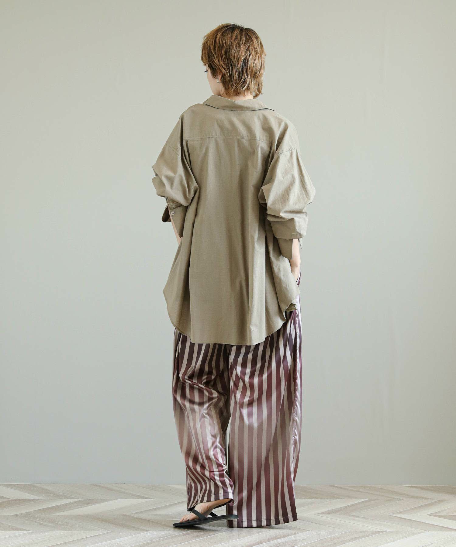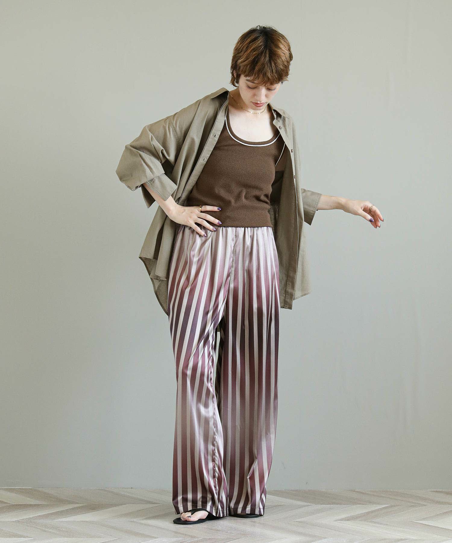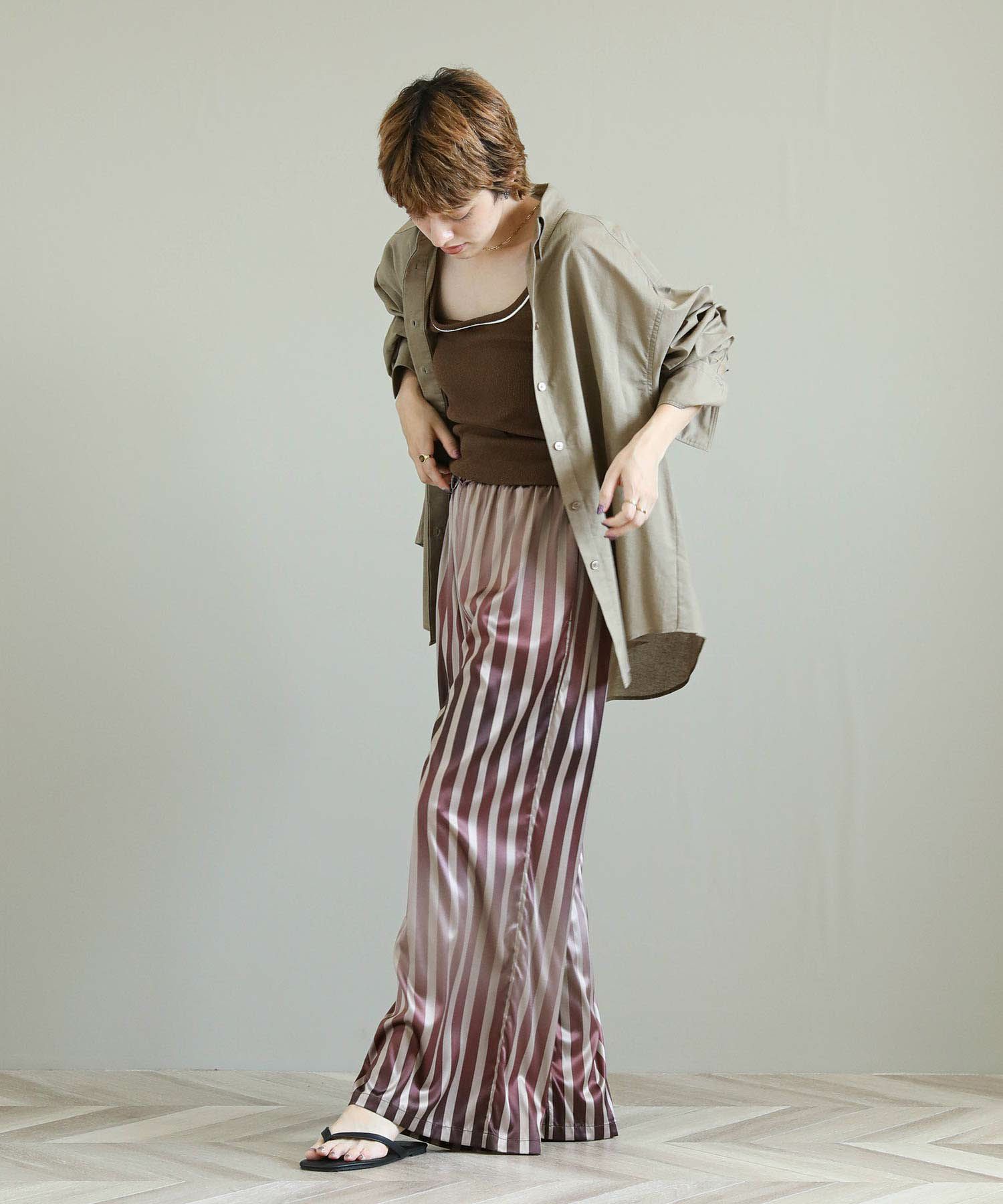 ストライプ柄がすっきりとした縦のラインを強調してくれます。柔らかくしなやかな素材感で脚のラインを自然に拾わないのも嬉しいポイント。上品な光沢感が際立ち女性らしい雰囲気を引き立ててくれます。着心地も良く、華やかなシーンにもデイリーにも使いやすい万能な生地感です。
