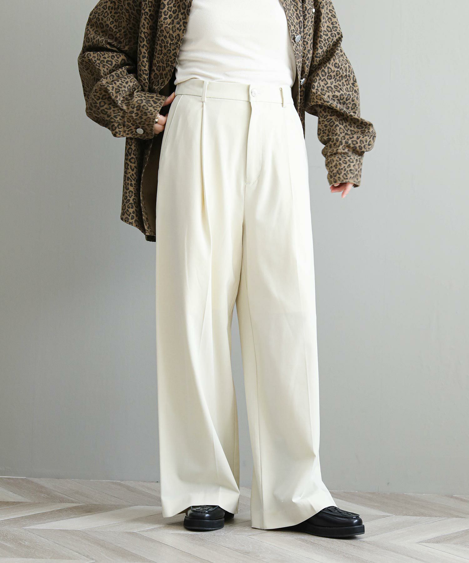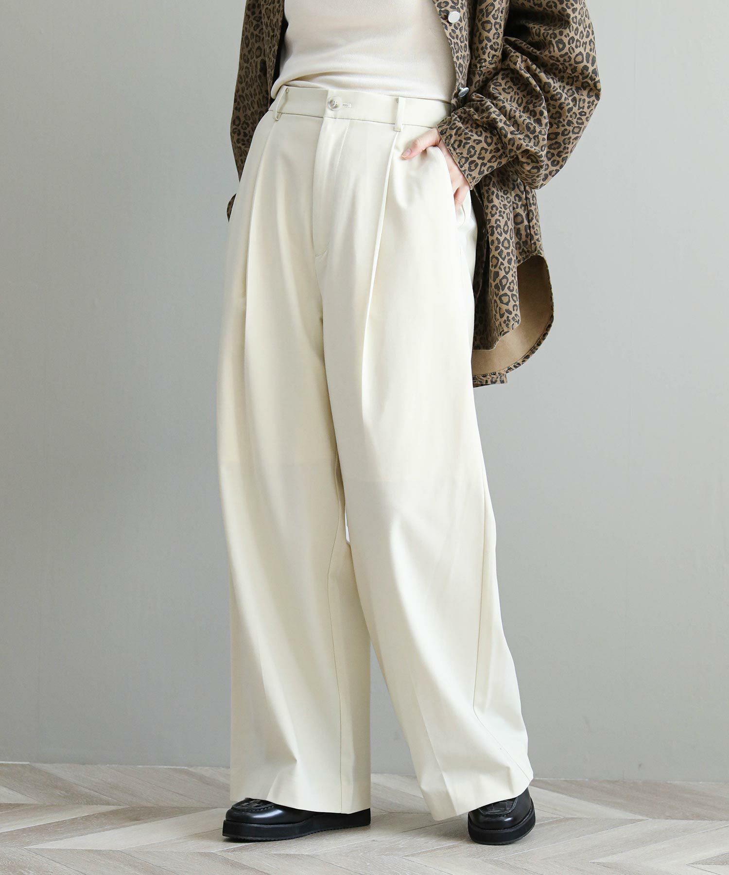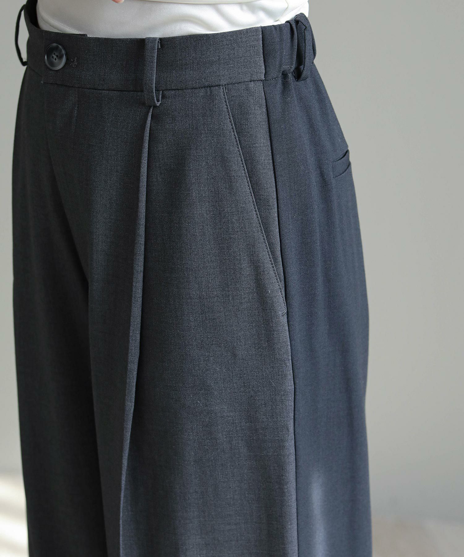 縦のラインが綺麗に出る足長効果◎のワイドパンツ。