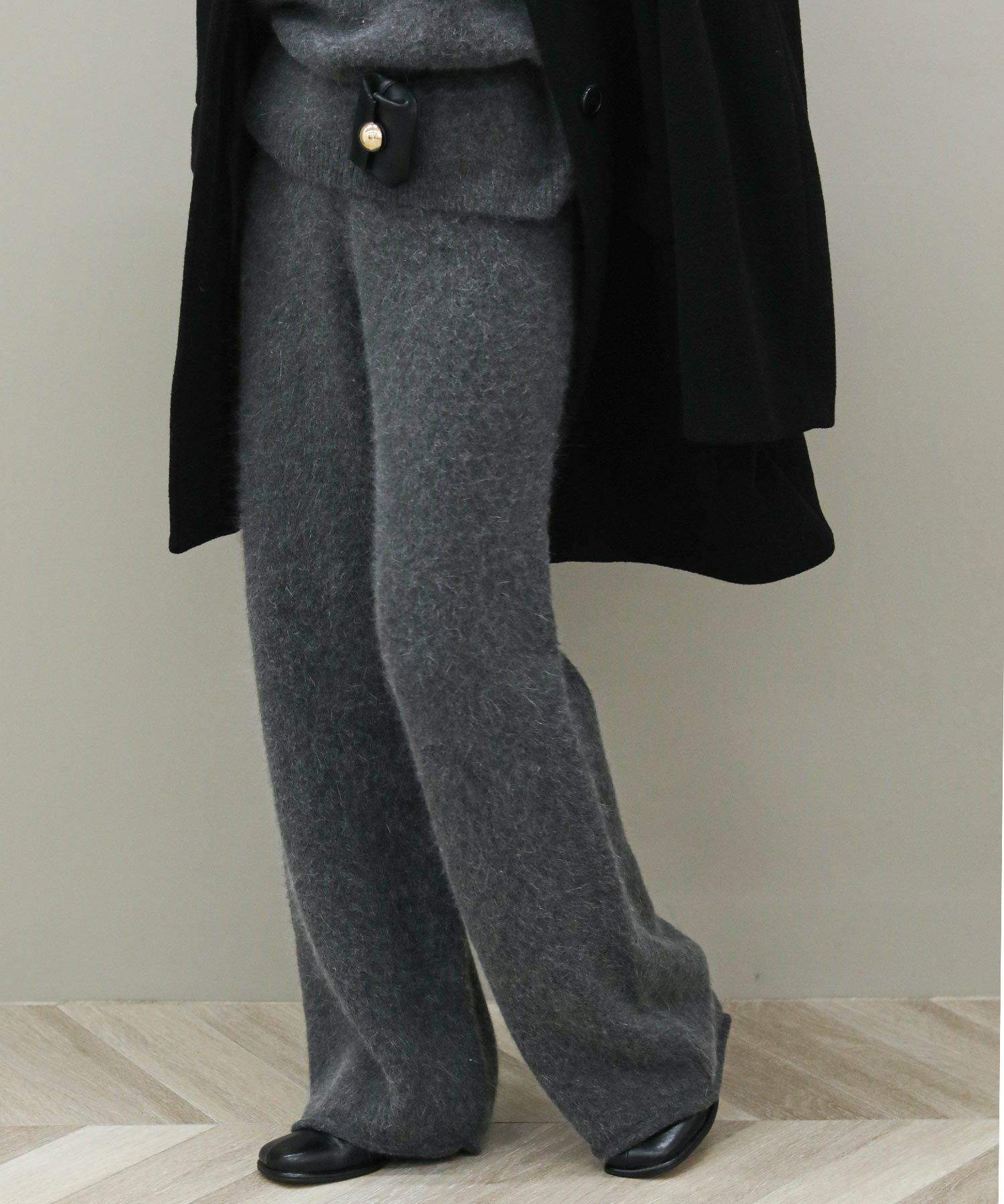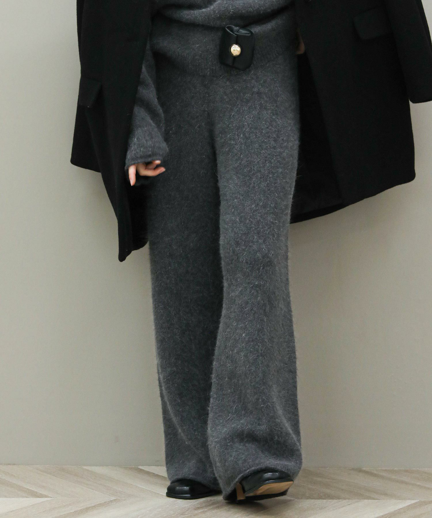 毛足の長いふんわりとしたニットのドロストパンツ。