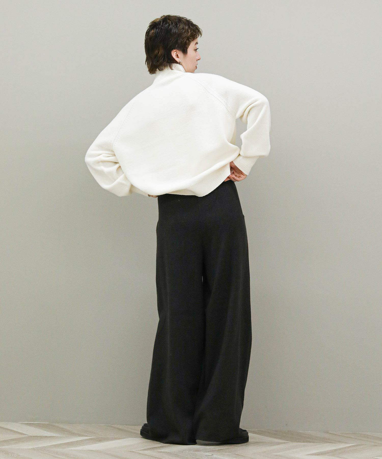 イージーな穿き心地も魅力です。ニットパンツですが、足のラインを拾わないゆったりとしたワイドシルエットなのでスタイルアップ効果も◎深みのあるチャコールグレーがカジュアルさを抑えます。トップスにニットを合わせても野暮ったくならないので幅広いスタイルをお楽しみいただけます。