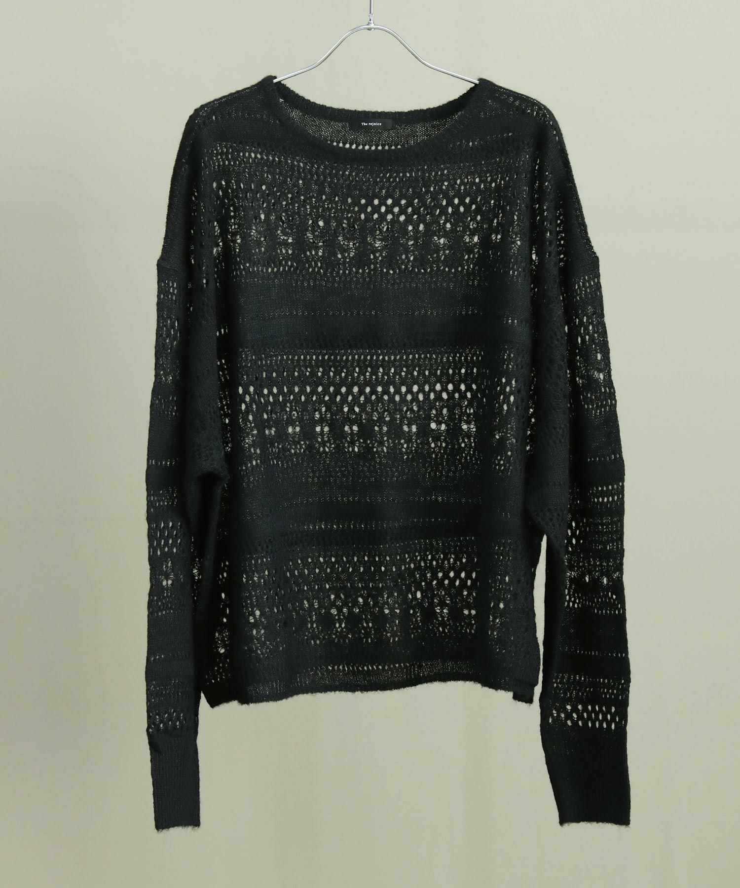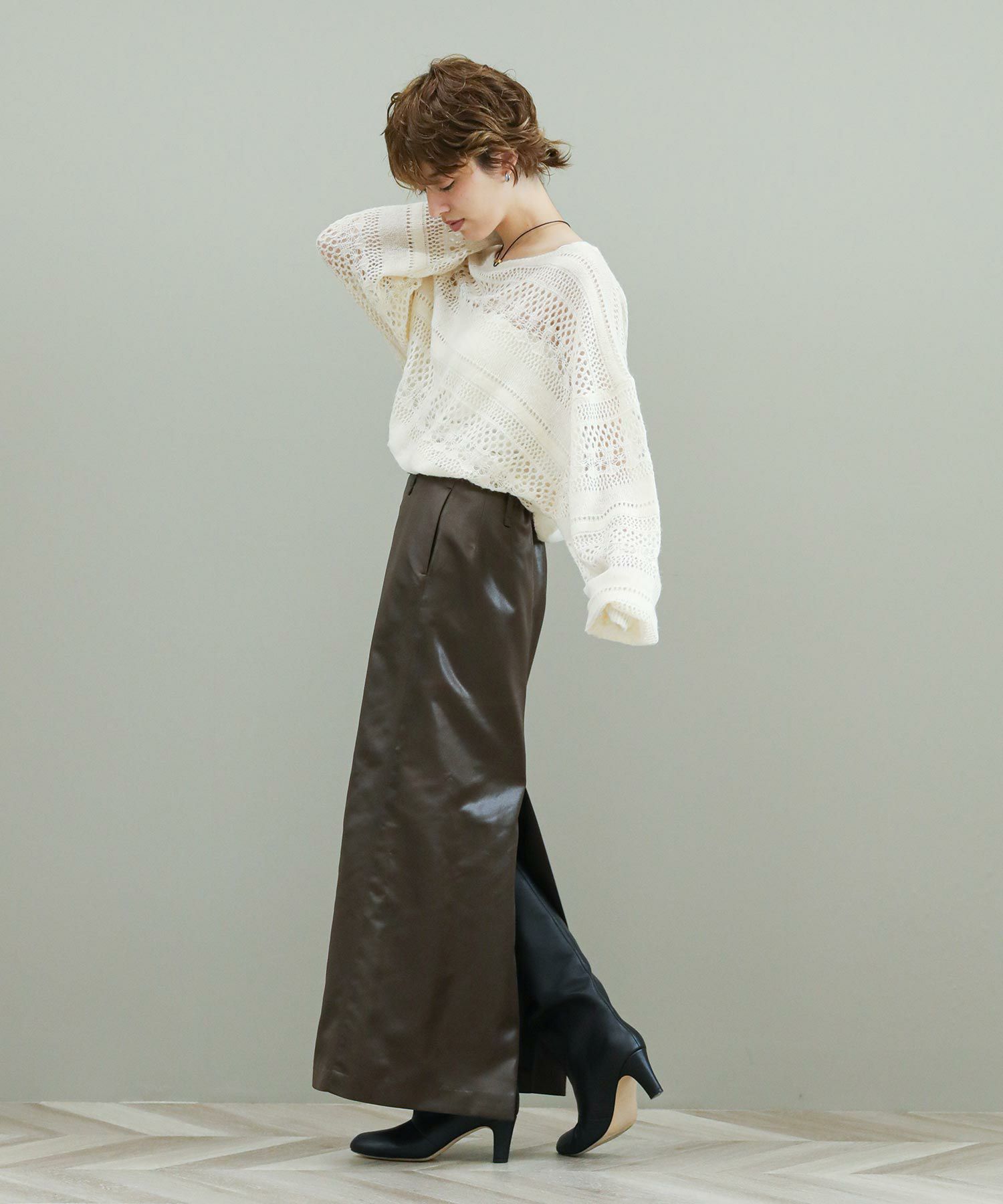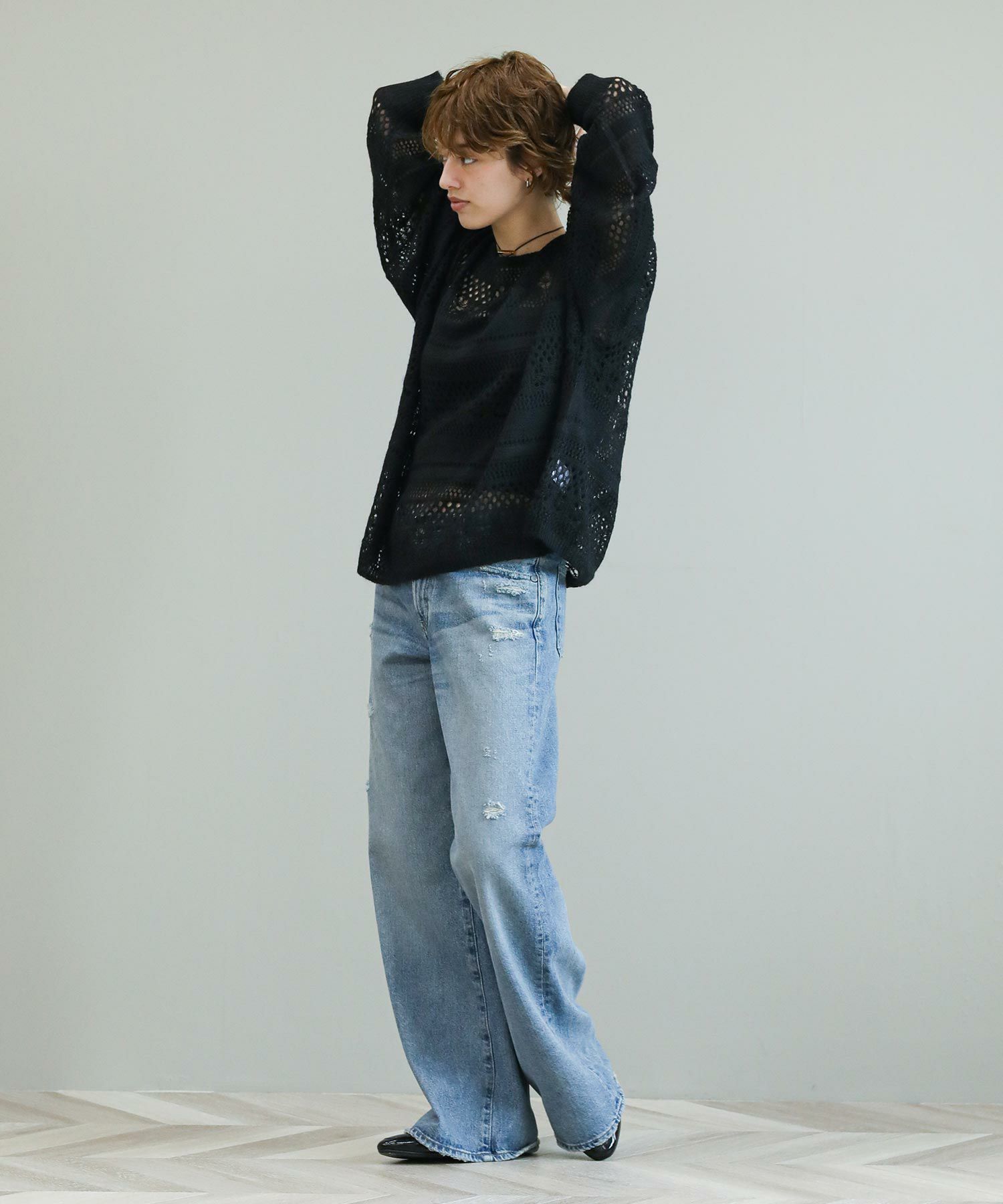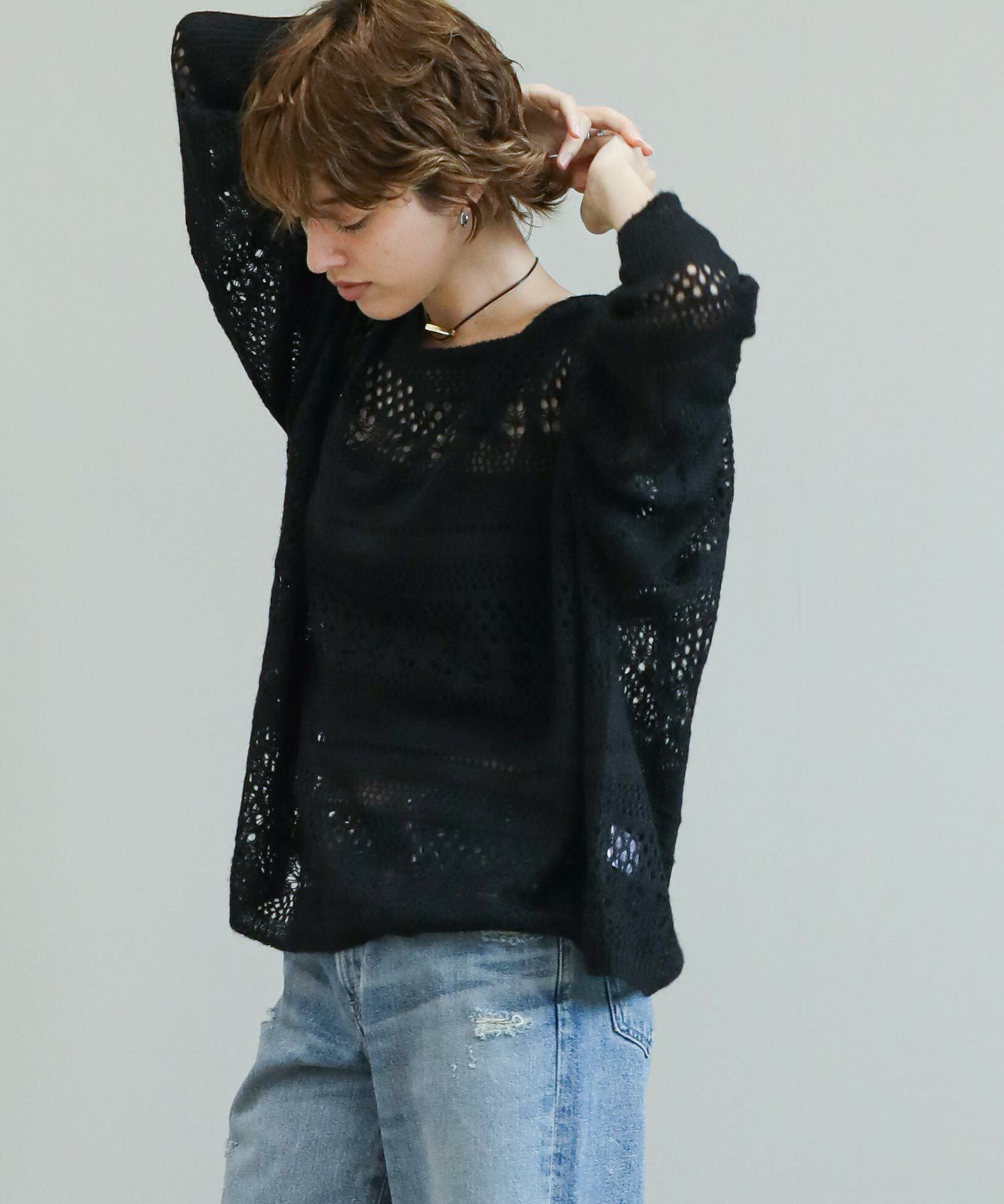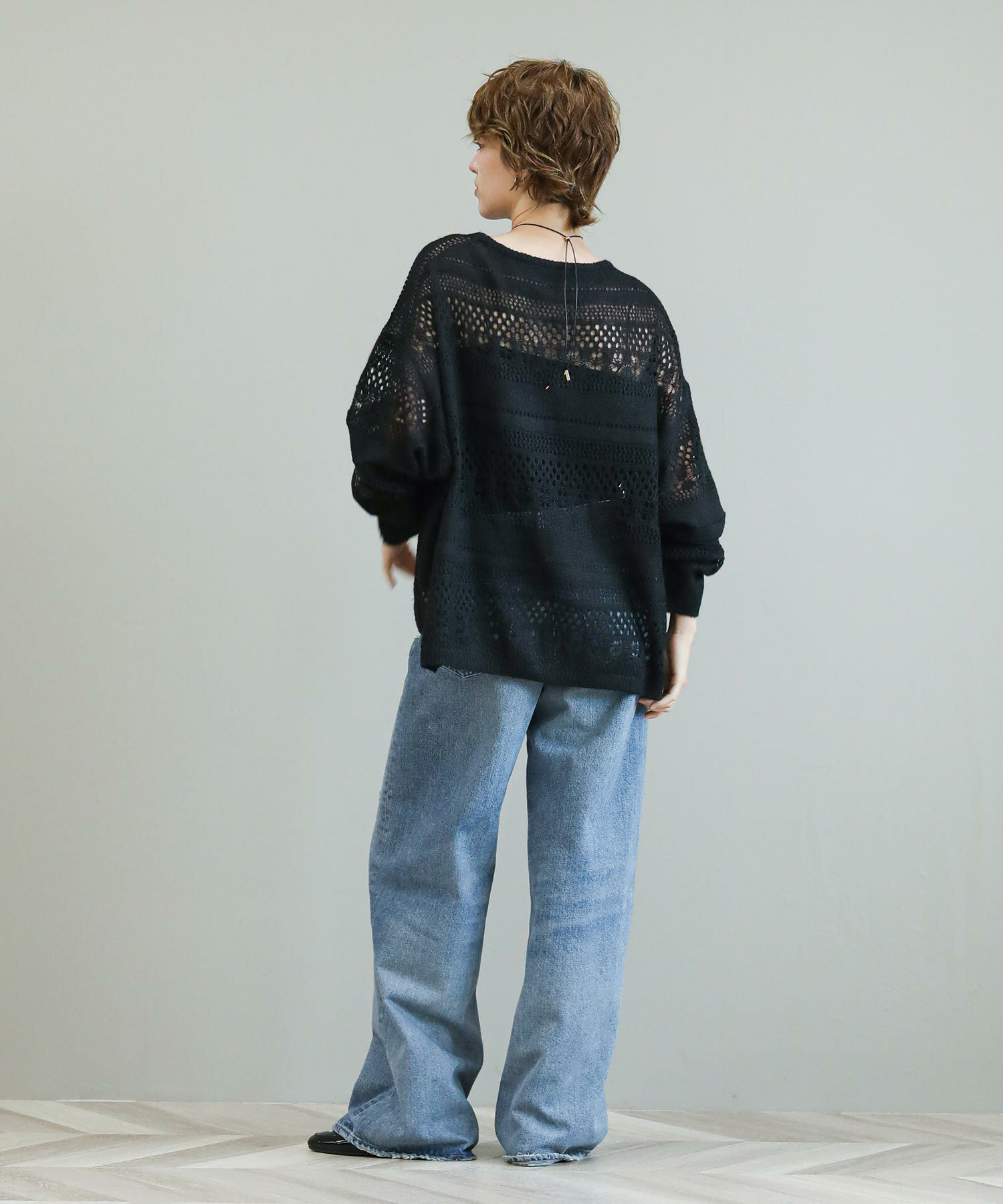 Tシャツやシャツとレイヤードスタイルを楽しめます。繊細なすかし柄が女性らしい雰囲気でデニムスウェットなどカジュアルボトムとも好相性。デコルテをきれいに見せてくれる衿の開きもポイントです。