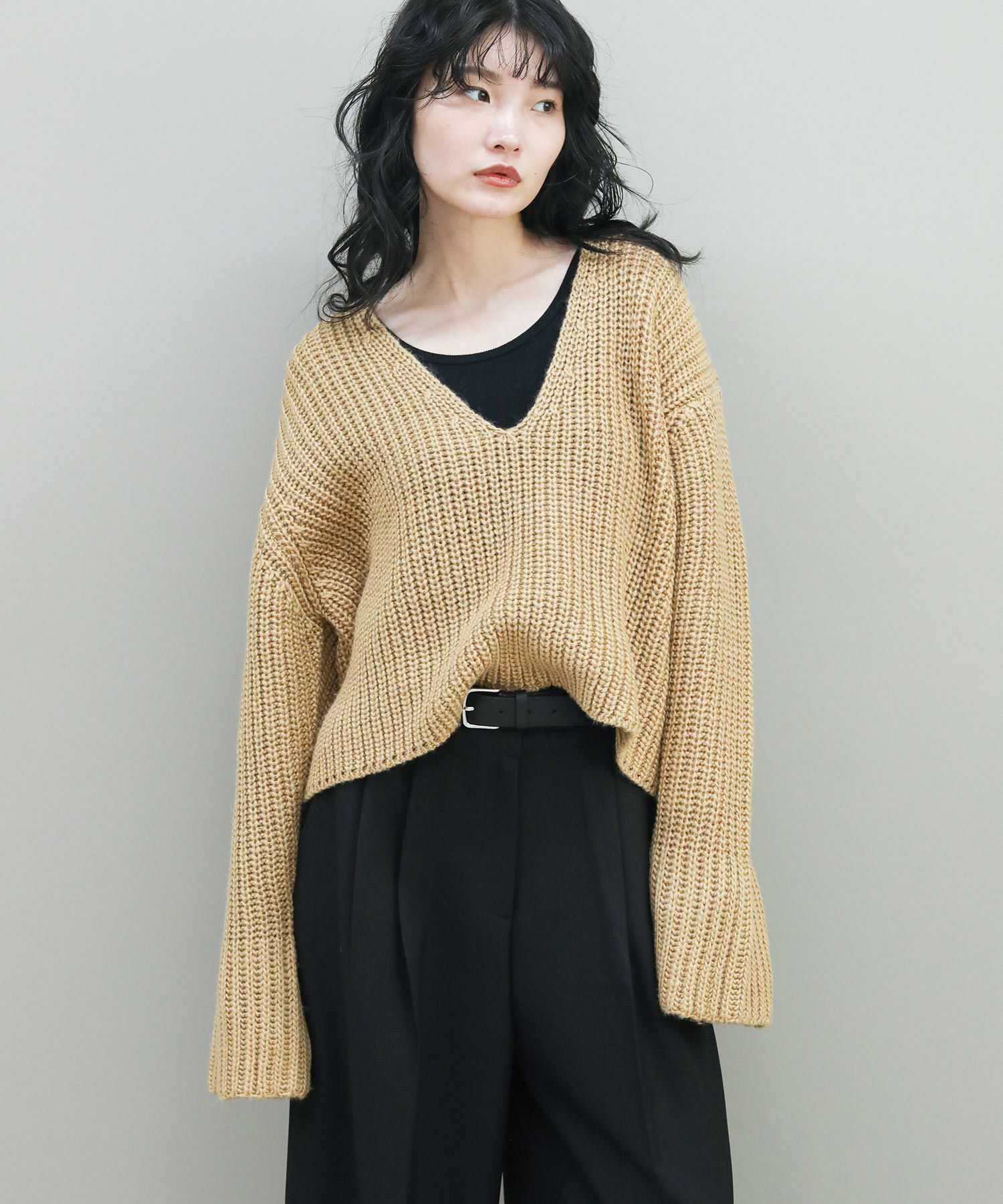 ベーシックな畦ニットですが、幅広の袖やネックラインでトレンド感を出しています。タートルネックやシャツとのレイヤードはもちろん、シンプルにロンTに重ねるだけでもサマになります。