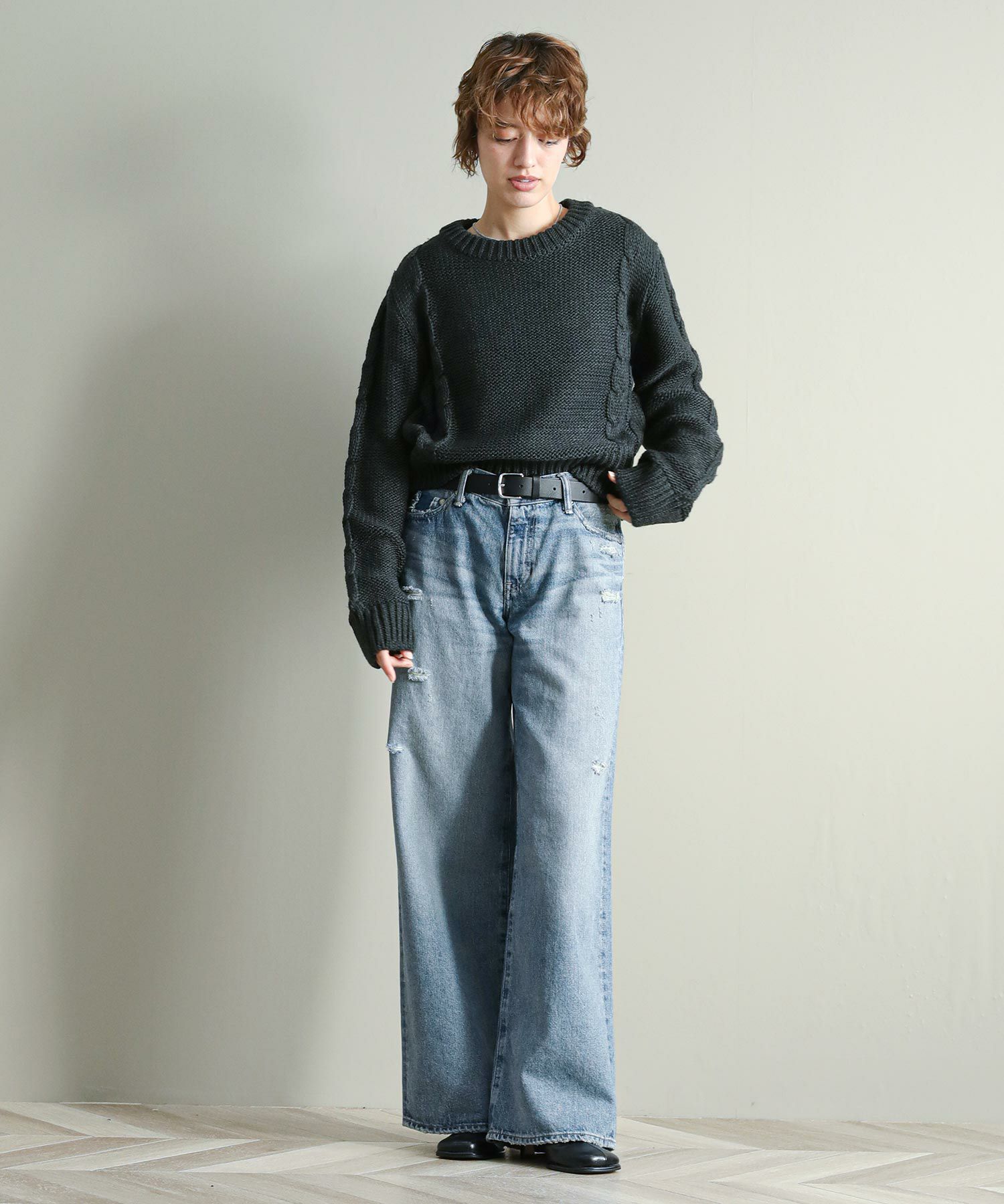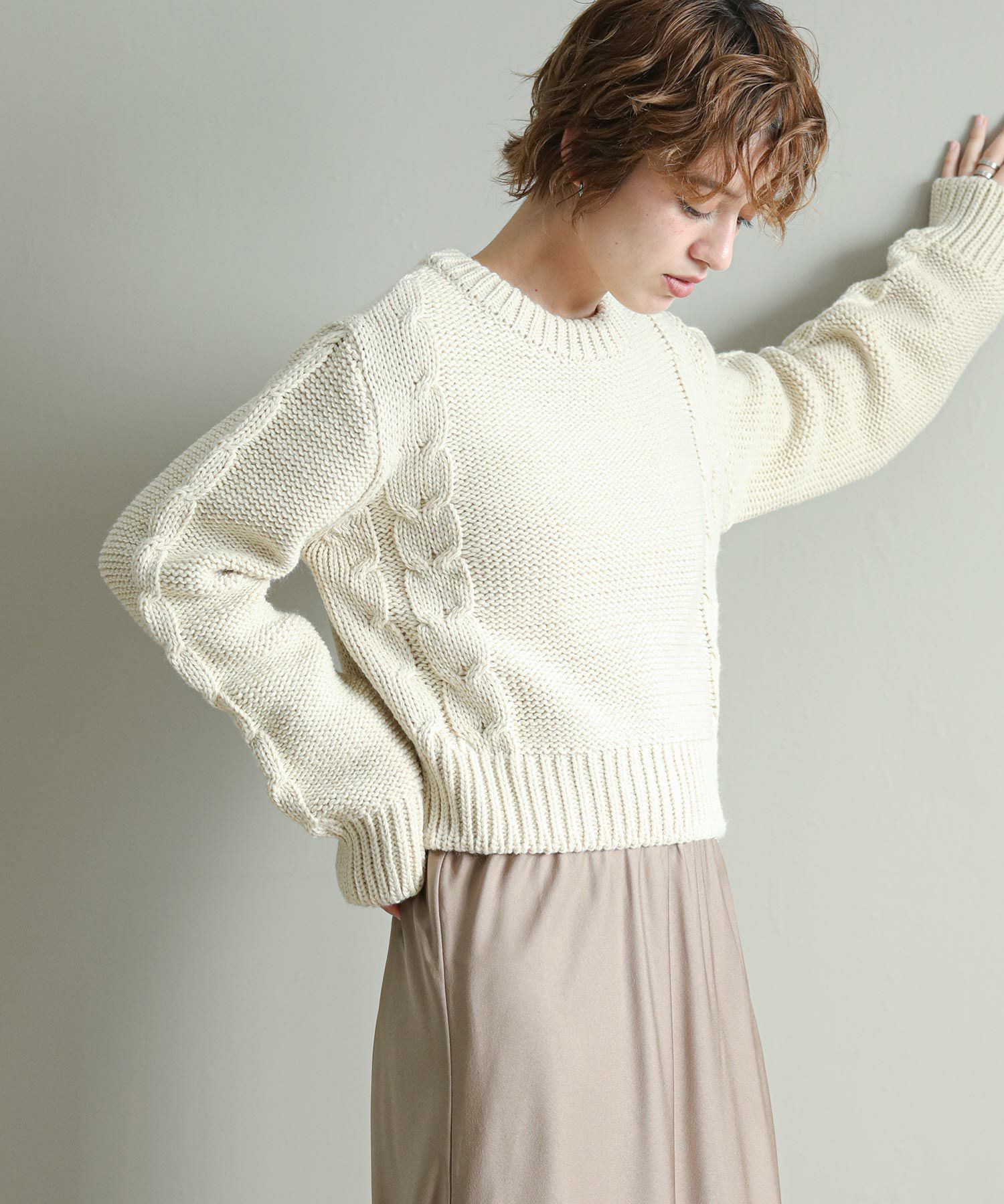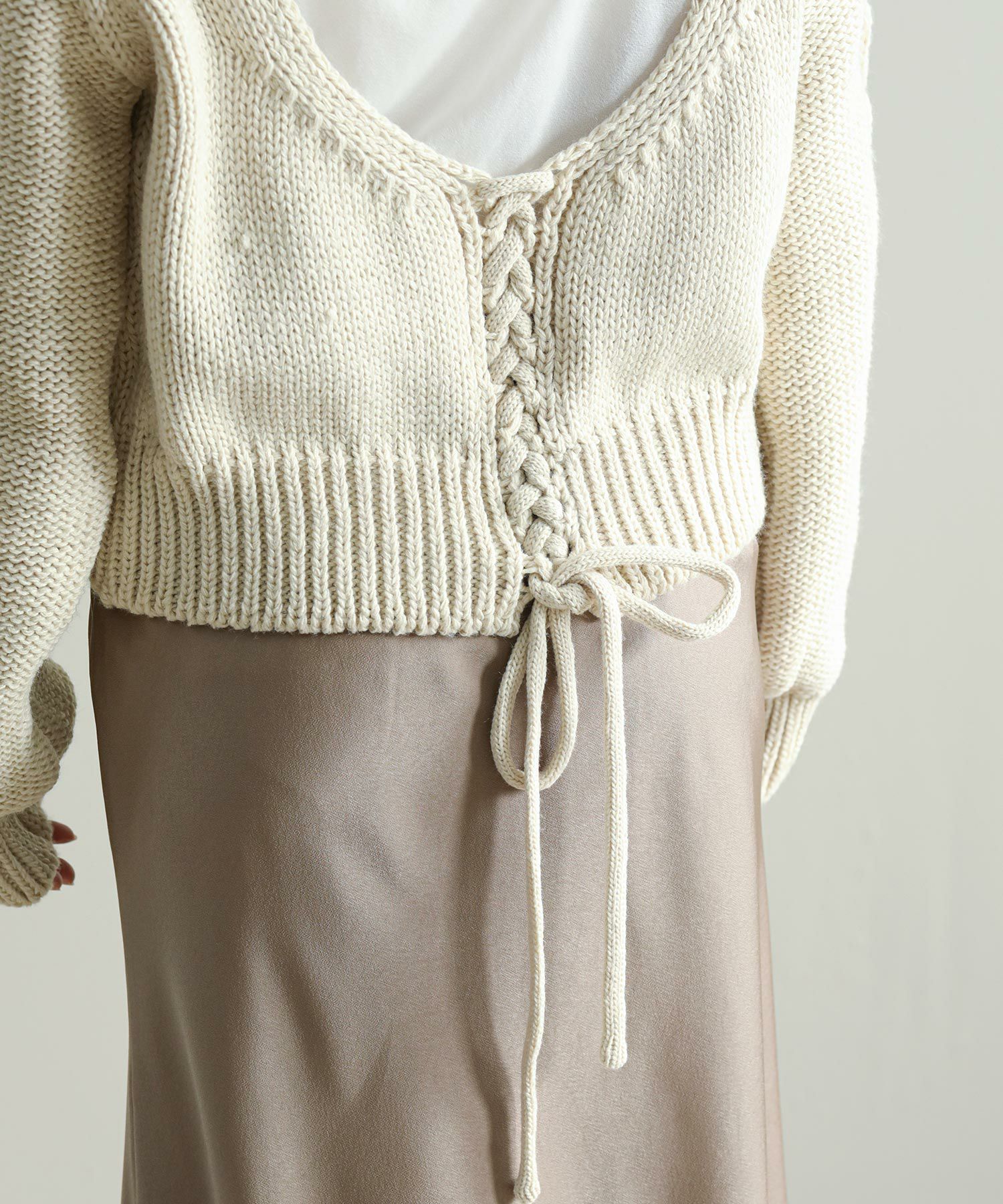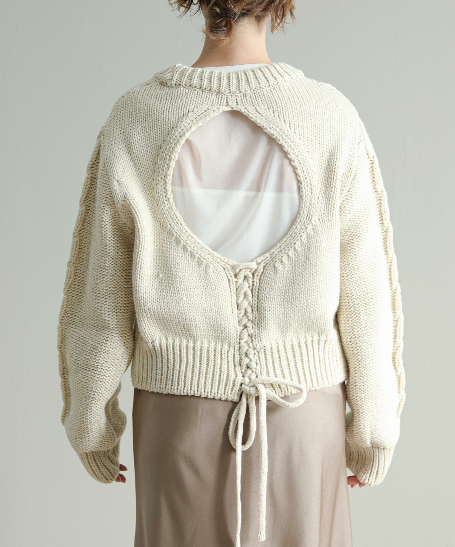 背中の開きとレースアップのリボンがポイントに。シンプルなボトムと合わせてもサマになります。袖のケーブルのさりげないアクセントに。タートネックやシャツはもちろん、シアーのインナーをレイヤードするのもおしゃれ感アップ◎